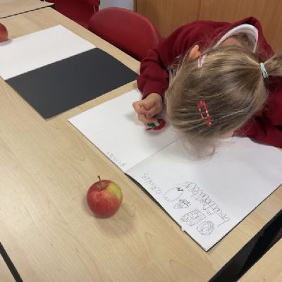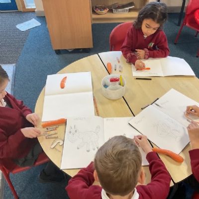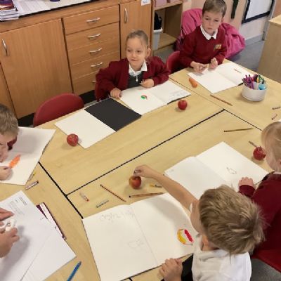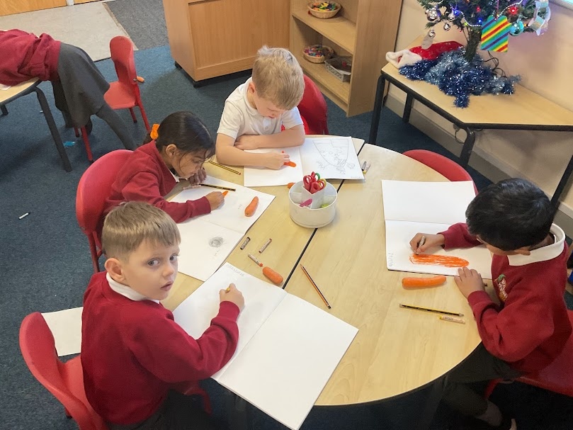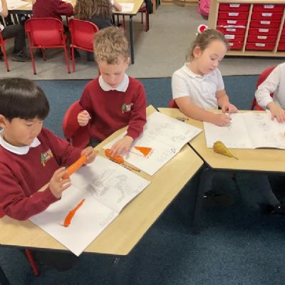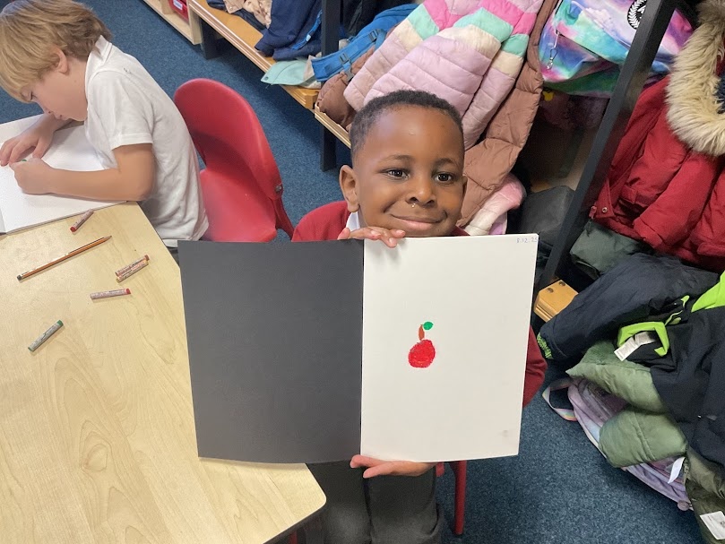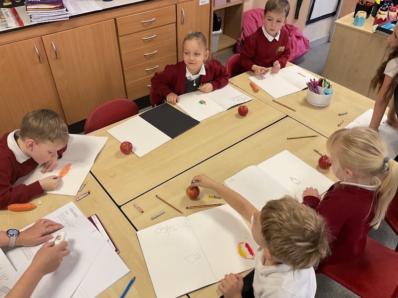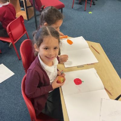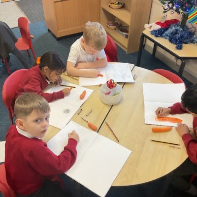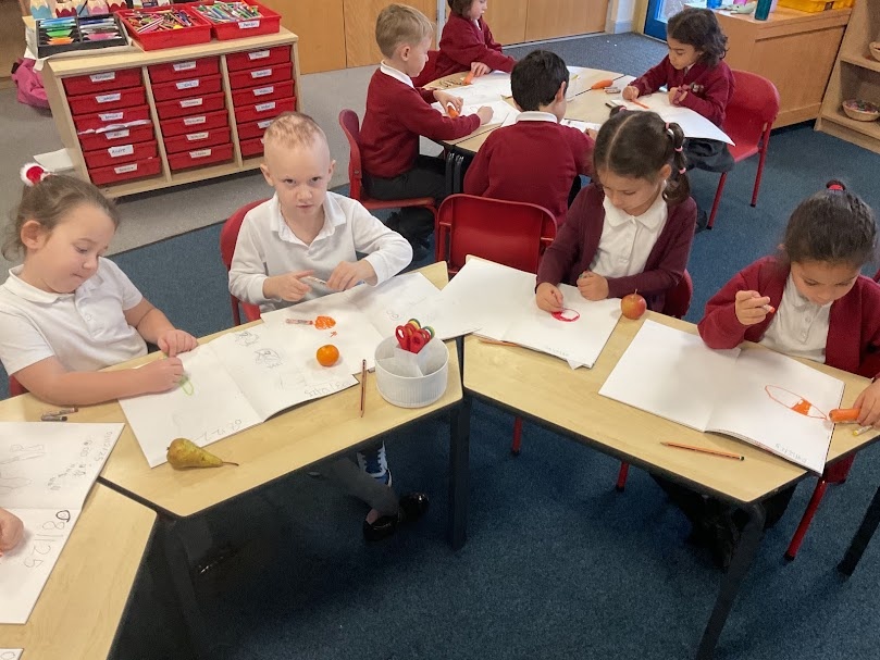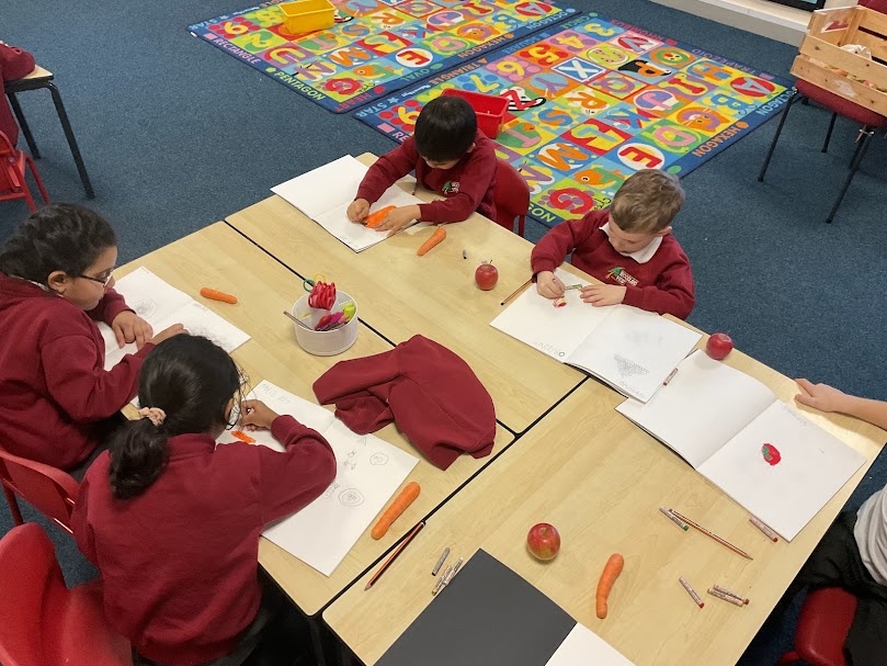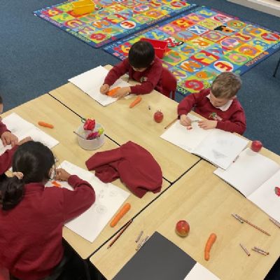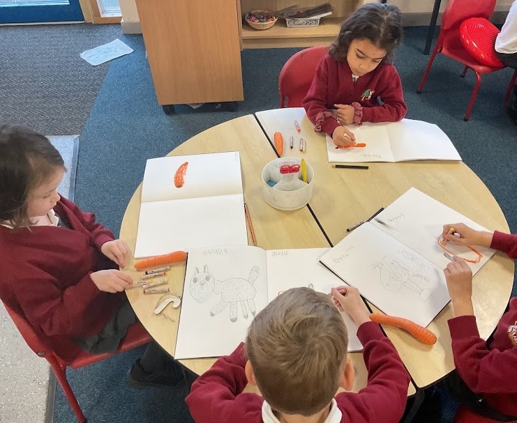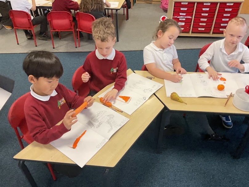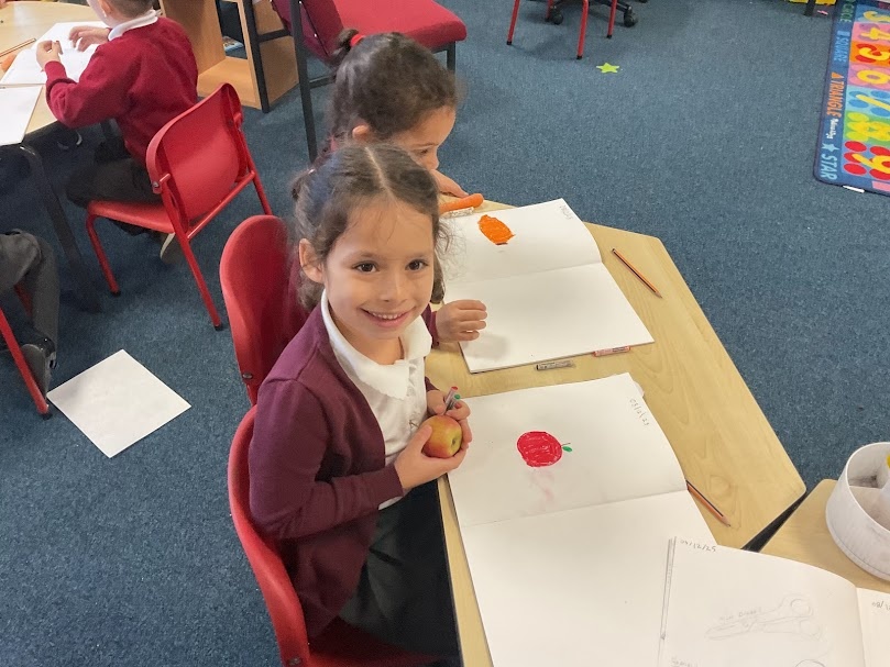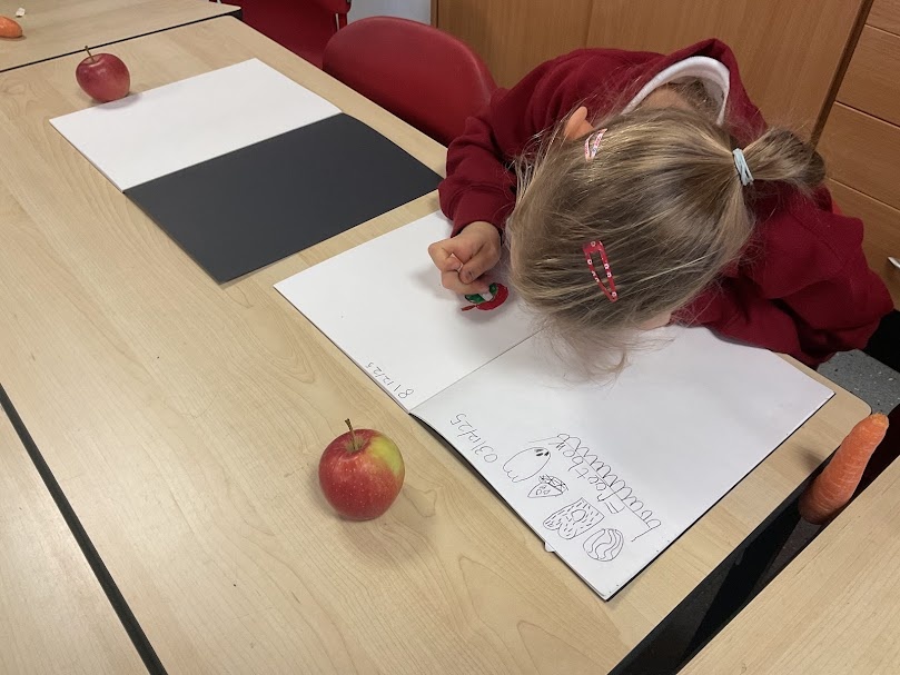 Today we explored observational drawing using oil pastels. The children chose a fruit or vegetable and were encouraged to look closely at its colours, patterns, shapes and textures before creating their own detailed drawing. We ended with a class gallery, where everyone enjoyed admiring each other’s work and sharing what they liked.