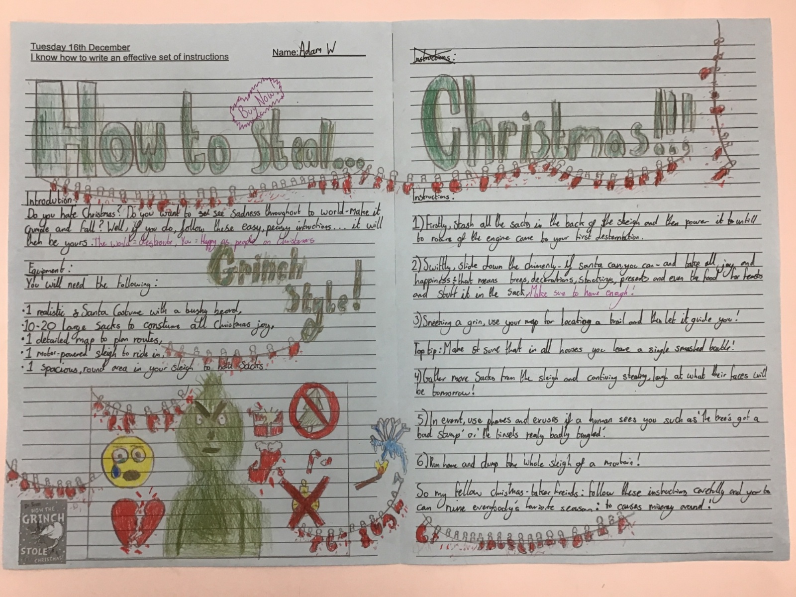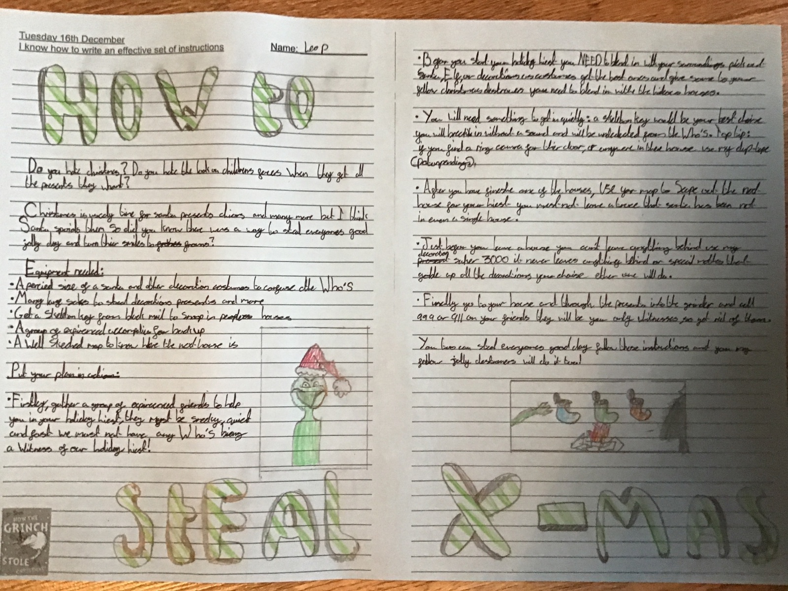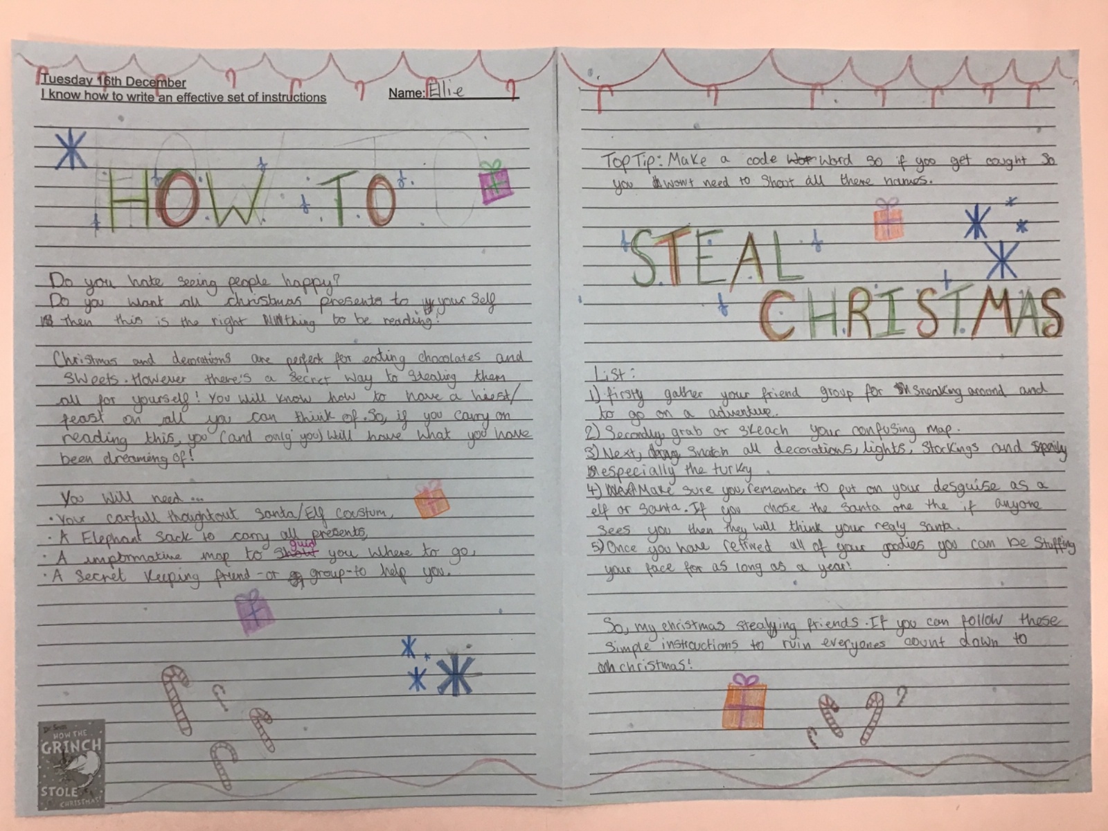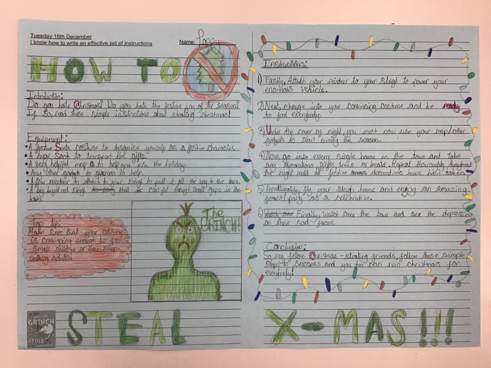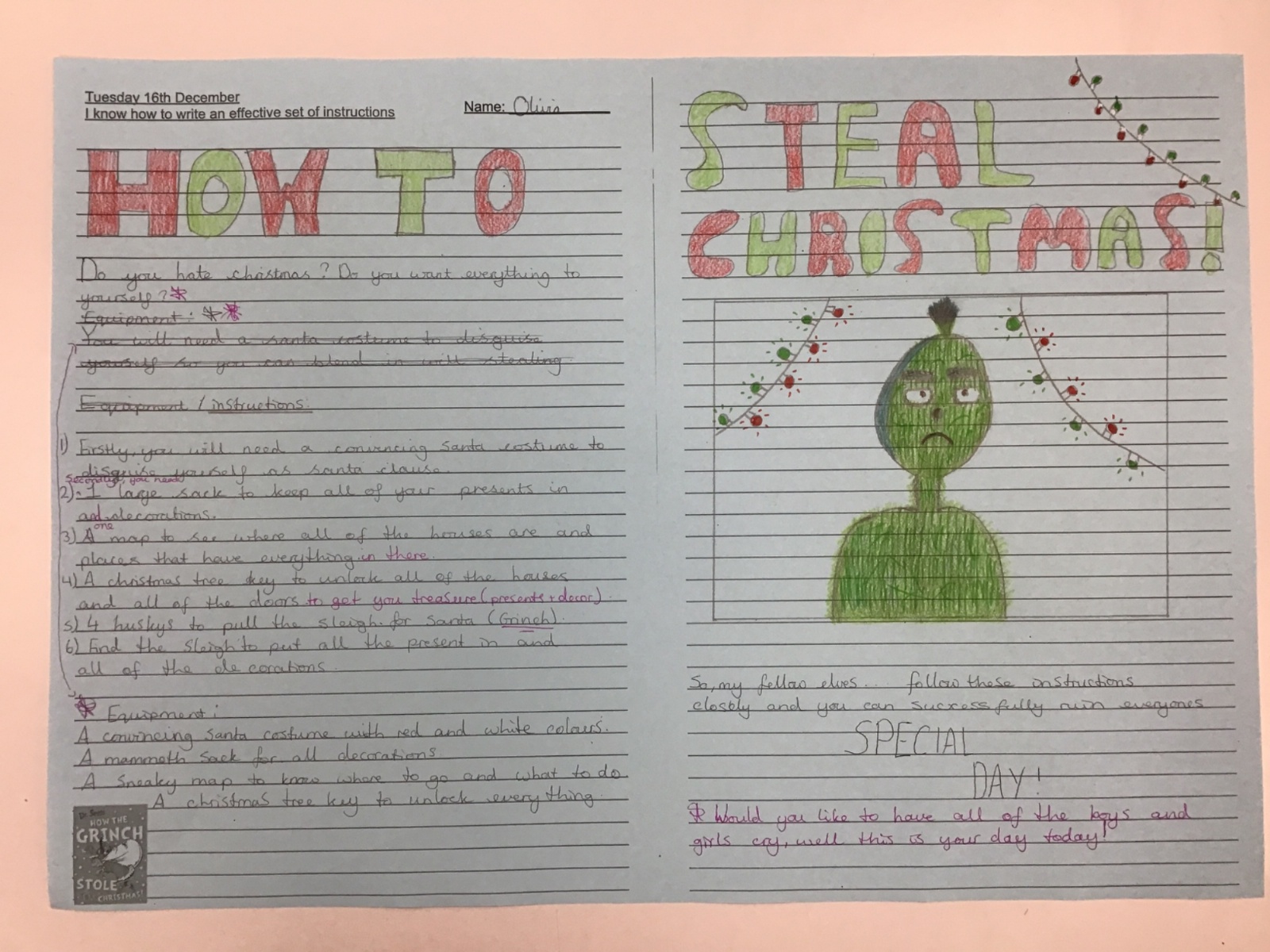 To complete a unit of work studying instructions, we focused on 'How the Grinch stole Christmas' by Dr Seuss. We have read the story, watched some snippets from both films and then created our own set of instructions as if we were the Grinch trying to explain to someone else how to steal Christmas. Today, we completed this as our 'blue write'. We dimmed the lights, got out the candles, had festive music playing and a roaring Christmas fire on the screen and have presented our instructions to really showcase our writing! Enjoy our festive instructions!