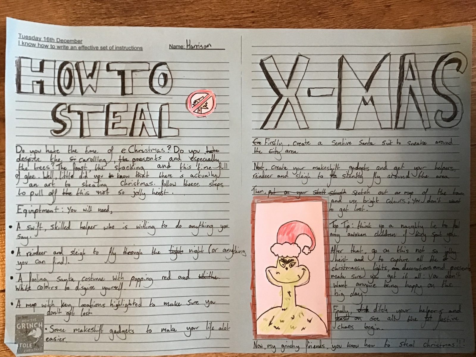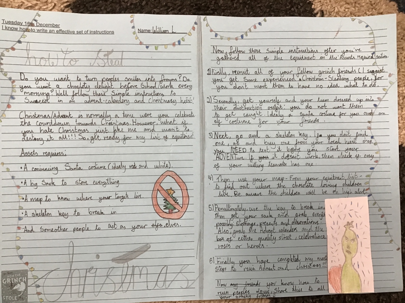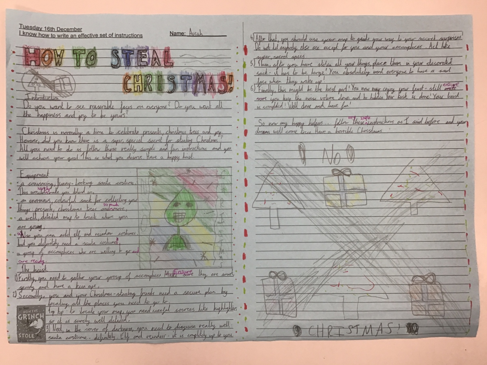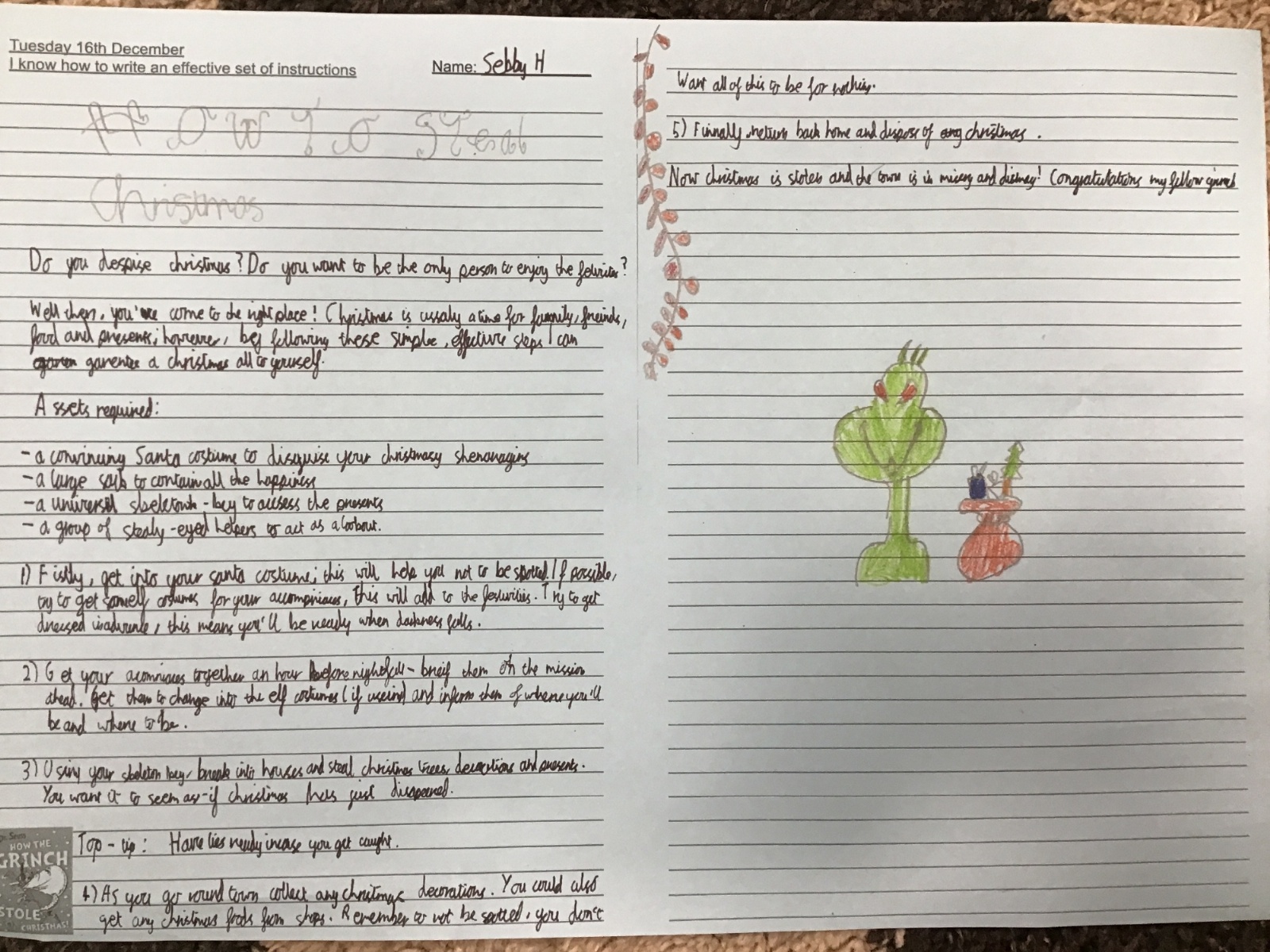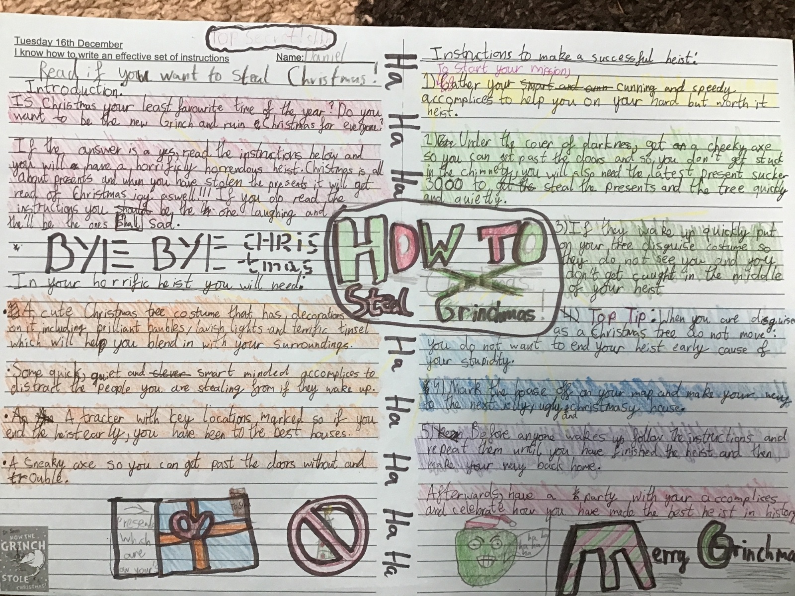 To complete a unit of work studying instructions, we focused on 'How the Grinch stole Christmas' by Dr Seuss. We have read the story, watched some snippets from both films and then created our own set of instructions as if we were the Grinch trying to explain to someone else how to steal Christmas. Today, we completed this as our 'blue write'. We dimmed the lights, got out the candles, had festive music playing and a roaring Christmas fire on the screen and have presented our instructions to really showcase our writing! Enjoy our festive instructions!