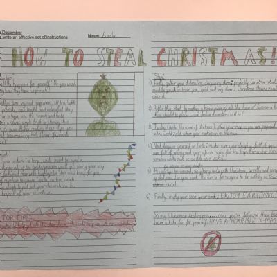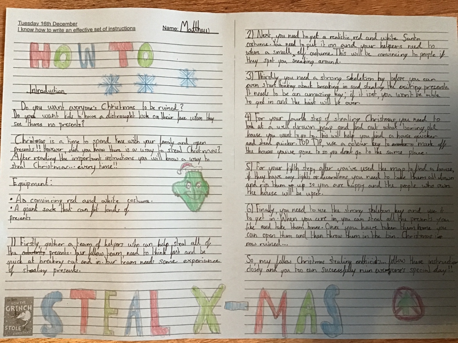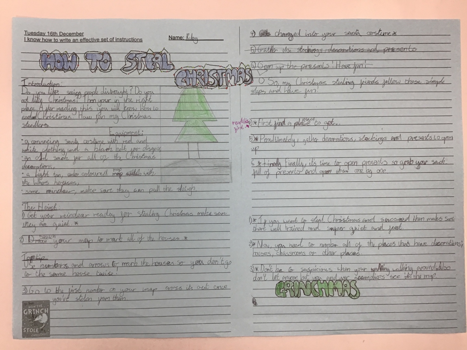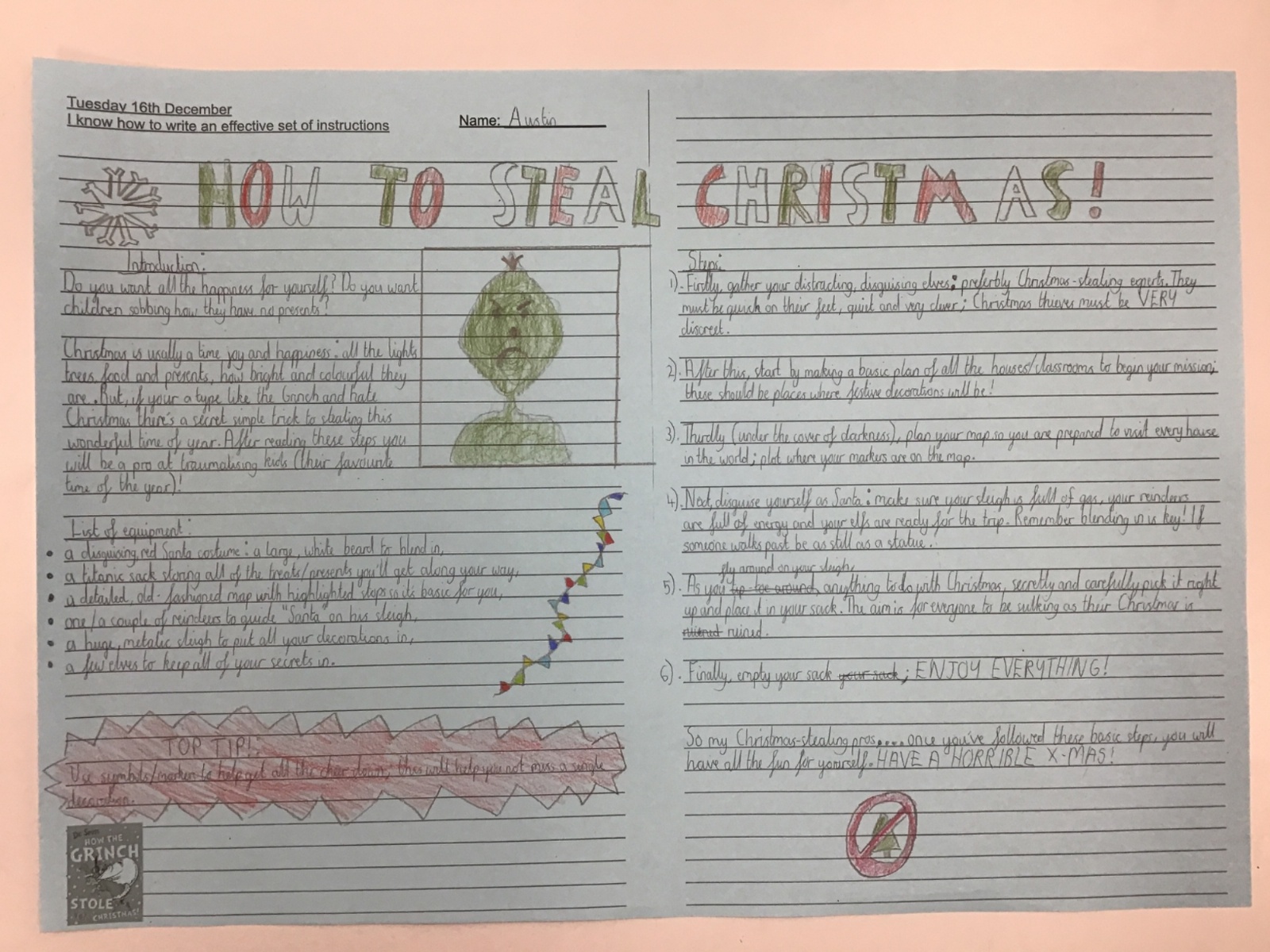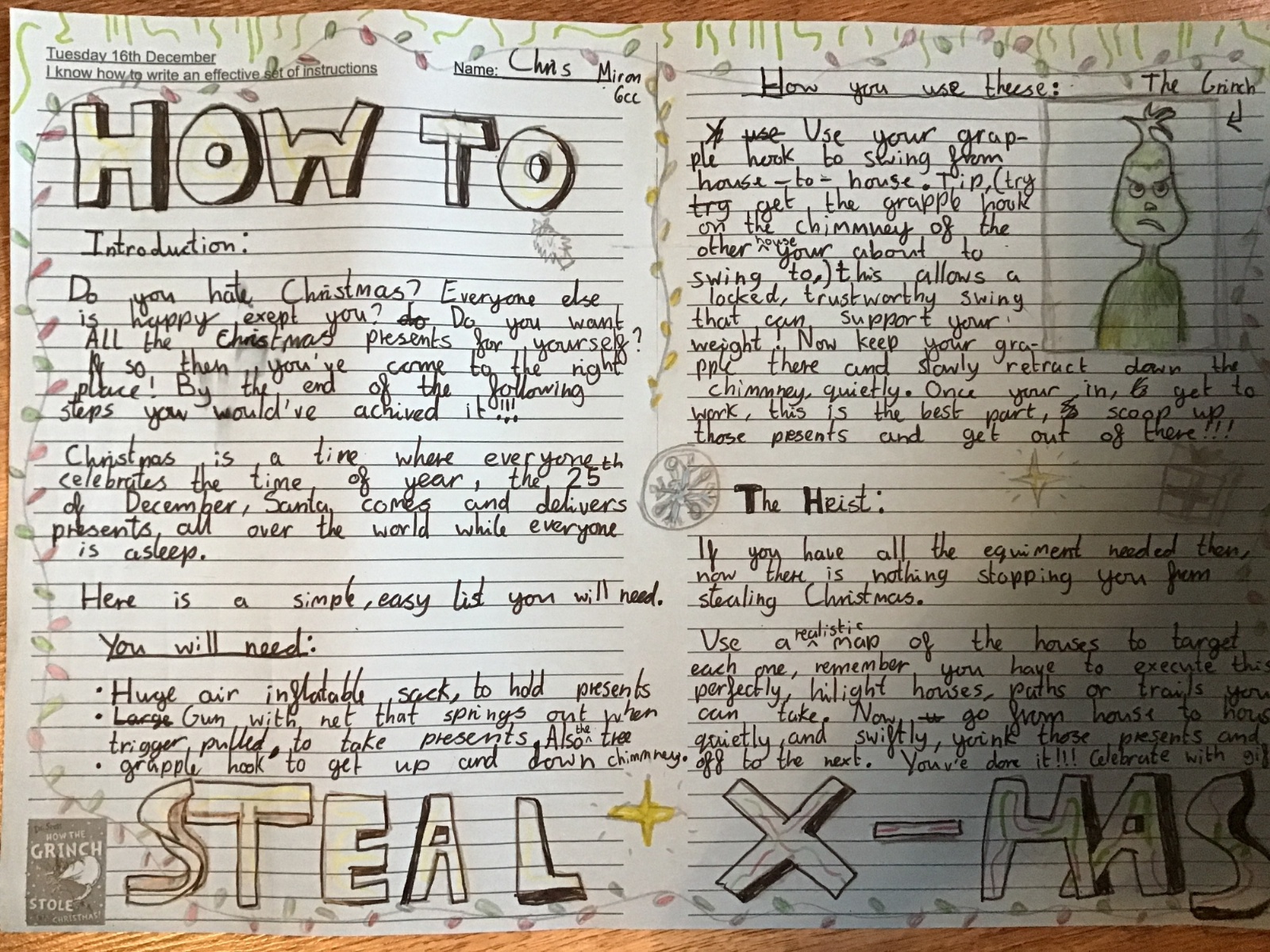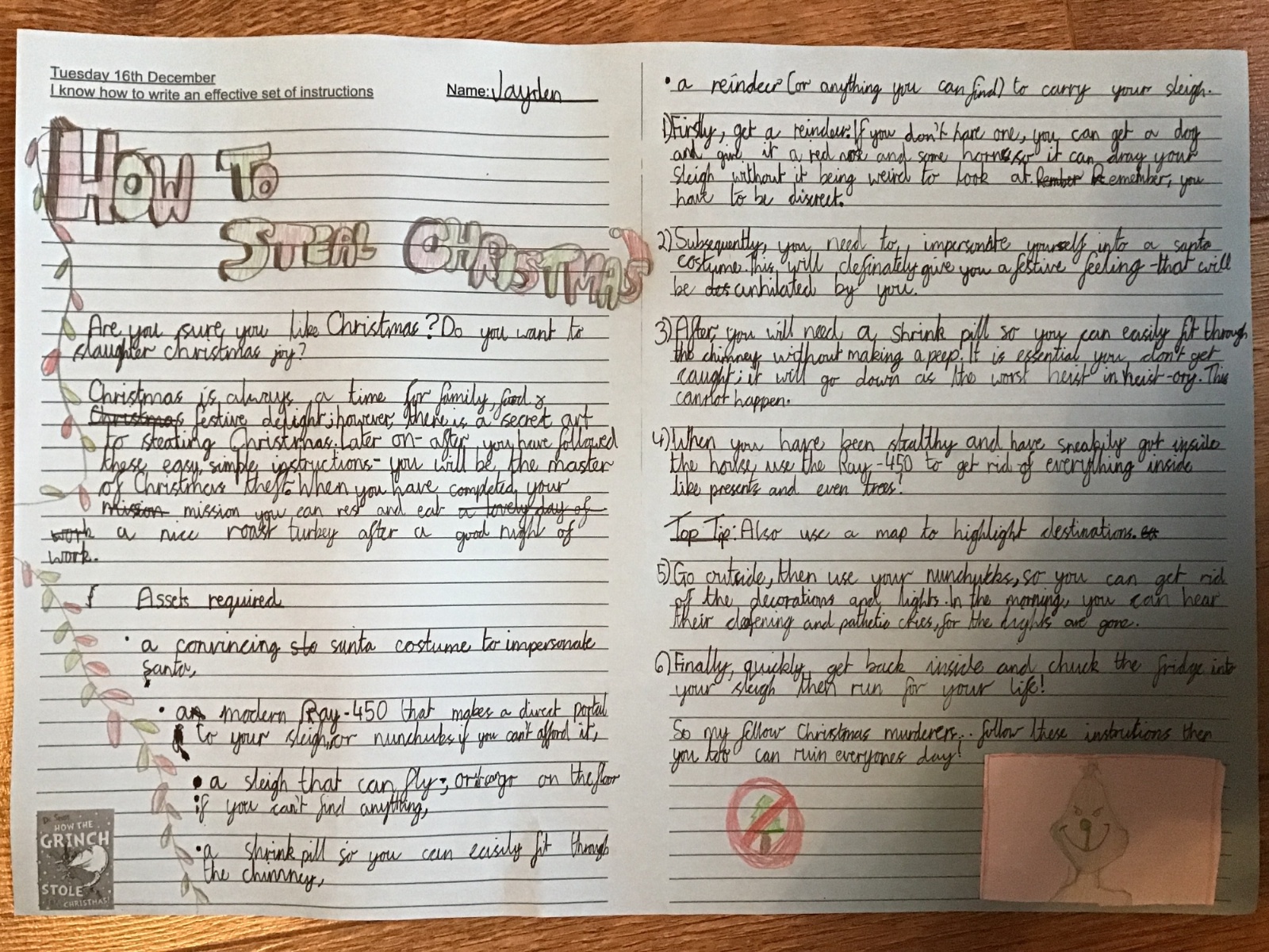 To complete a unit of work studying instructions, we focused on 'How the Grinch stole Christmas' by Dr Seuss. We have read the story, watched some snippets from both films and then created our own set of instructions as if we were the Grinch trying to explain to someone else how to steal Christmas. Today, we completed this as our 'blue write'. We dimmed the lights, got out the candles, had festive music playing and a roaring Christmas fire on the screen and have presented our instructions to really showcase our writing! Enjoy our festive instructions!