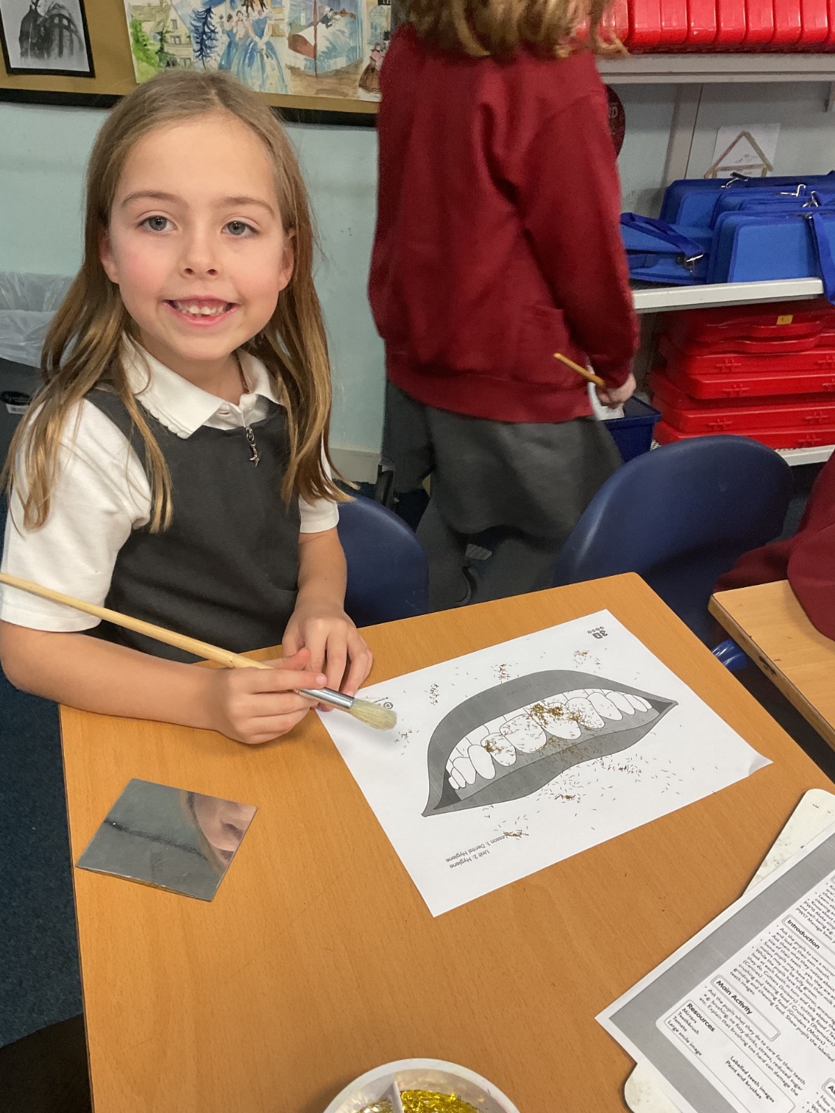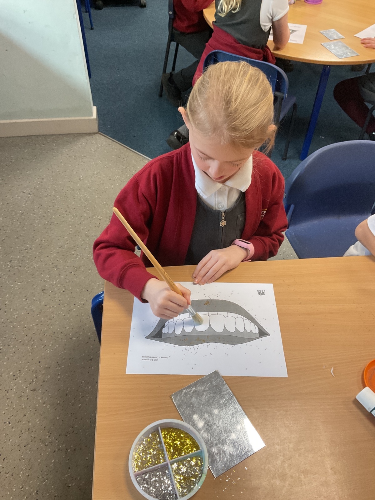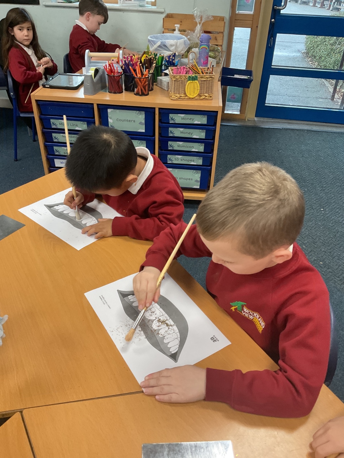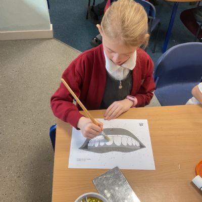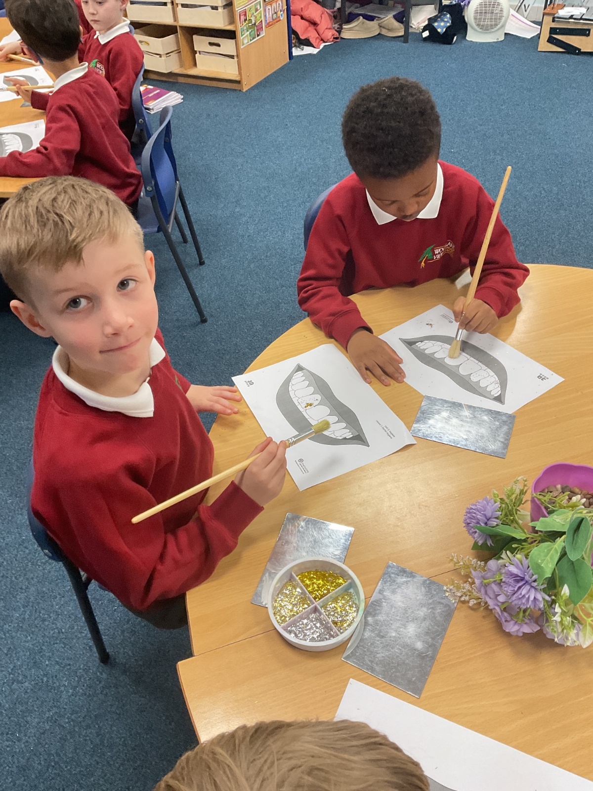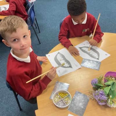 To practise this, the children took part in a fun activity using pretend teeth covered in glitter. They carefully brushed the glitter away using small circular movements, just like they should when brushing their real teeth at home.