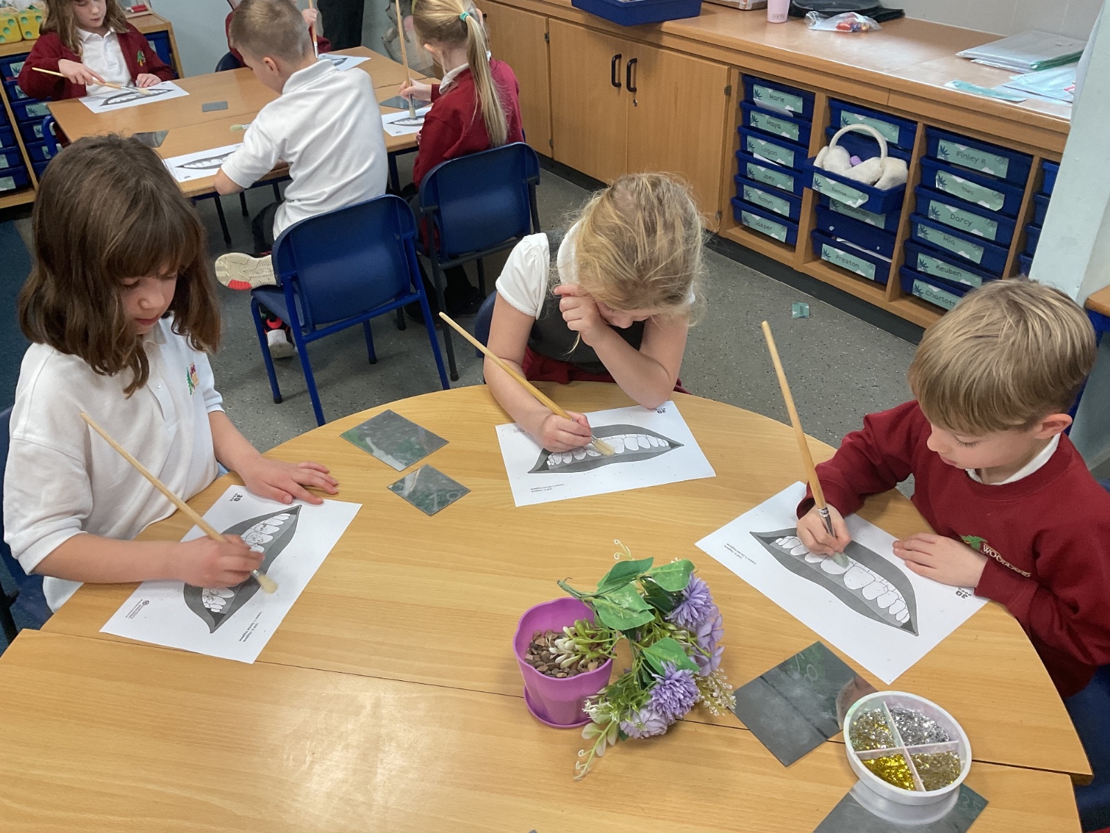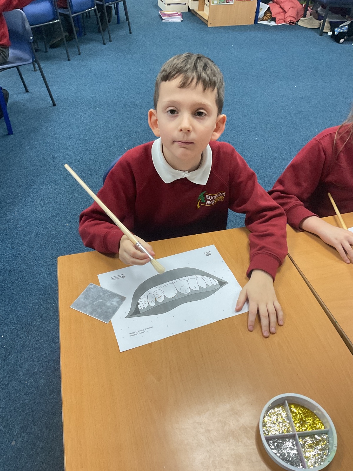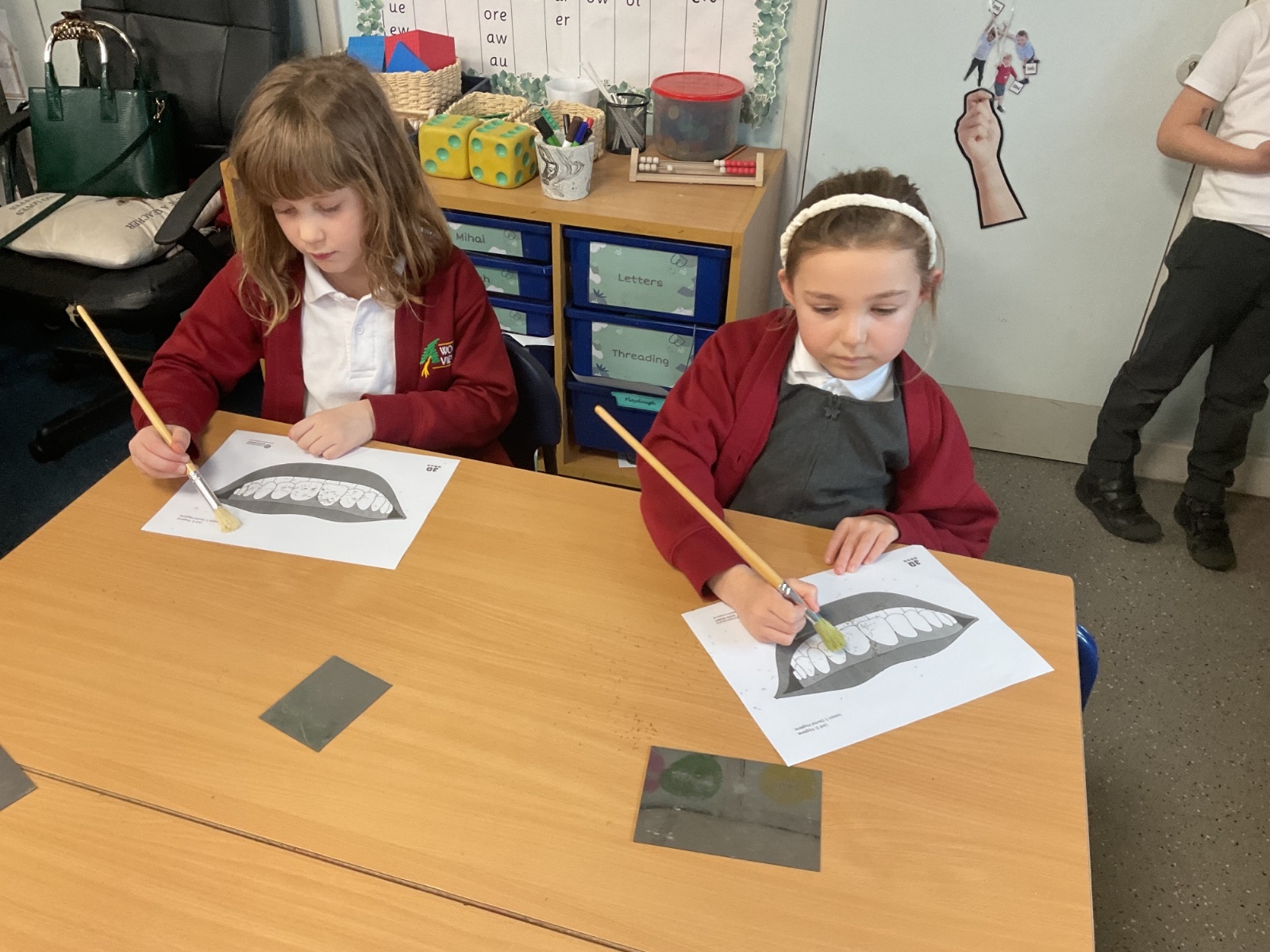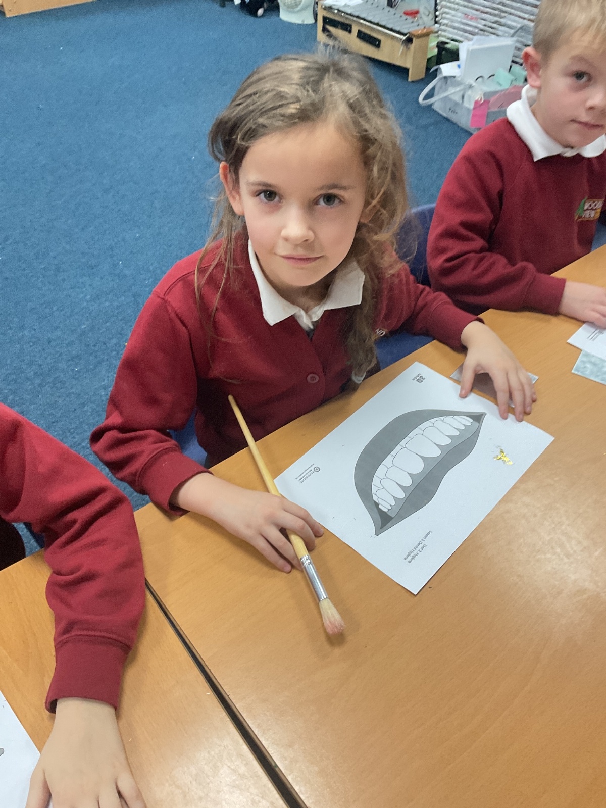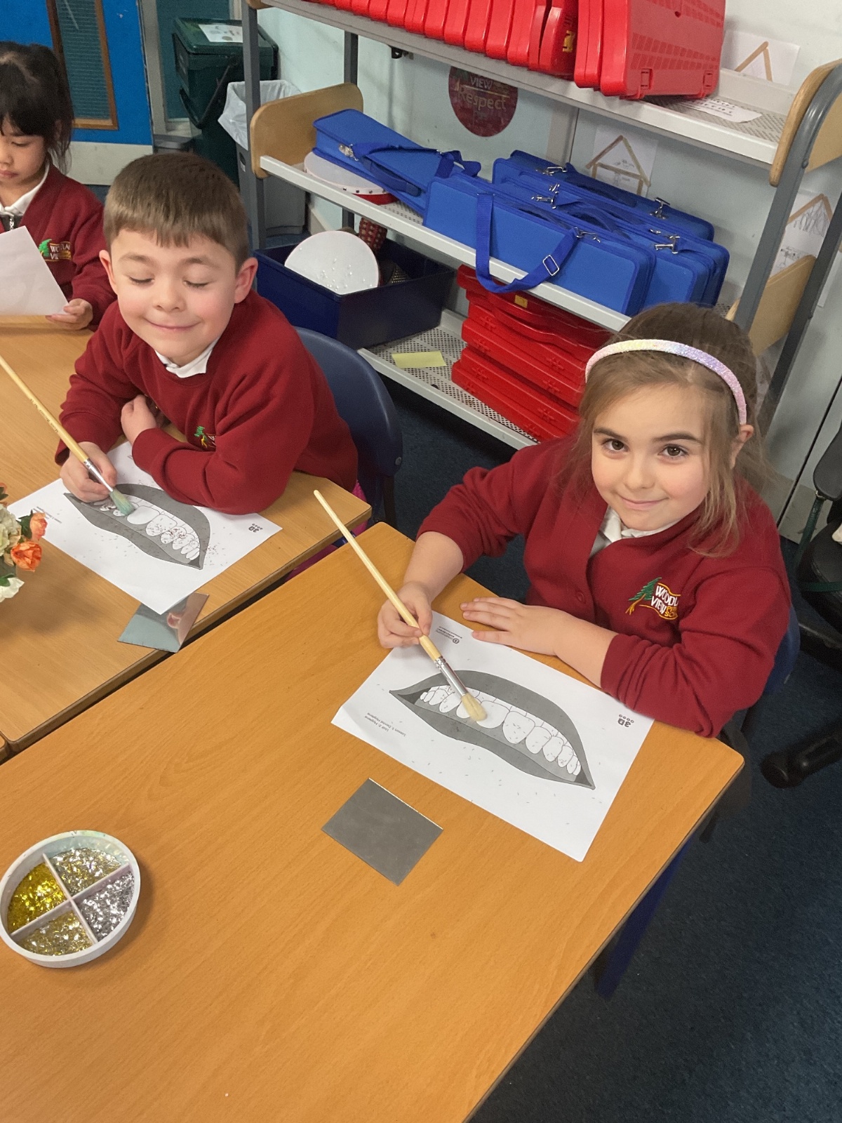 To practise this, the children took part in a fun activity using pretend teeth covered in glitter. They carefully brushed the glitter away using small circular movements, just like they should when brushing their real teeth at home.