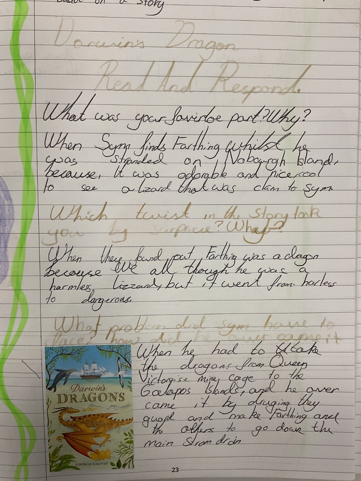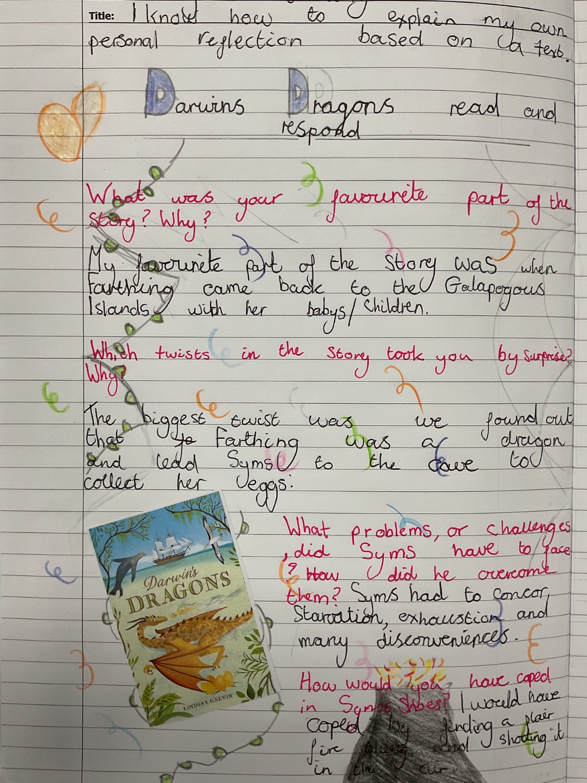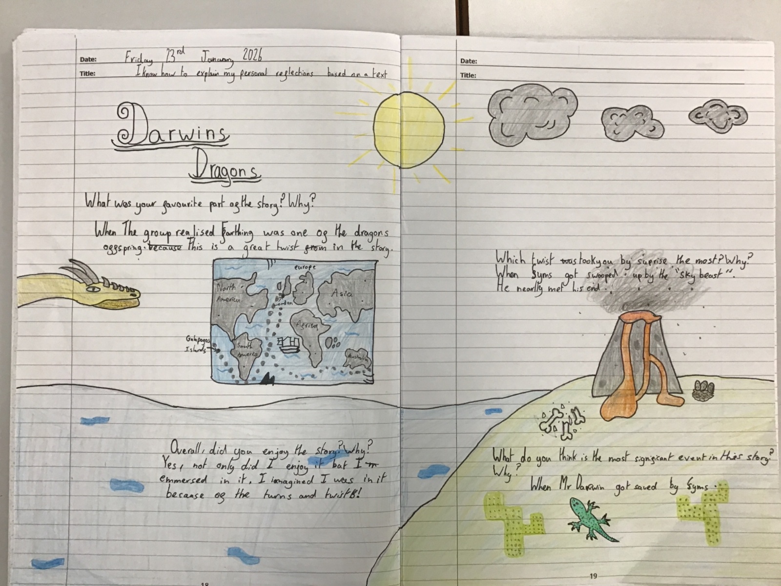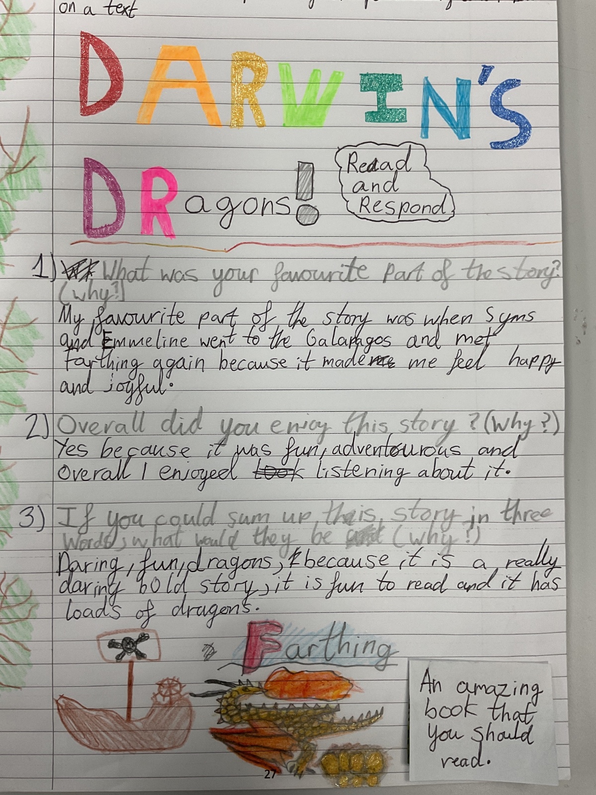 For the last three weeks, we have been really getting stuck into 'Darwin's Dragons' by Lindsay Galvin - a book that is so rich in vocabulary and adventure. Today, we reached the end after experiencing some 'wow' moments in those last few chapters. We then reflected on the book personally, considering whether we liked it, what the twists and turns were and how we might sum up this book in three words; we presented this is an eye-catching way in our books. It has been so lovely to really immerse ourselves in the whole book - even Mrs Cox had goose bumps on the final pages (and she has read it before)!
