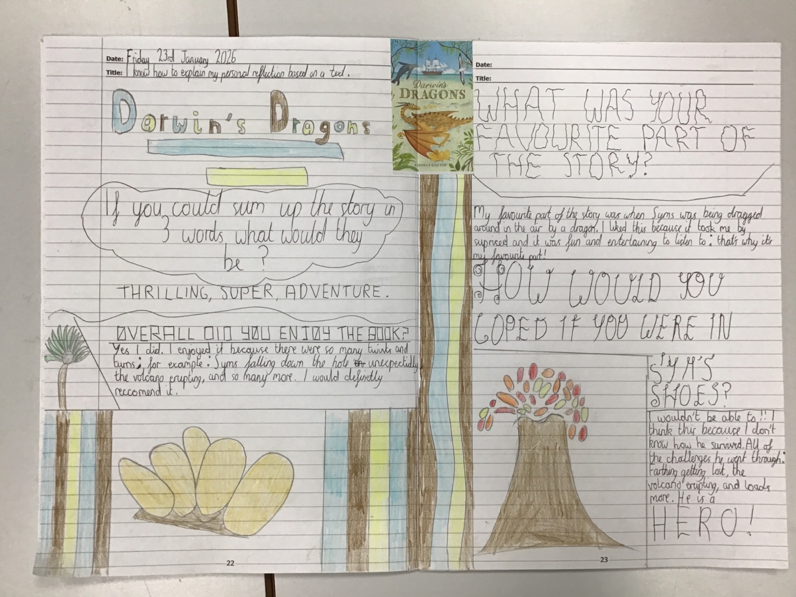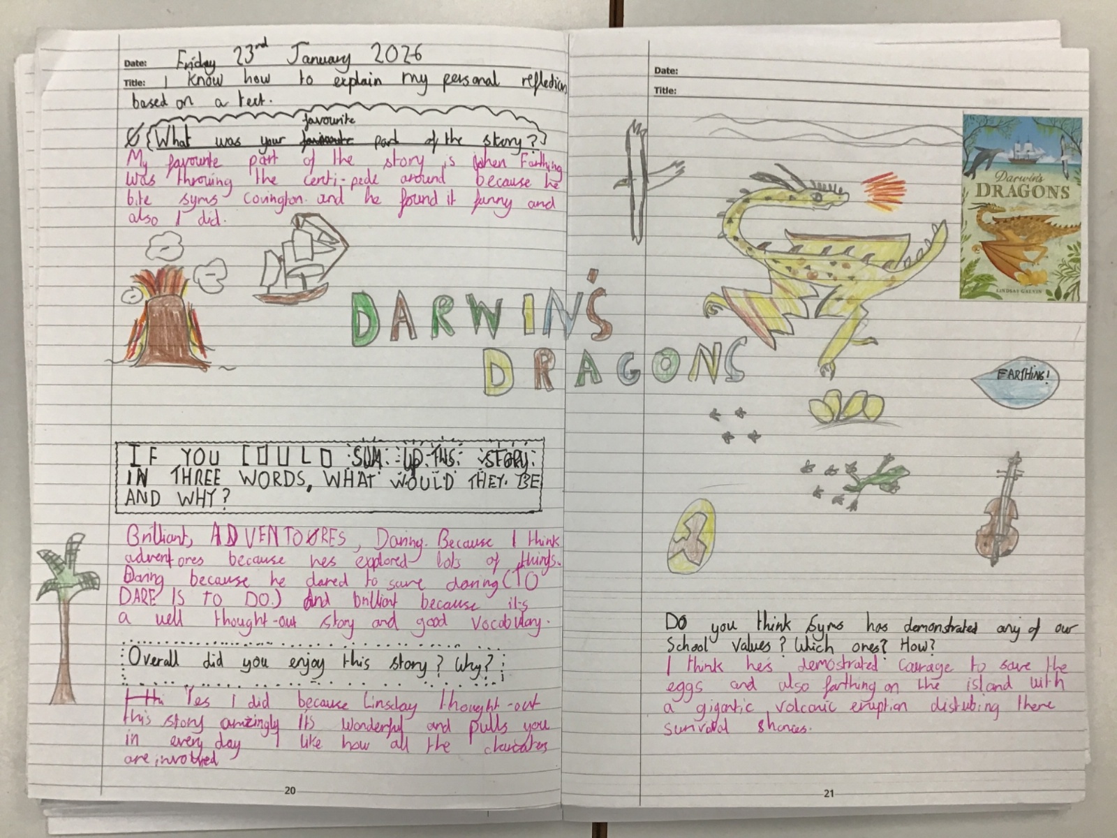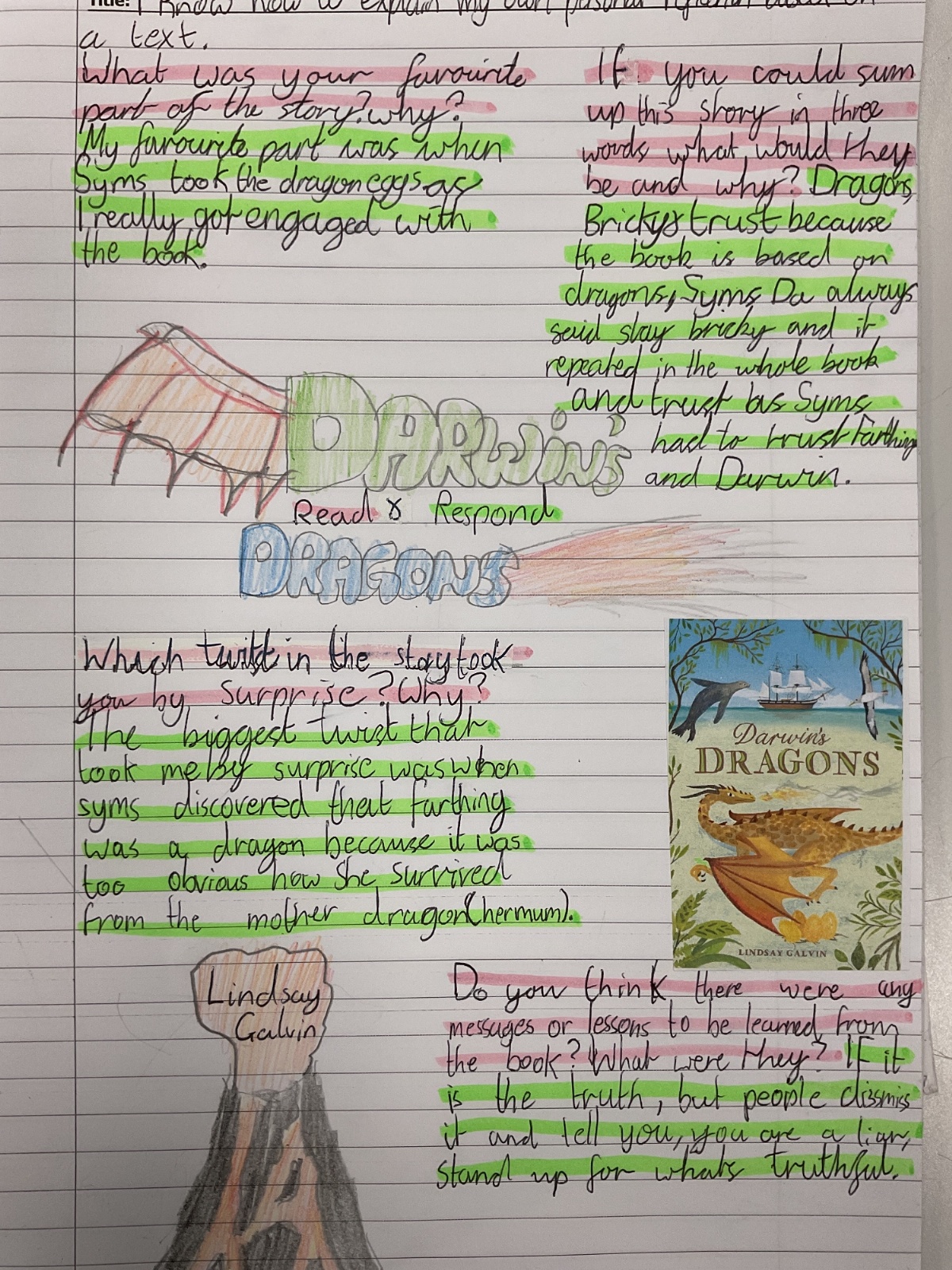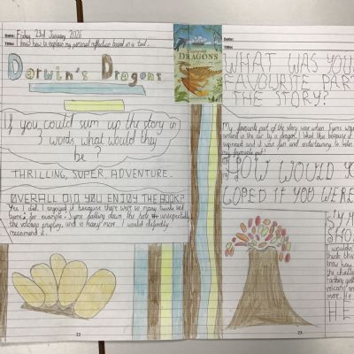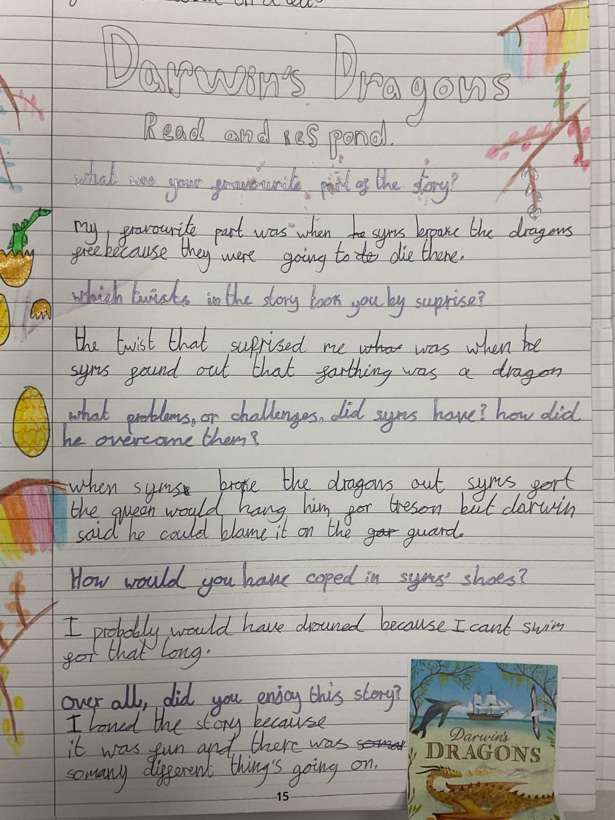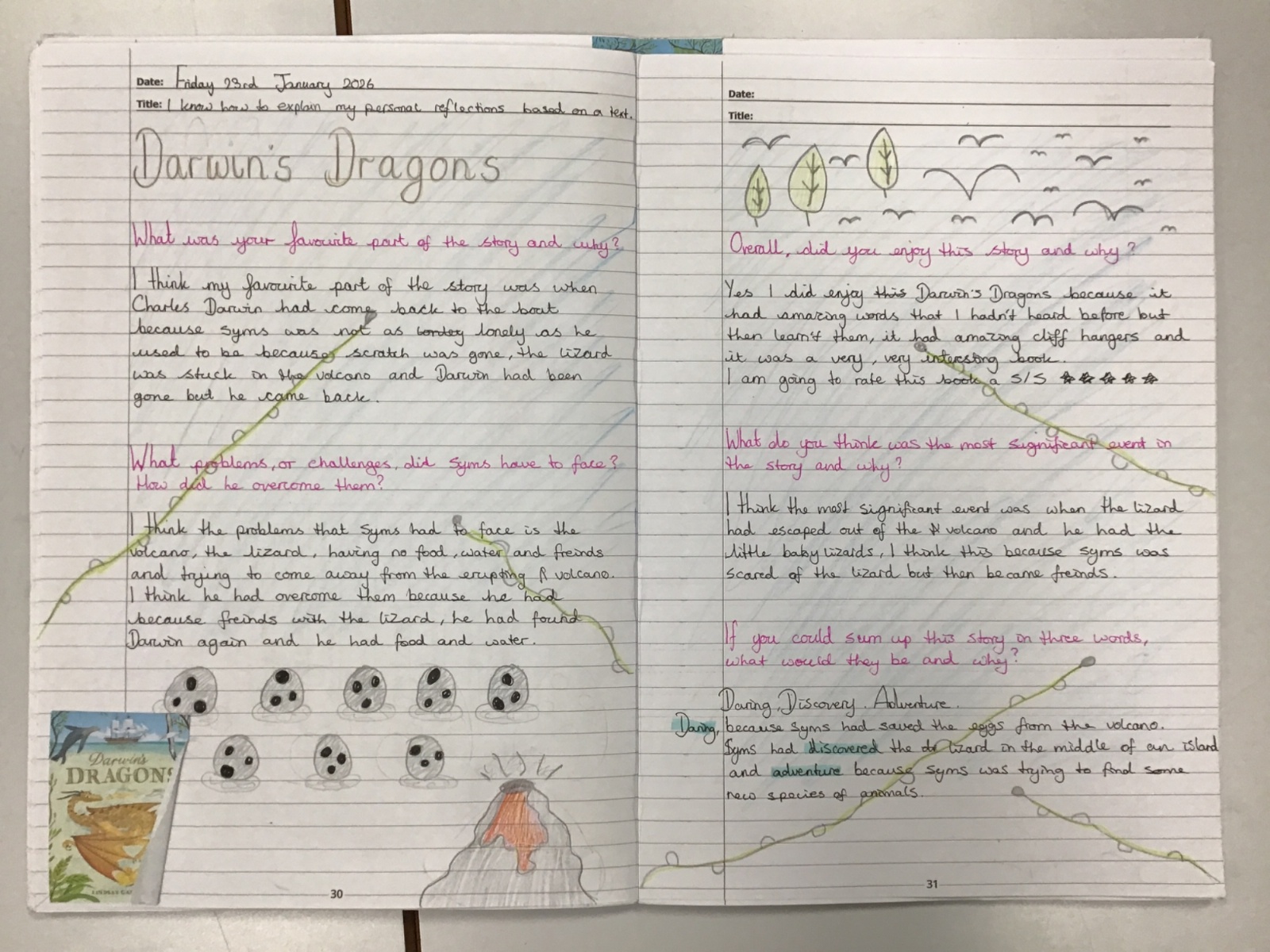 For the last three weeks, we have been really getting stuck into 'Darwin's Dragons' by Lindsay Galvin - a book that is so rich in vocabulary and adventure. Today, we reached the end after experiencing some 'wow' moments in those last few chapters. We then reflected on the book personally, considering whether we liked it, what the twists and turns were and how we might sum up this book in three words; we presented this is an eye-catching way in our books. It has been so lovely to really immerse ourselves in the whole book - even Mrs Cox had goose bumps on the final pages (and she has read it before)!