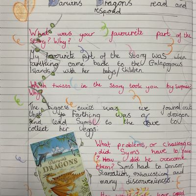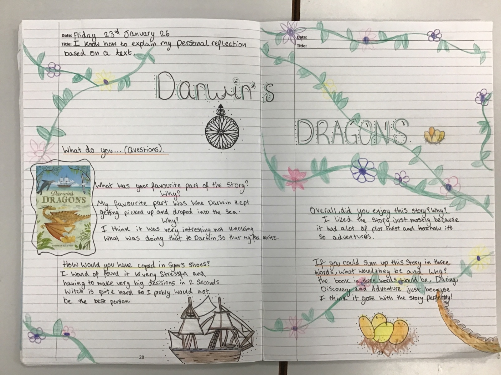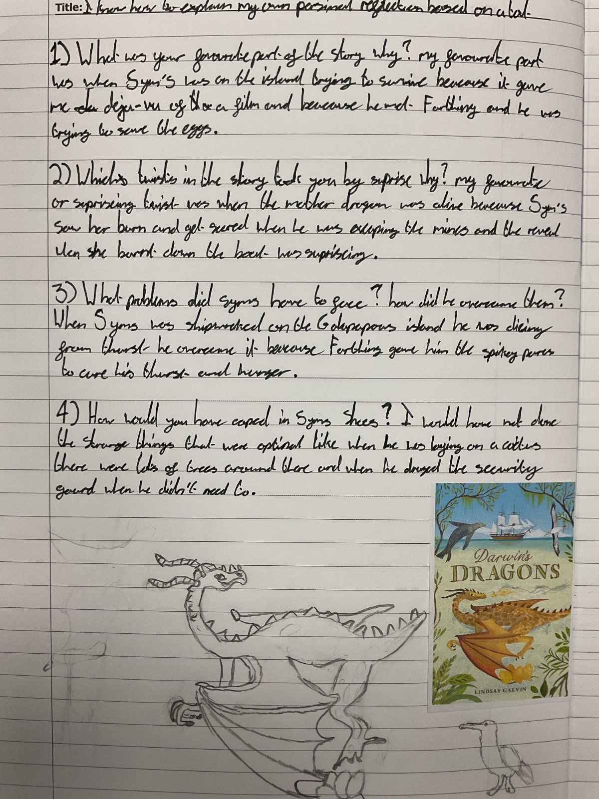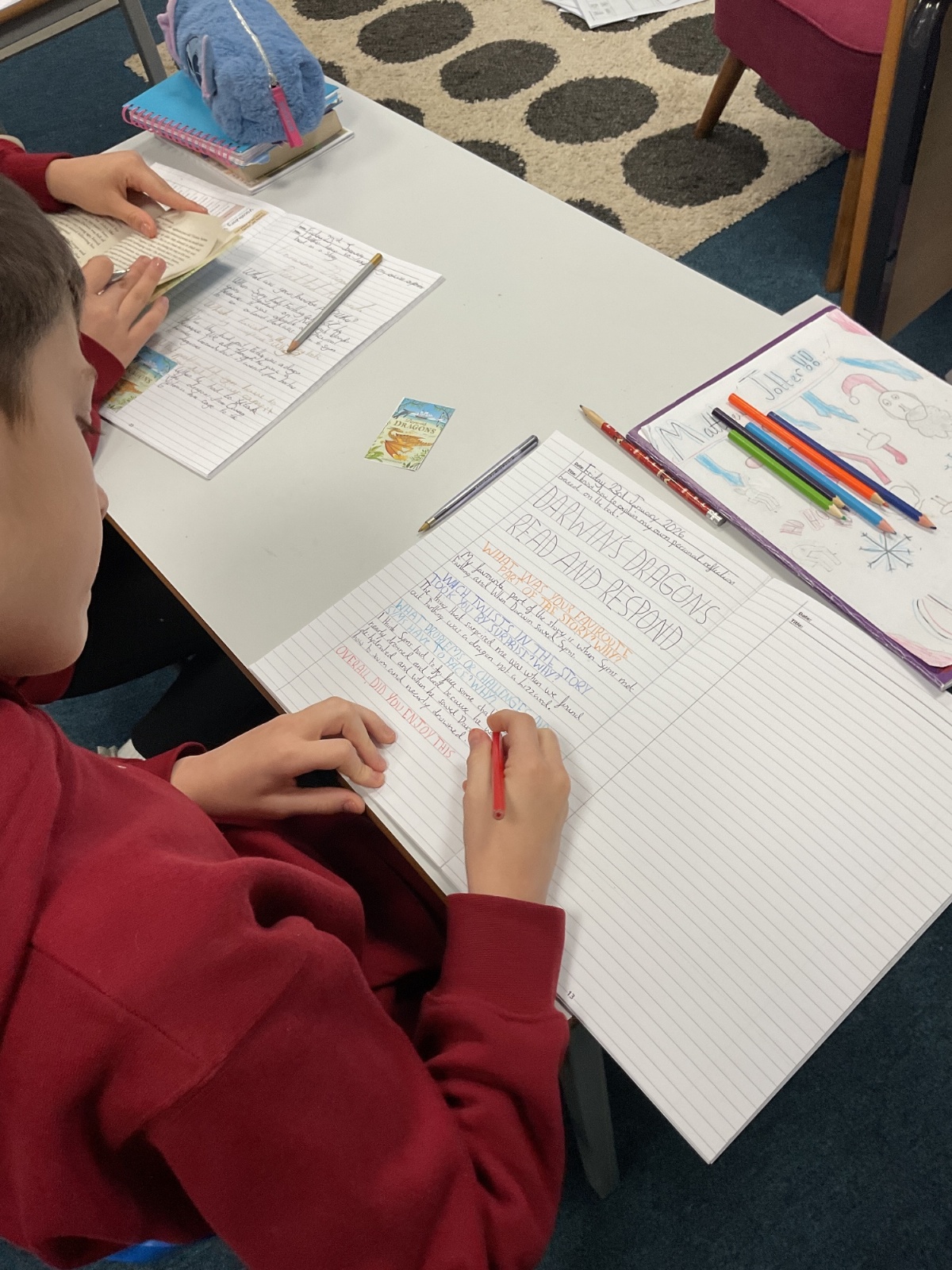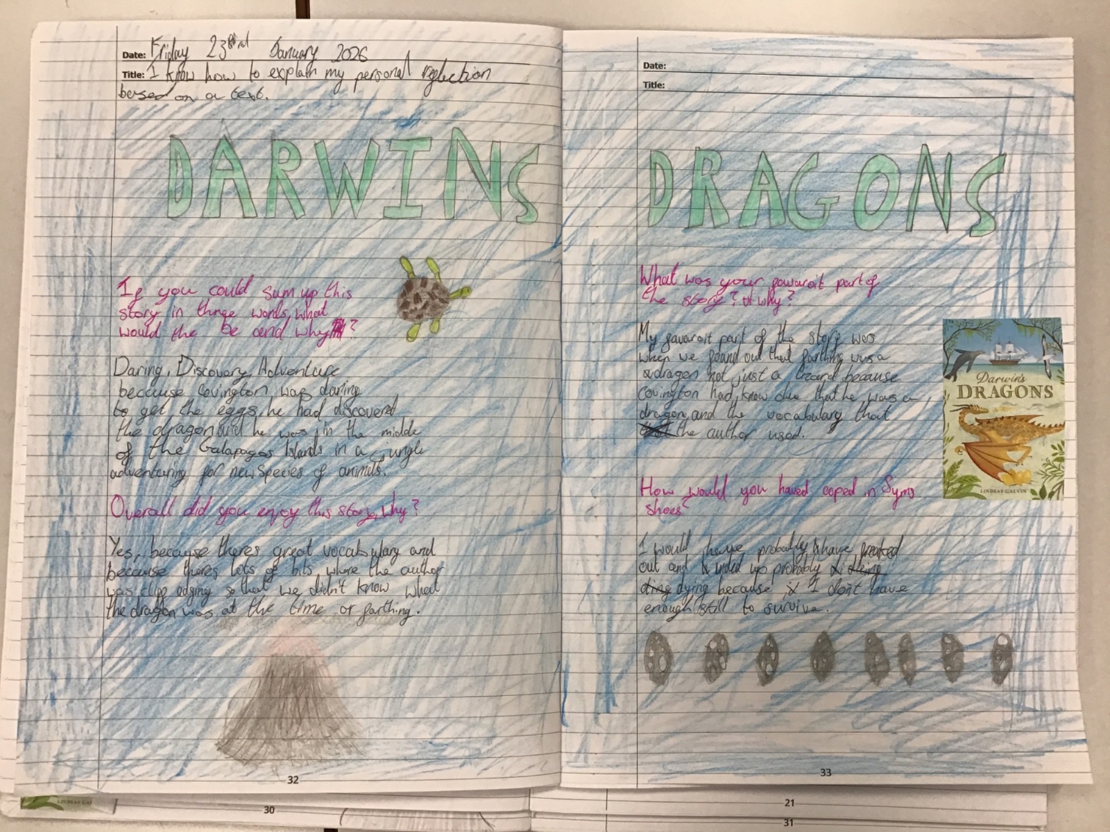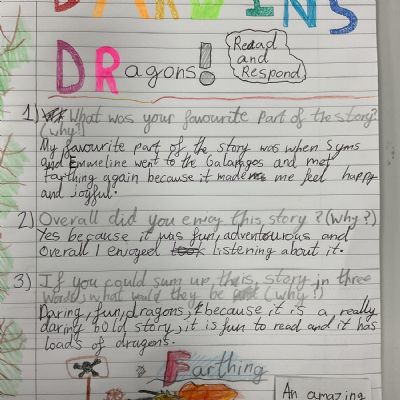 For the last three weeks, we have been really getting stuck into 'Darwin's Dragons' by Lindsay Galvin - a book that is so rich in vocabulary and adventure. Today, we reached the end after experiencing some 'wow' moments in those last few chapters. We then reflected on the book personally, considering whether we liked it, what the twists and turns were and how we might sum up this book in three words; we presented this is an eye-catching way in our books. It has been so lovely to really immerse ourselves in the whole book - even Mrs Cox had goose bumps on the final pages (and she has read it before)!