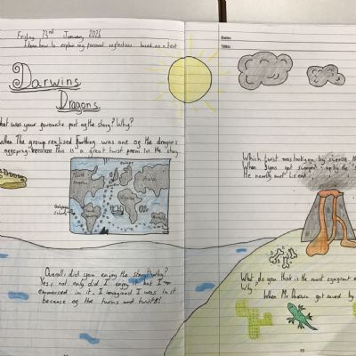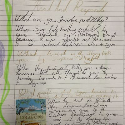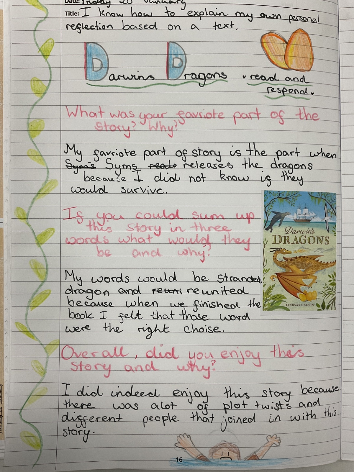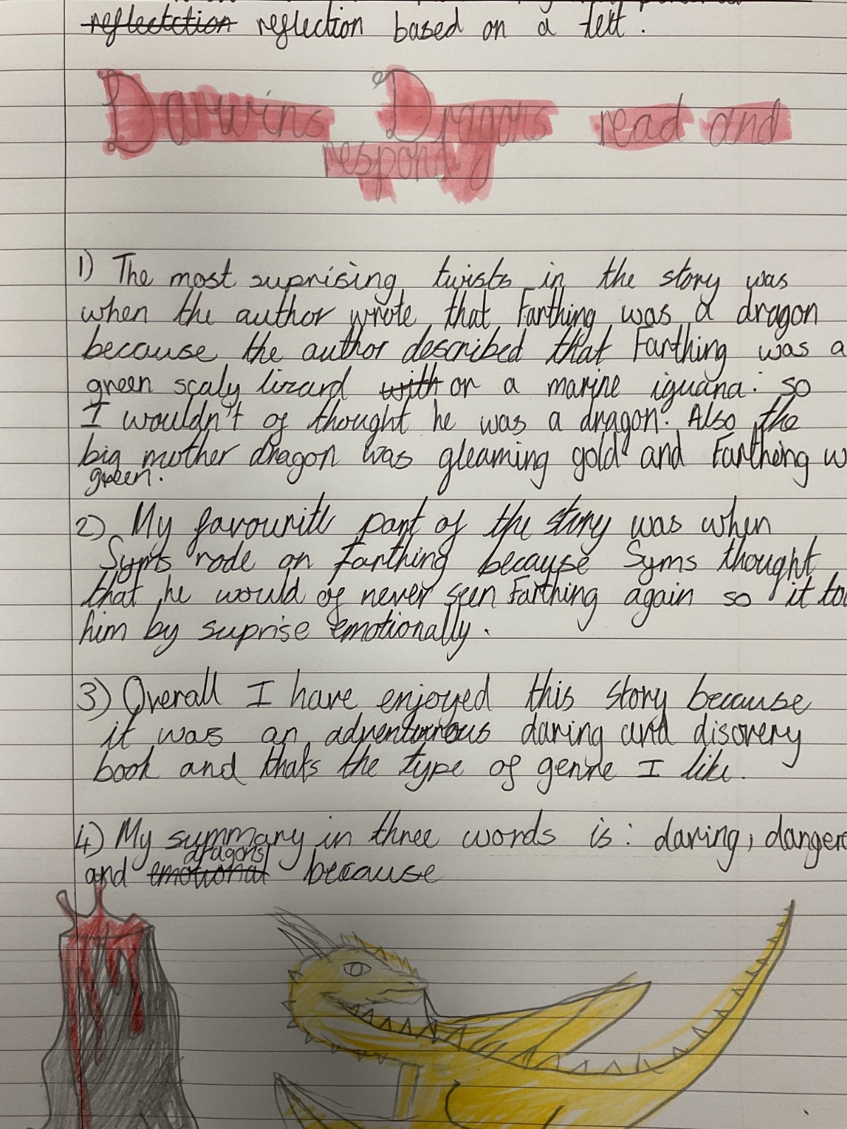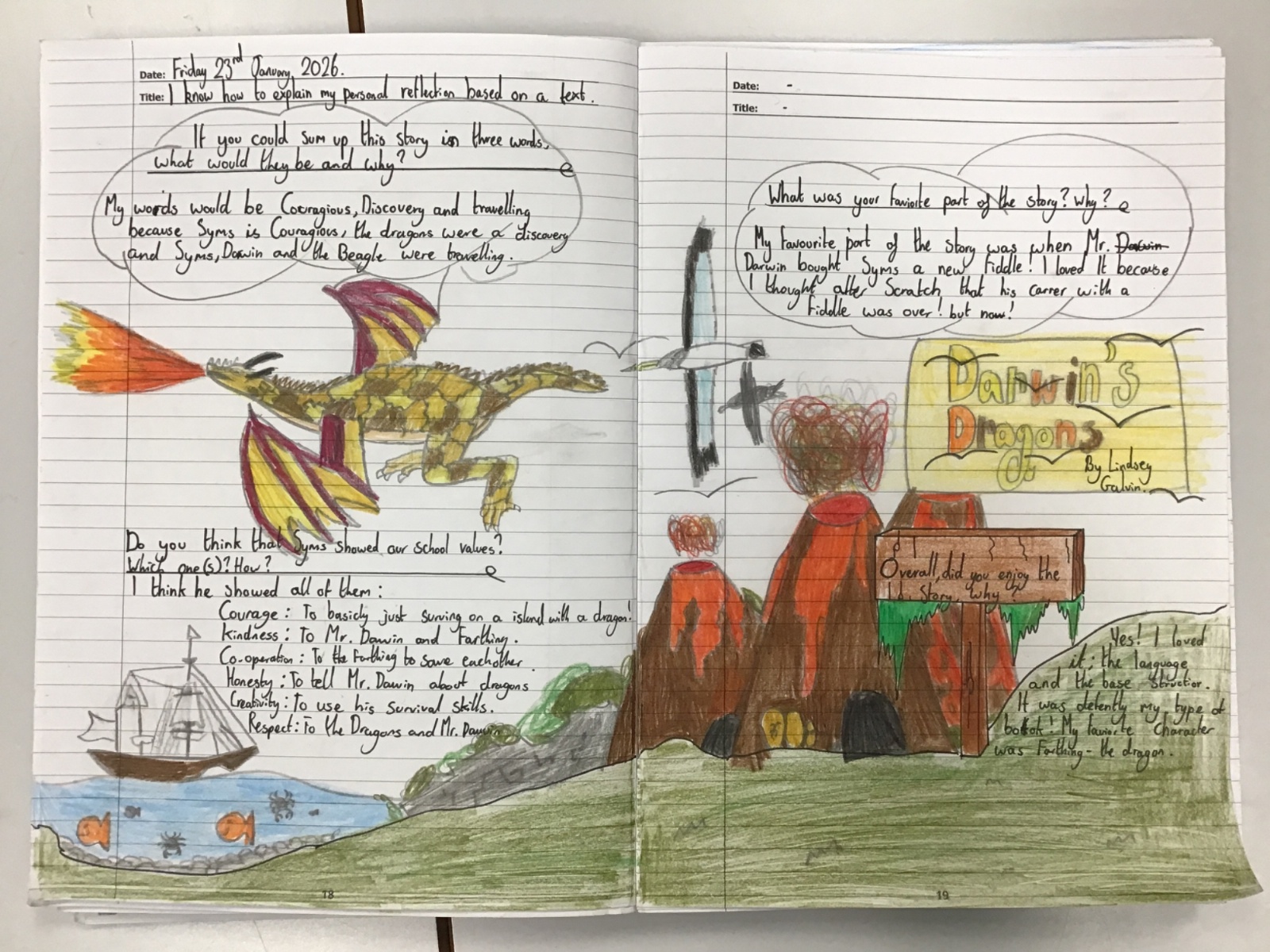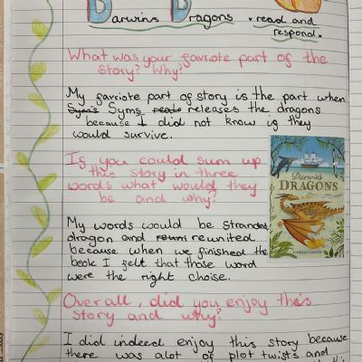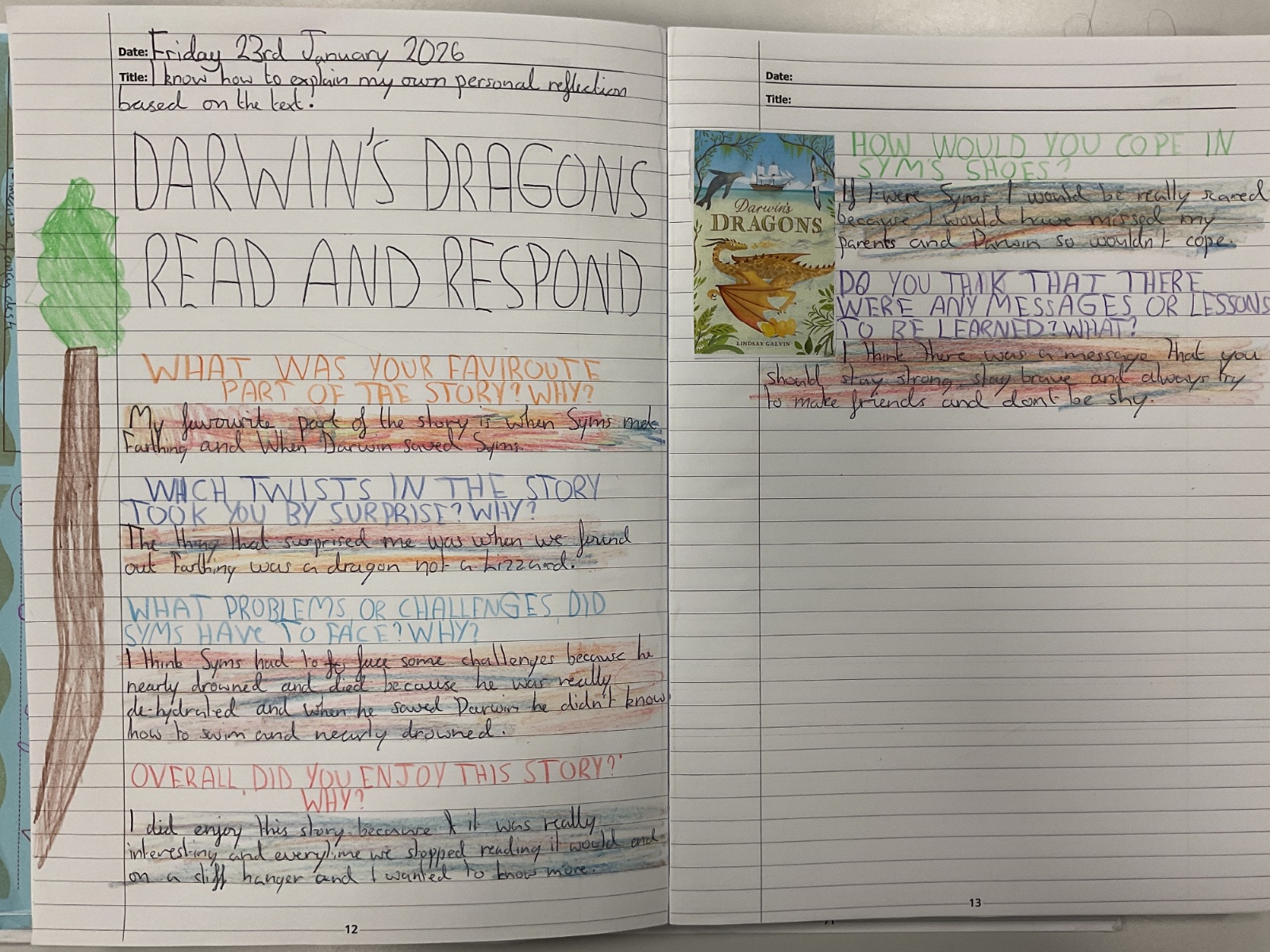 For the last three weeks, we have been really getting stuck into 'Darwin's Dragons' by Lindsay Galvin - a book that is so rich in vocabulary and adventure. Today, we reached the end after experiencing some 'wow' moments in those last few chapters. We then reflected on the book personally, considering whether we liked it, what the twists and turns were and how we might sum up this book in three words; we presented this is an eye-catching way in our books. It has been so lovely to really immerse ourselves in the whole book - even Mrs Cox had goose bumps on the final pages (and she has read it before)!