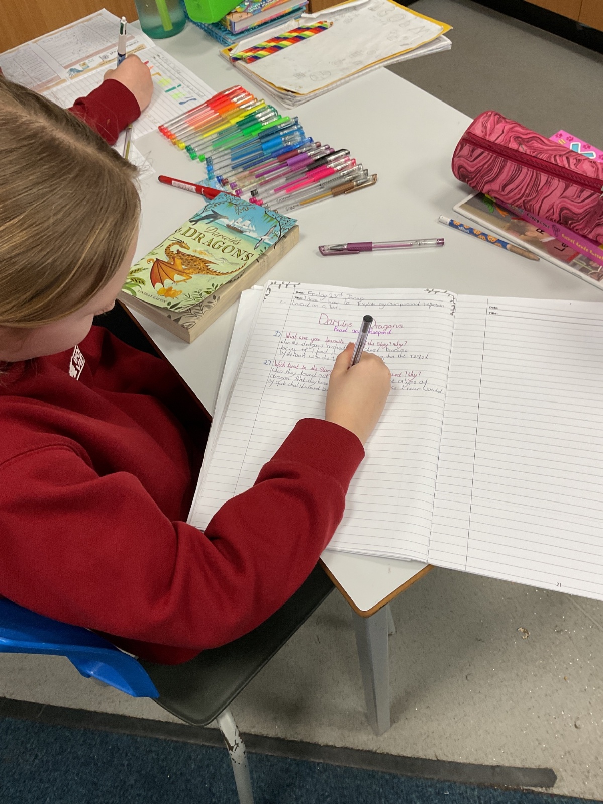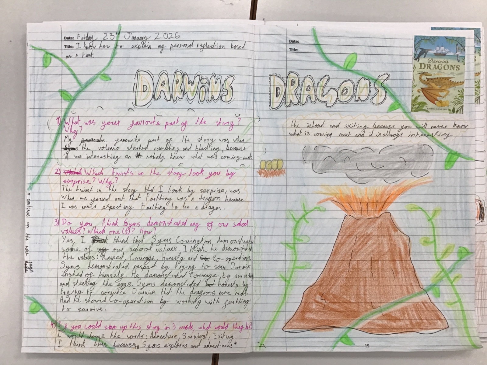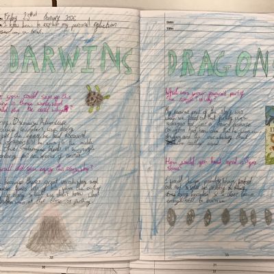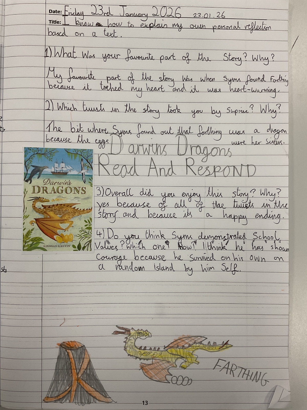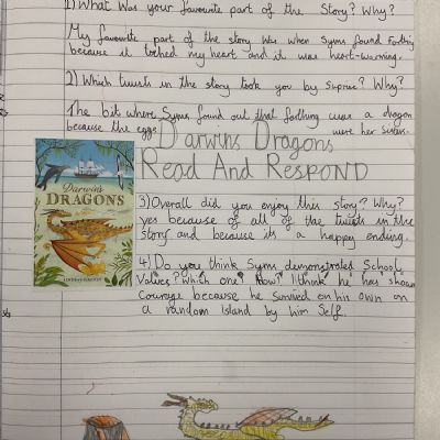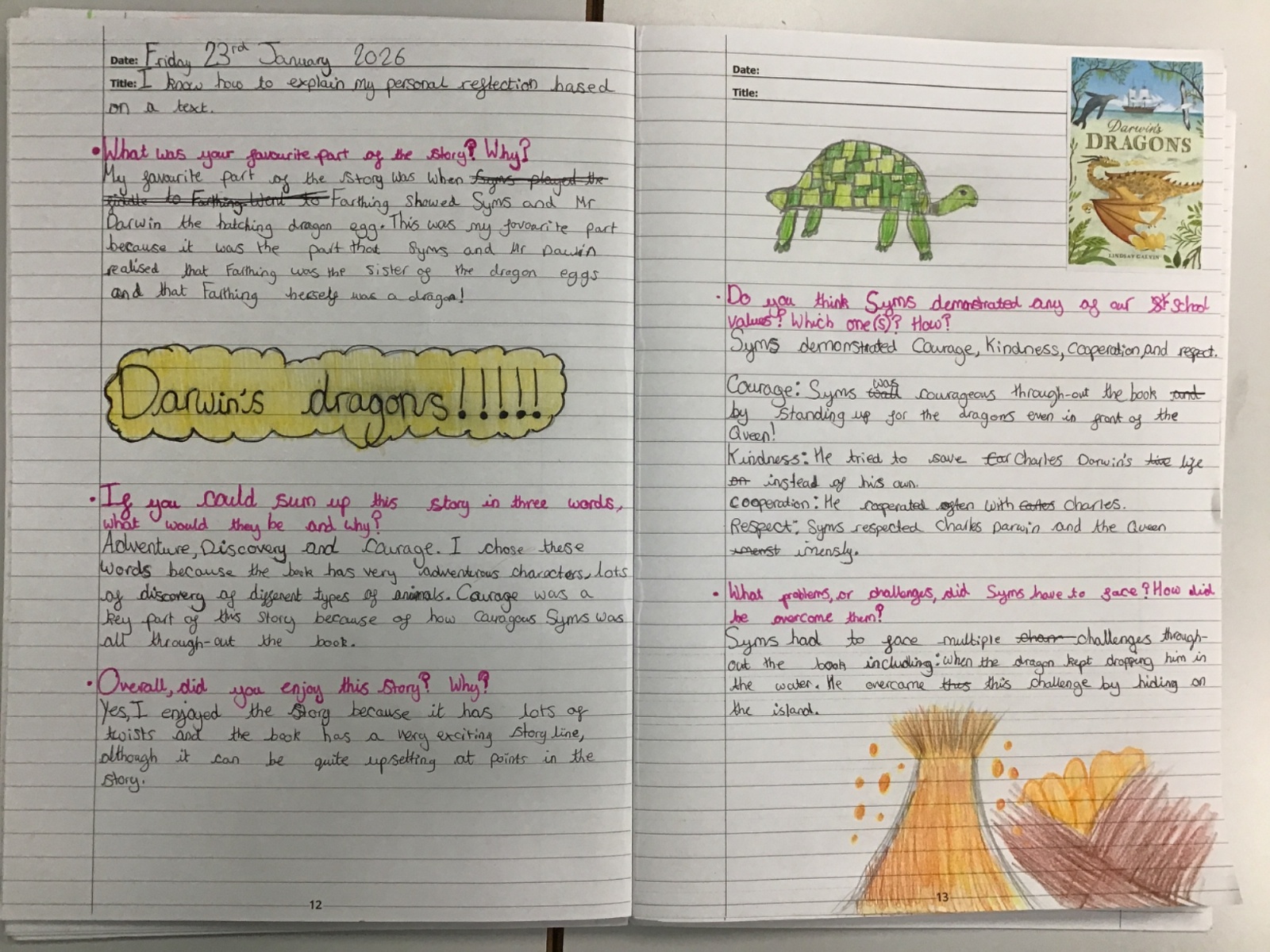 For the last three weeks, we have been really getting stuck into 'Darwin's Dragons' by Lindsay Galvin - a book that is so rich in vocabulary and adventure. Today, we reached the end after experiencing some 'wow' moments in those last few chapters. We then reflected on the book personally, considering whether we liked it, what the twists and turns were and how we might sum up this book in three words; we presented this is an eye-catching way in our books. It has been so lovely to really immerse ourselves in the whole book - even Mrs Cox had goose bumps on the final pages (and she has read it before)!