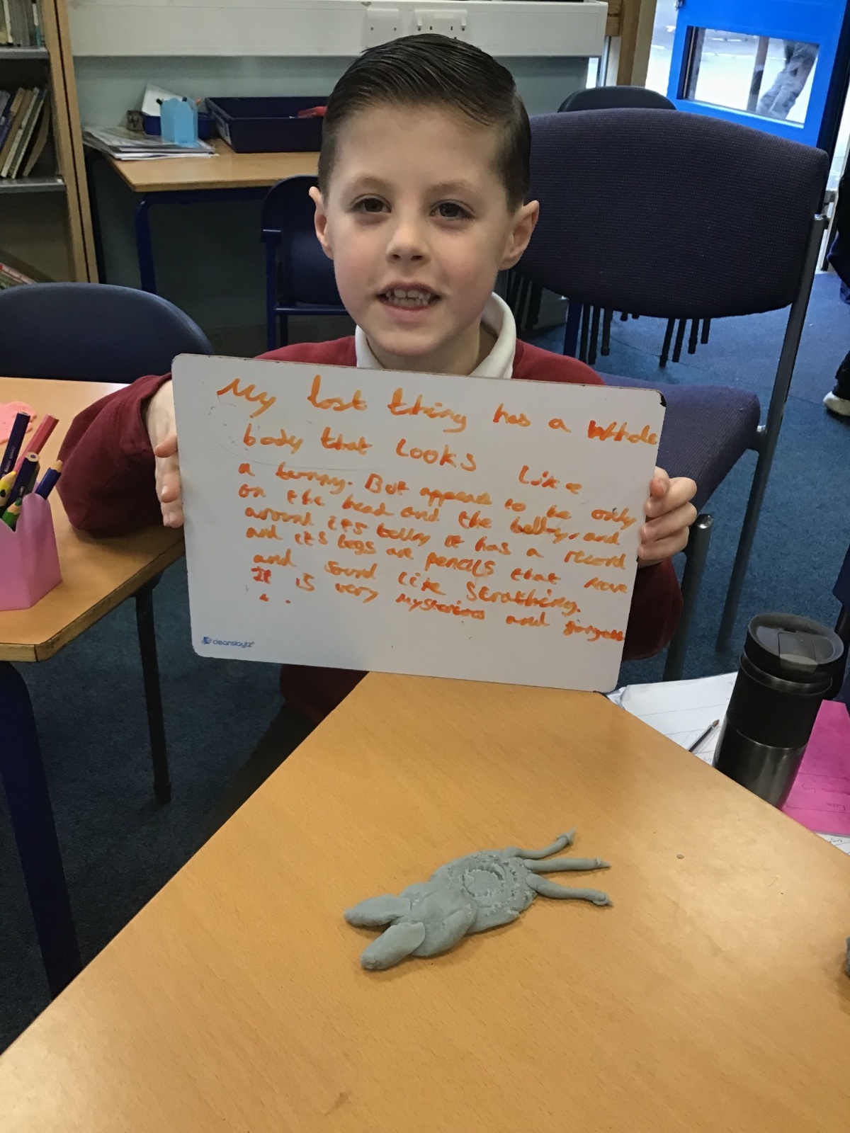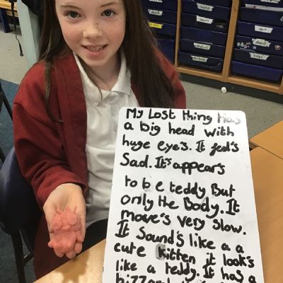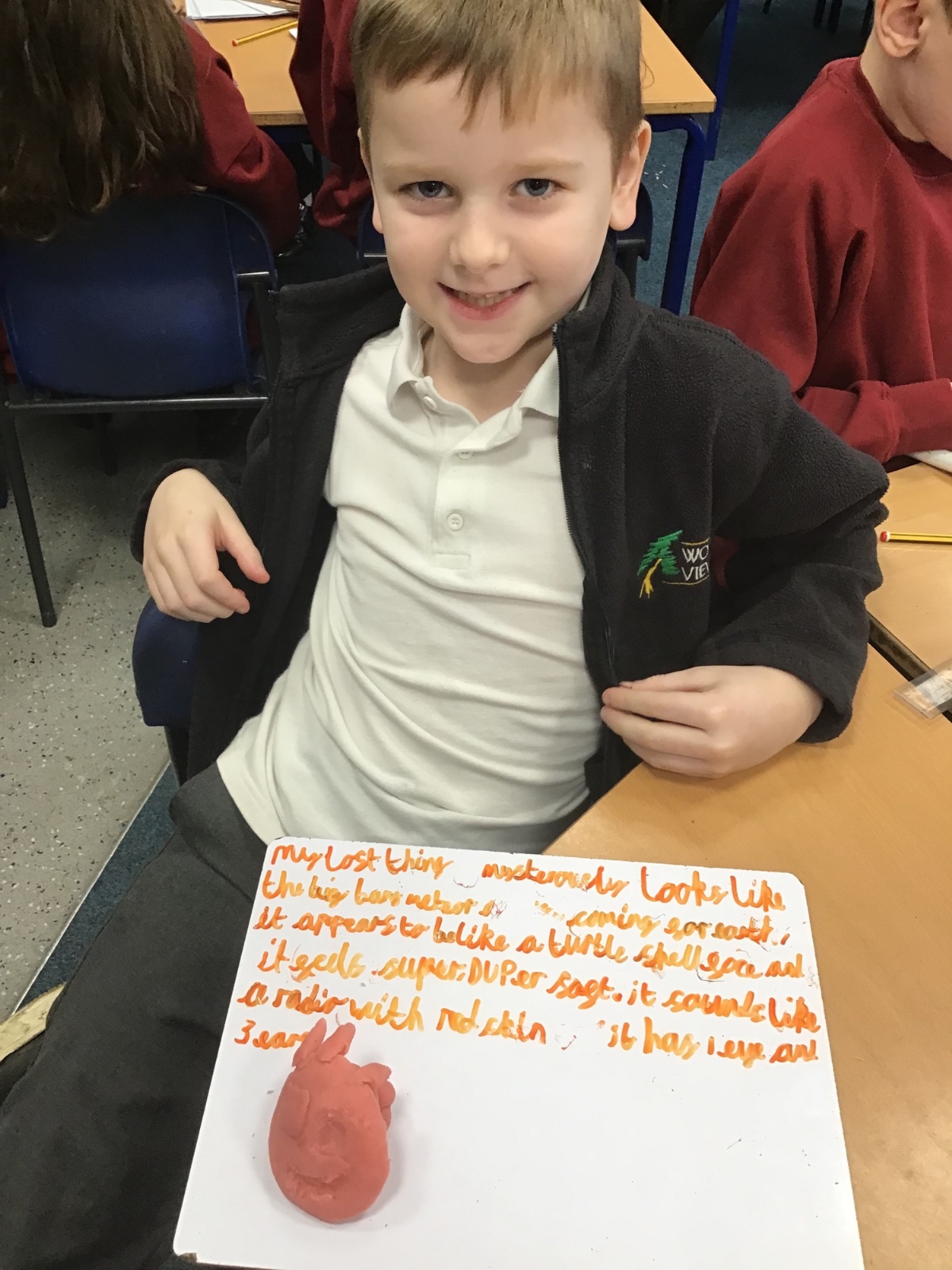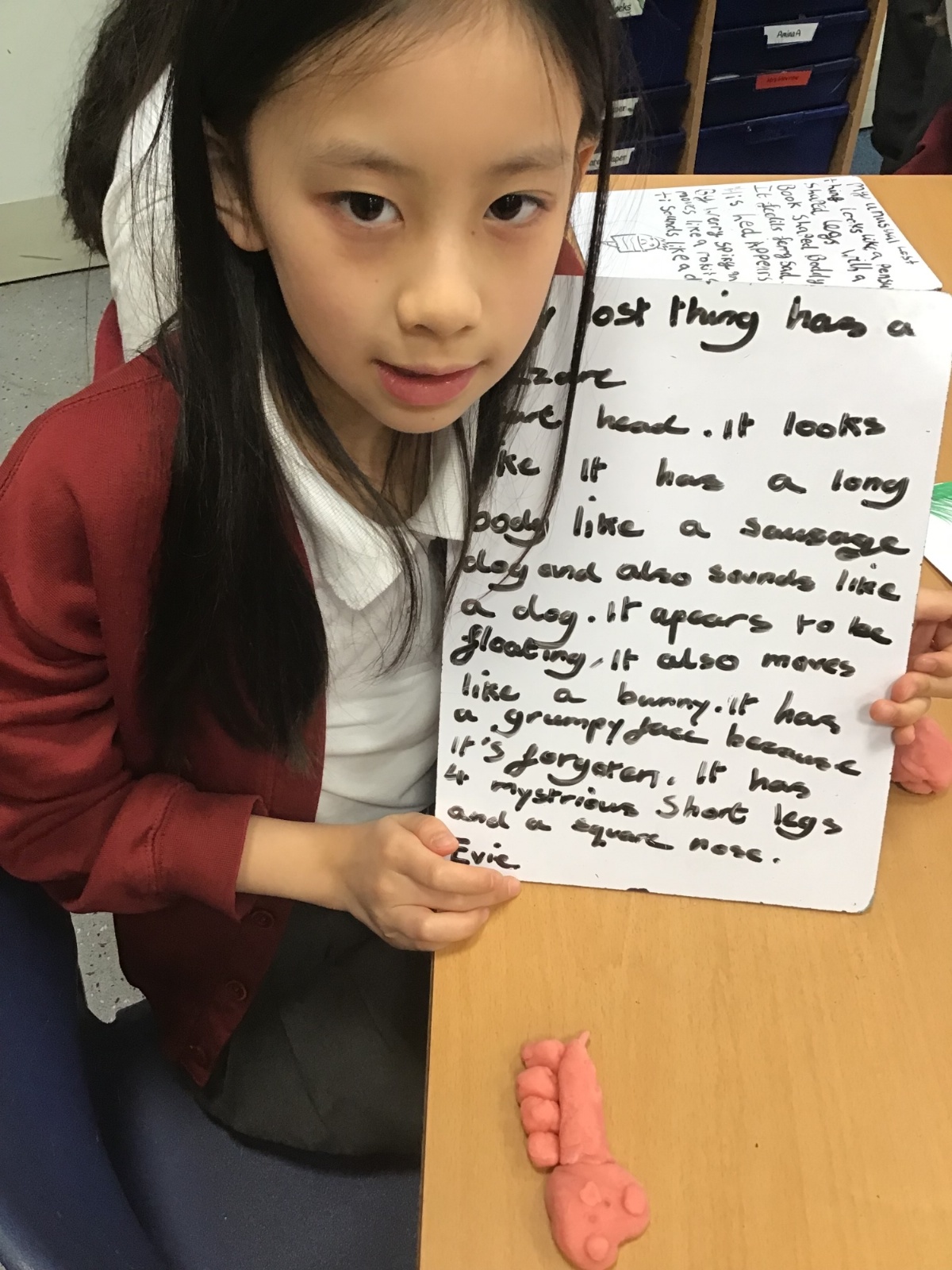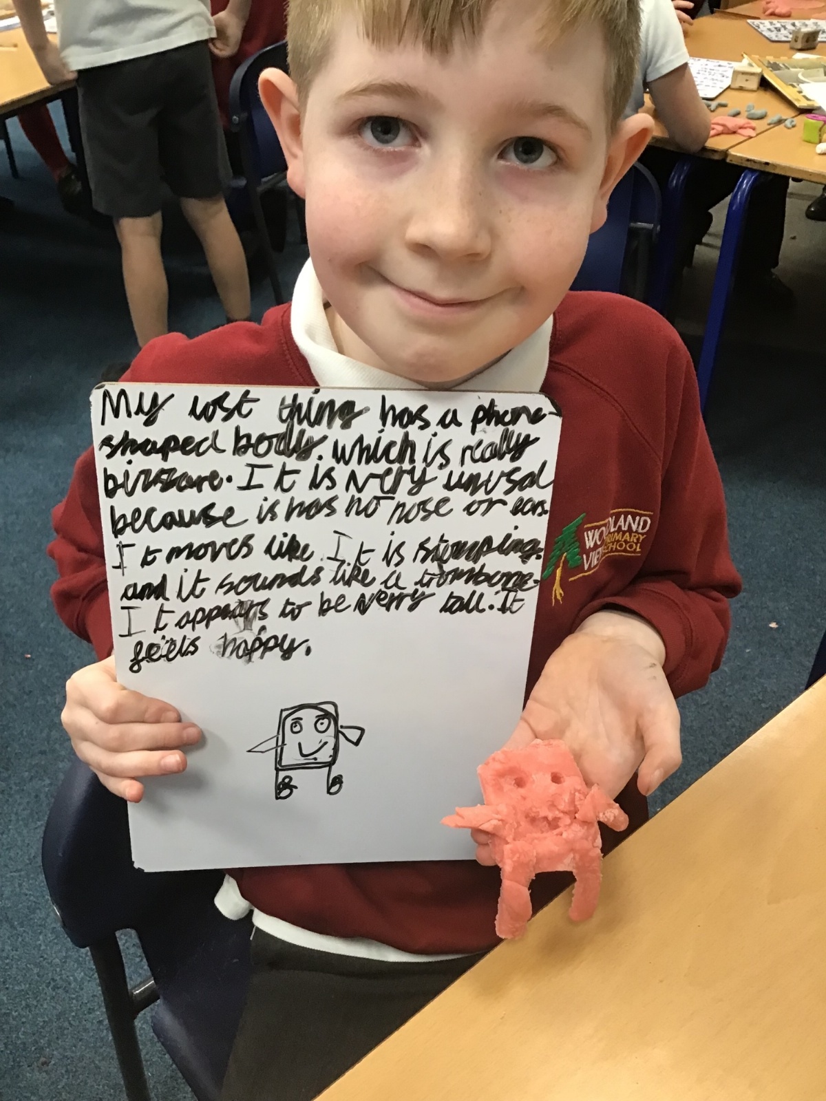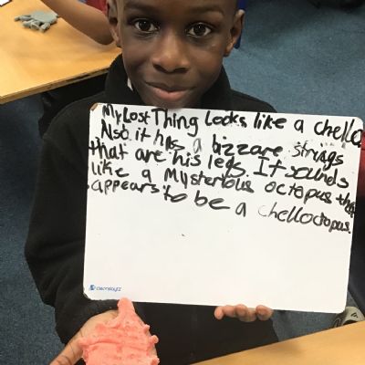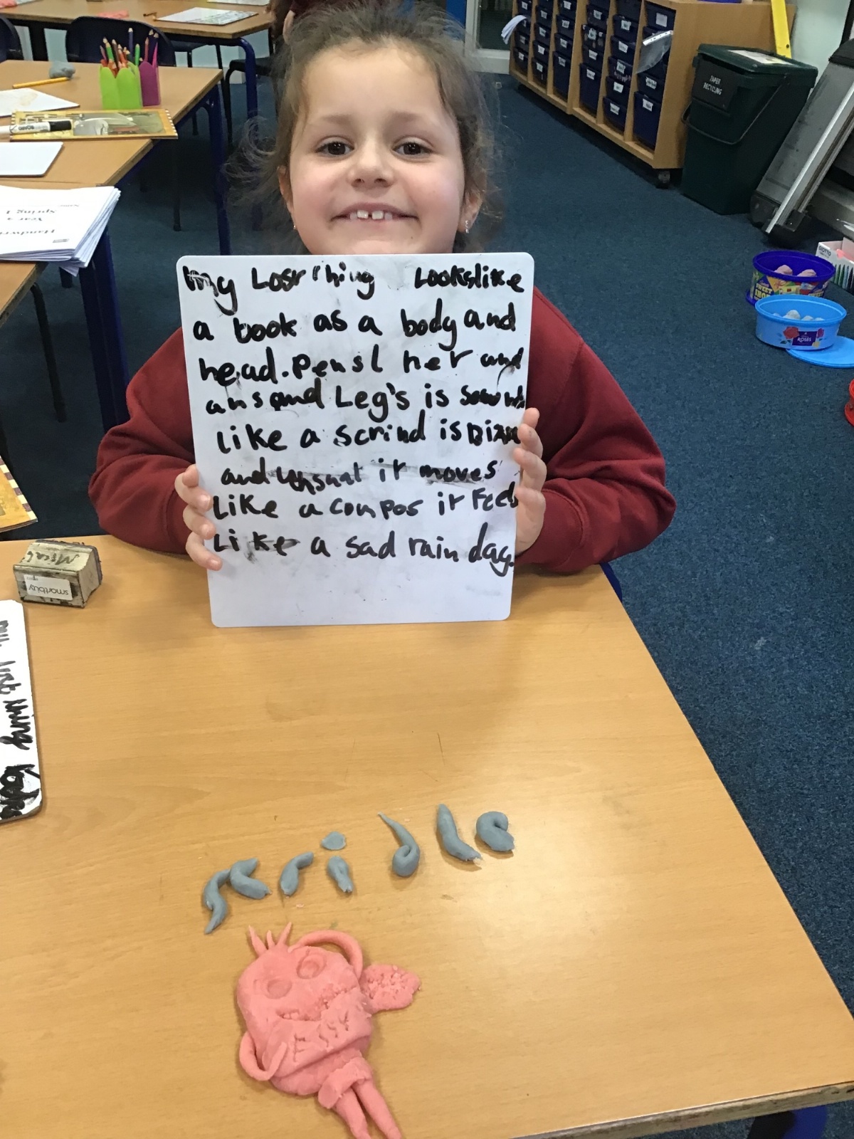 We have been using this term's class English book as a starting point to inspire us to create our own Lost Thing character. We recapped the story and looked at the different Lost Things in the book. Afterwards, we talked about the importance of detail when describing a character to give the reader a really clear picture of what the character is like both in appearance and personality. In Comprehension, we had to first read a description of a fictional character and draw what we thought it looked like based on the description. We then designed our own Lost Thing by writing a detailed description and using this, we were able to bring our character to life using playdoh.