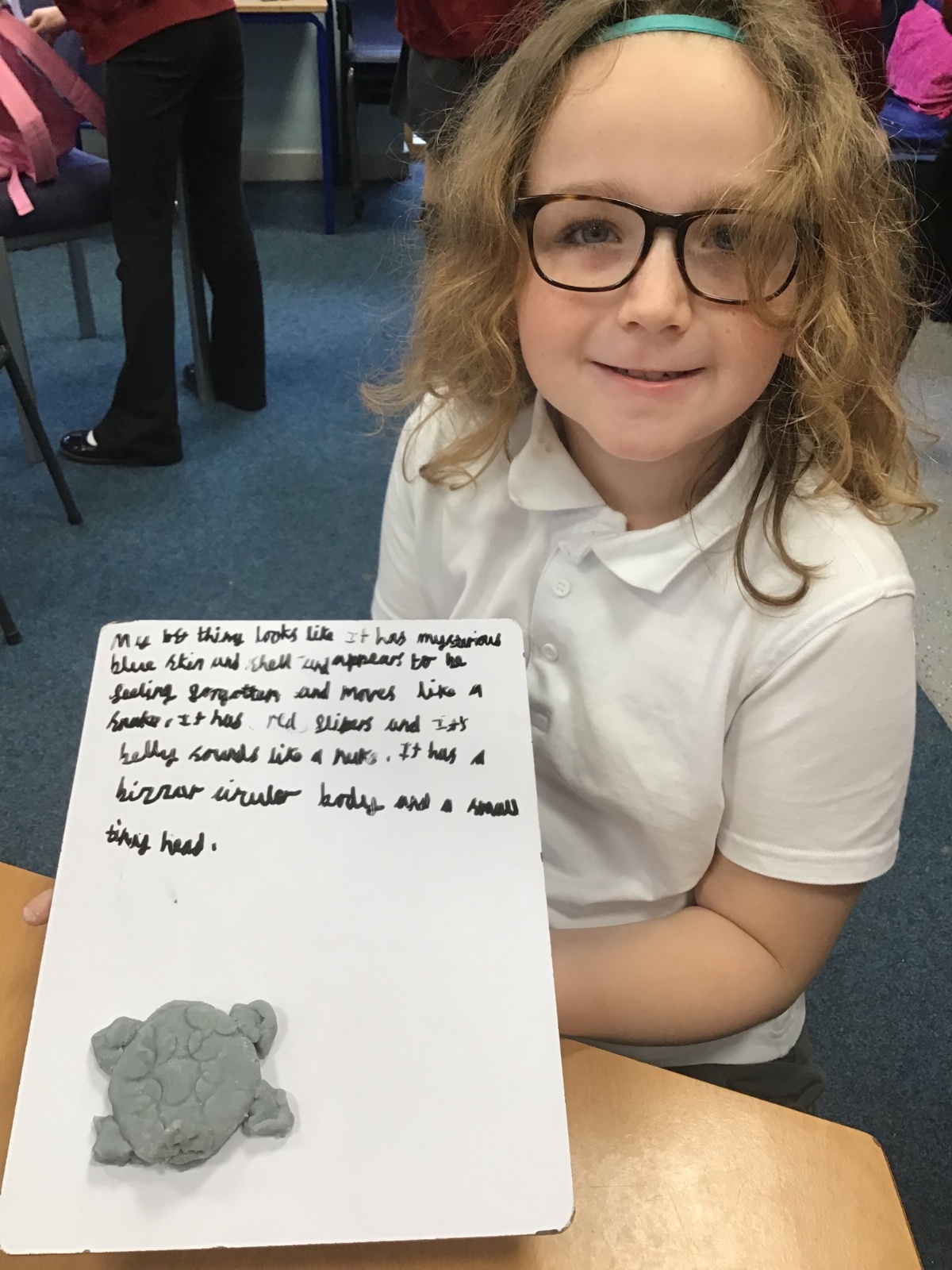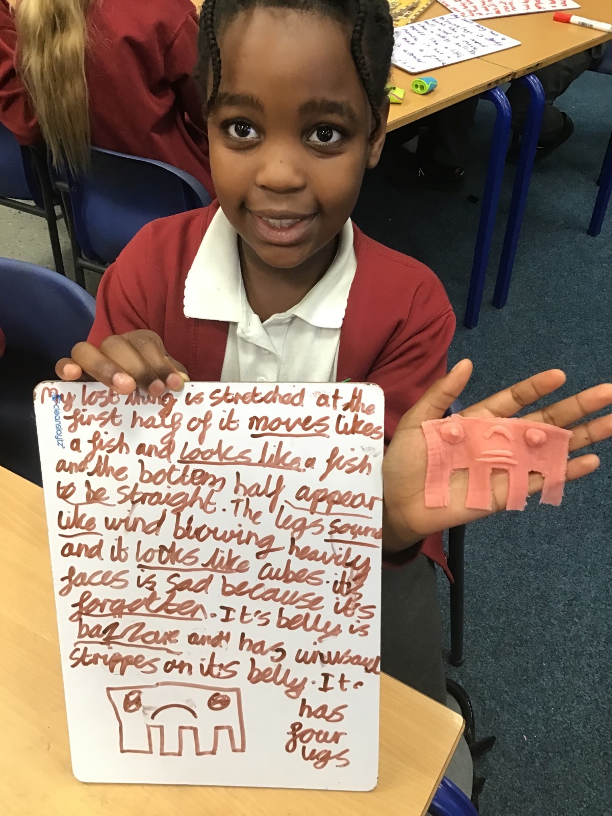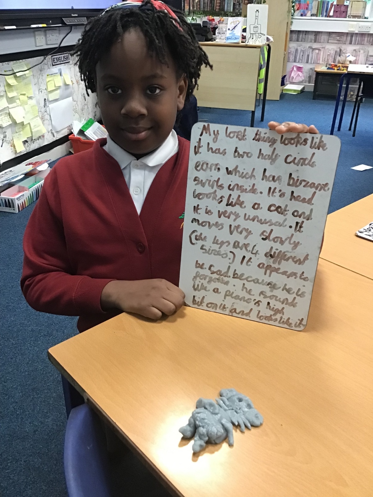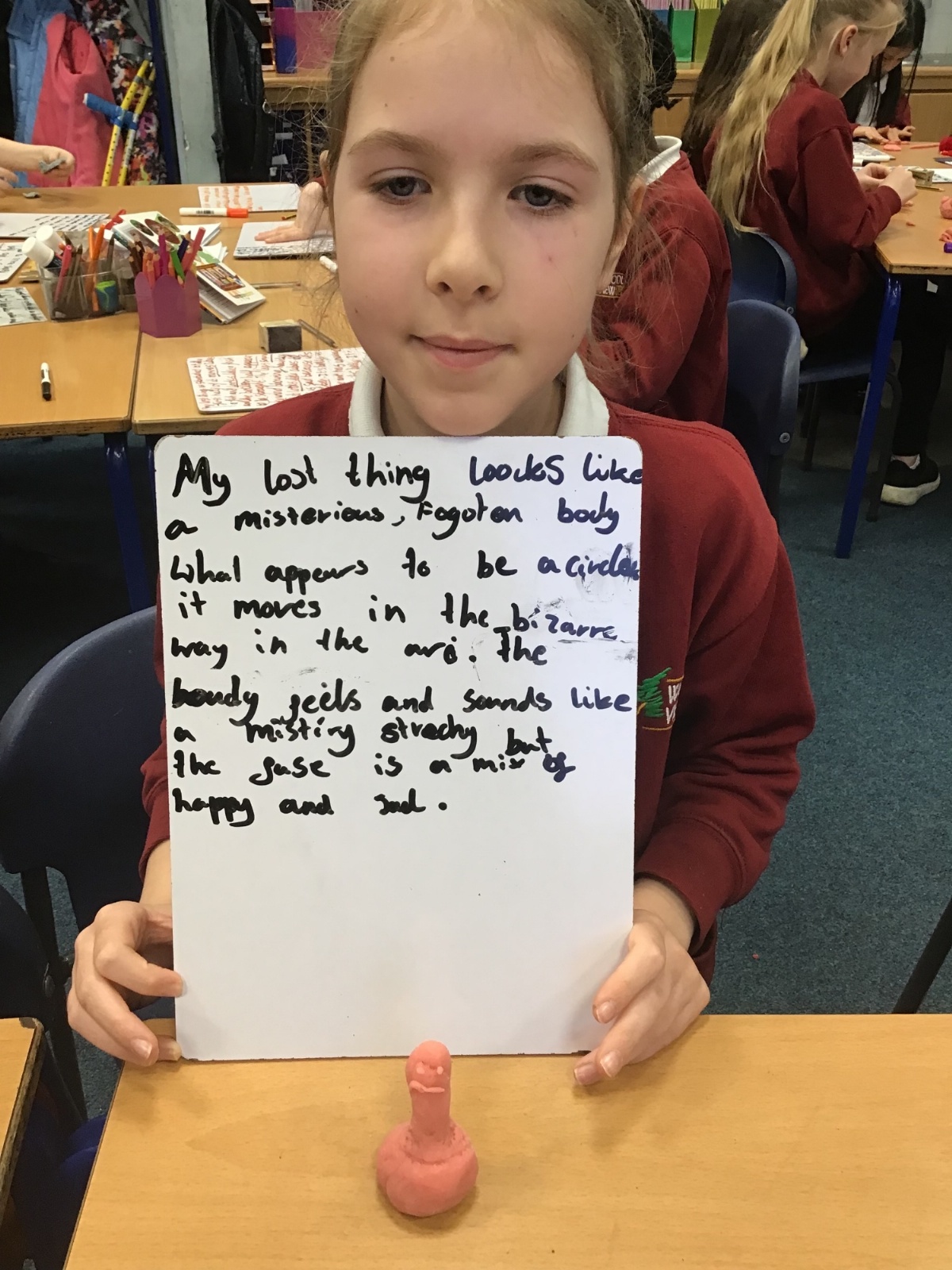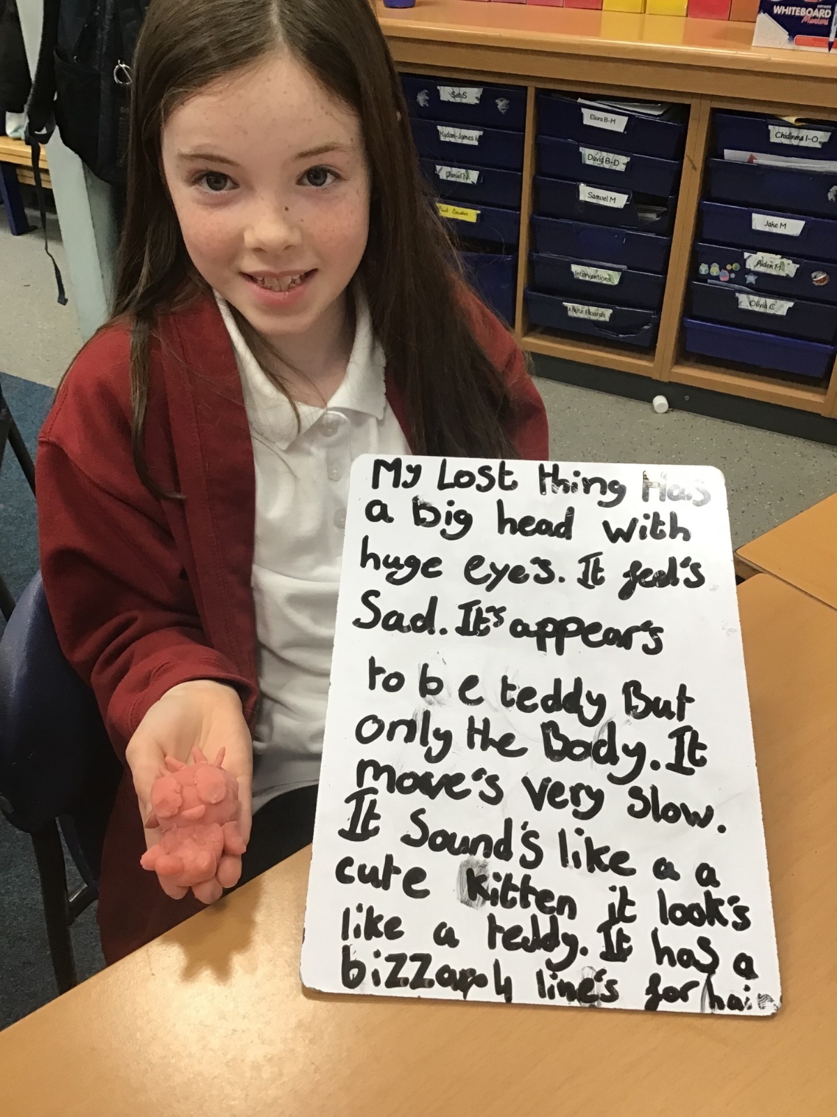 We have been using this term's class English book as a starting point to inspire us to create our own Lost Thing character. We recapped the story and looked at the different Lost Things in the book. Afterwards, we talked about the importance of detail when describing a character to give the reader a really clear picture of what the character is like both in appearance and personality. In Comprehension, we had to first read a description of a fictional character and draw what we thought it looked like based on the description. We then designed our own Lost Thing by writing a detailed description and using this, we were able to bring our character to life using playdoh.