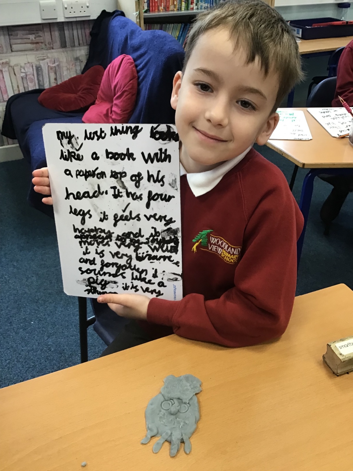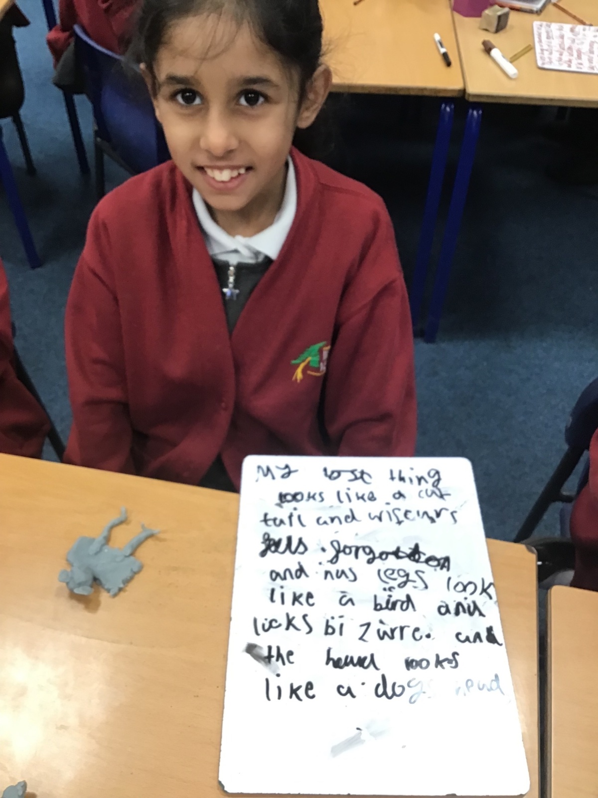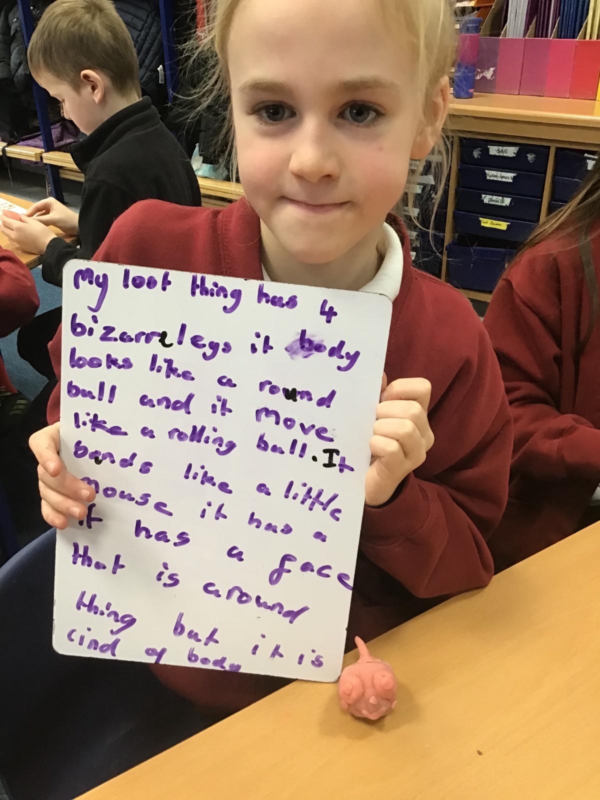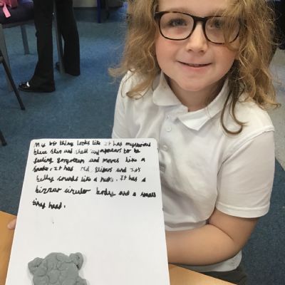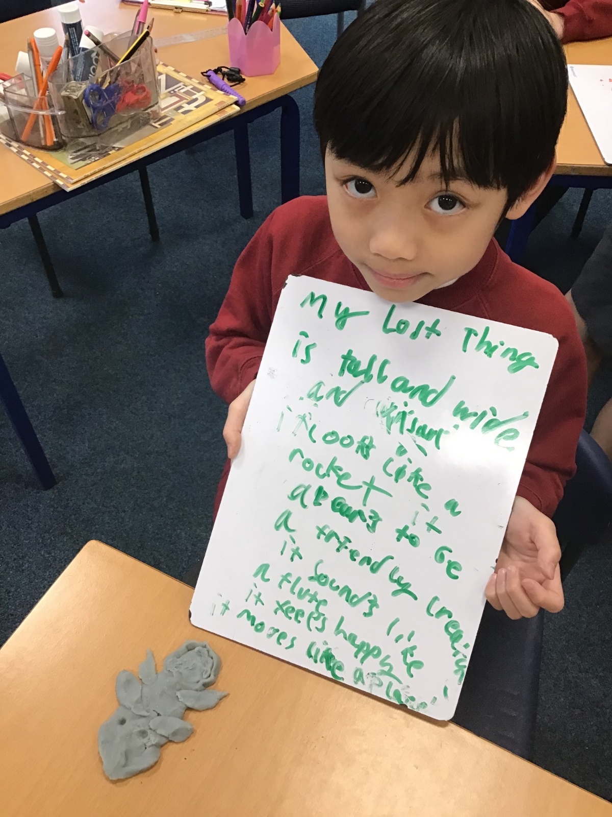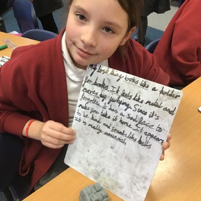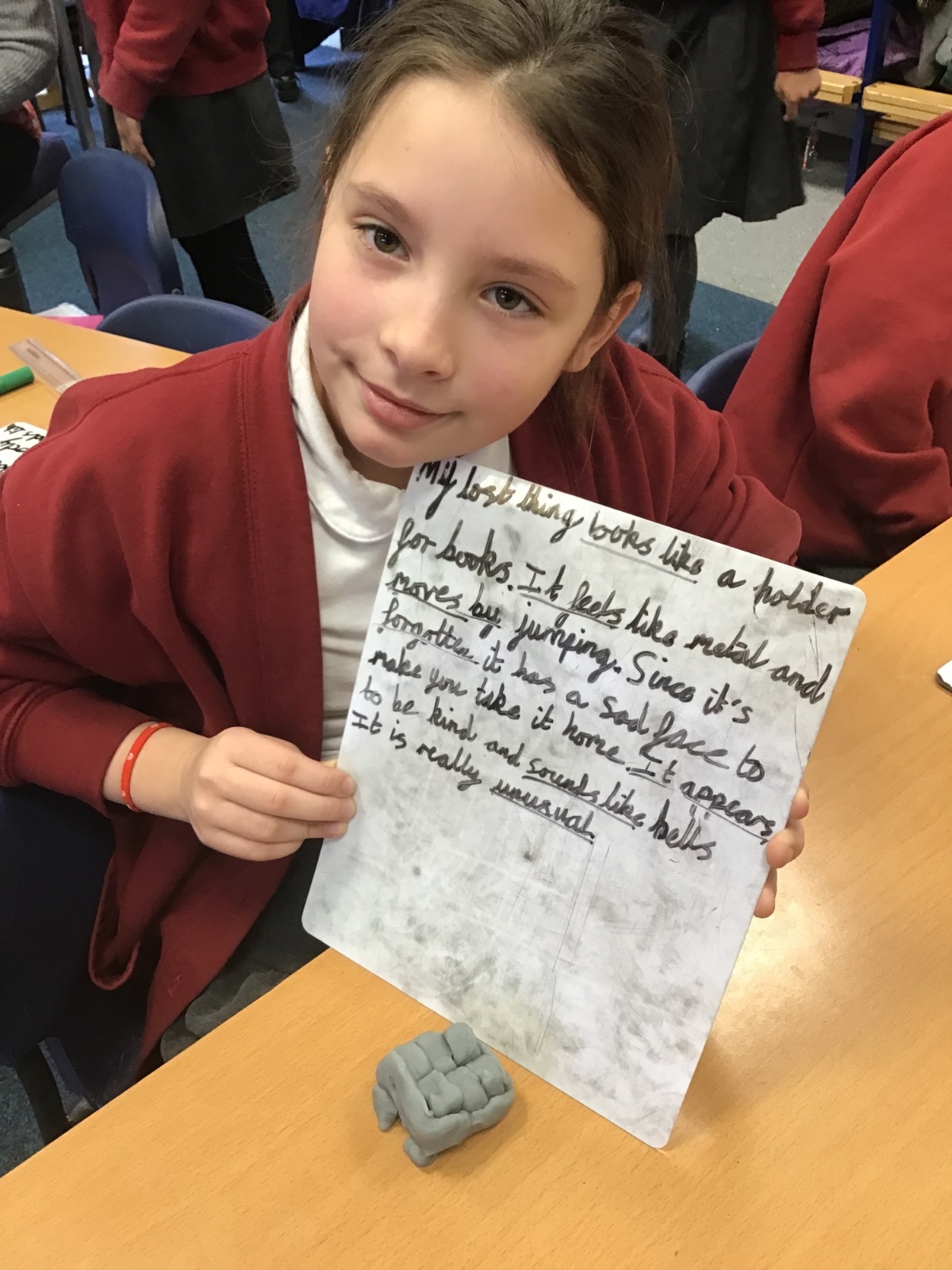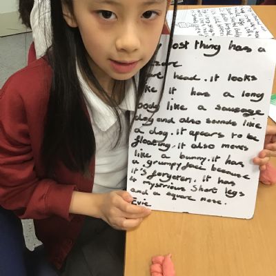 We have been using this term's class English book as a starting point to inspire us to create our own Lost Thing character. We recapped the story and looked at the different Lost Things in the book. Afterwards, we talked about the importance of detail when describing a character to give the reader a really clear picture of what the character is like both in appearance and personality. In Comprehension, we had to first read a description of a fictional character and draw what we thought it looked like based on the description. We then designed our own Lost Thing by writing a detailed description and using this, we were able to bring our character to life using playdoh.