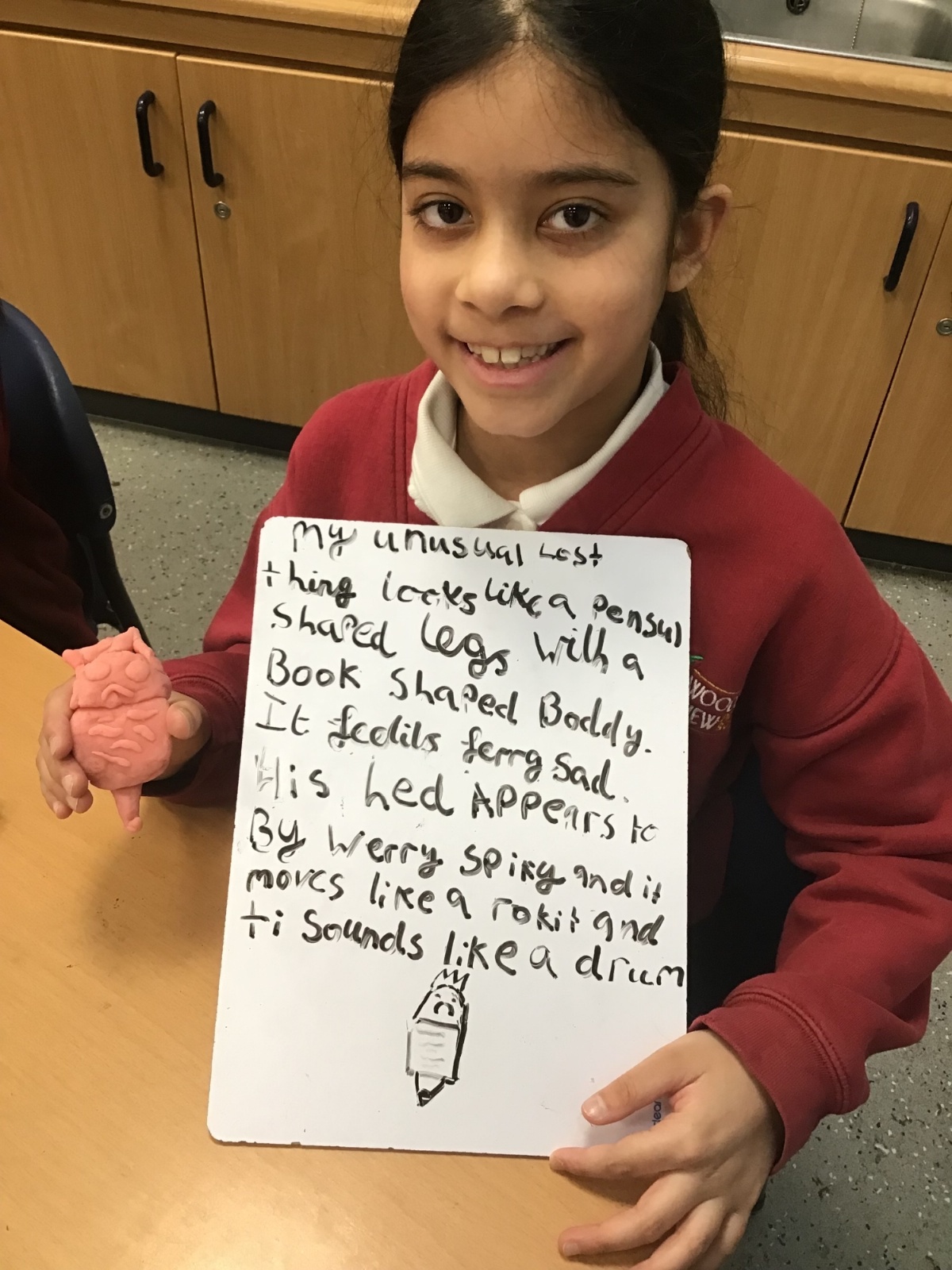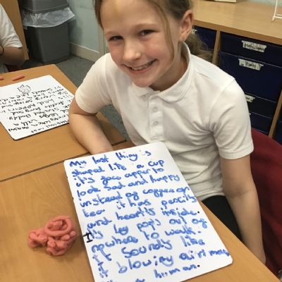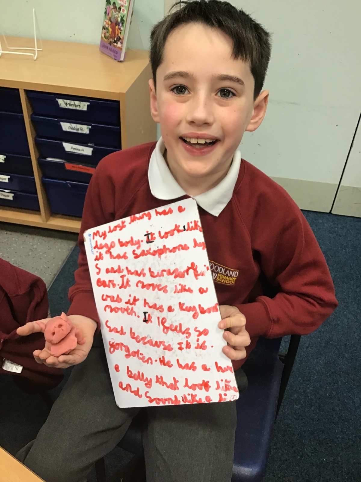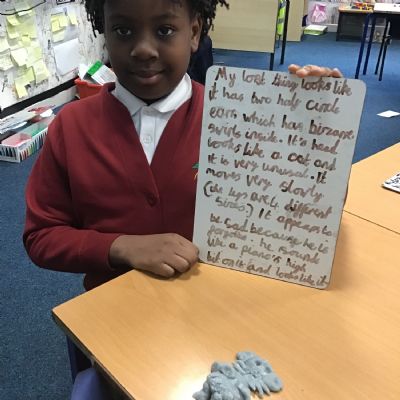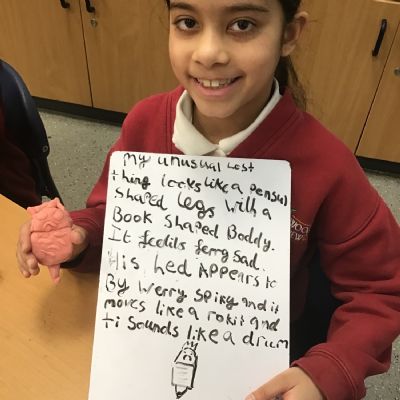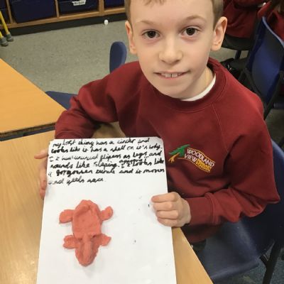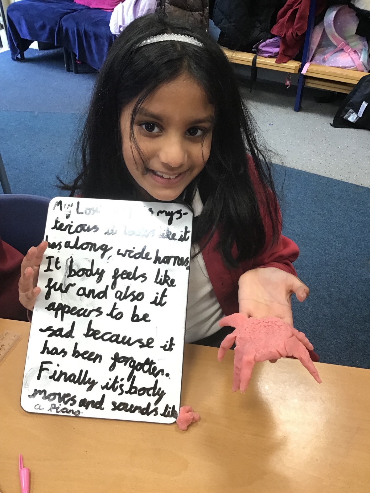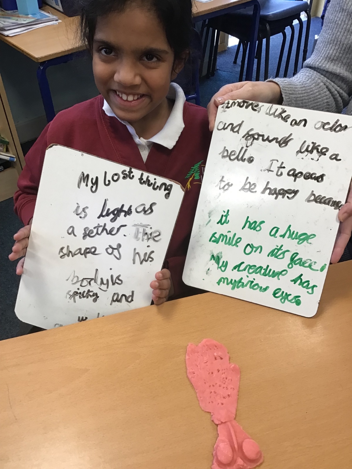 We have been using this term's class English book as a starting point to inspire us to create our own Lost Thing character. We recapped the story and looked at the different Lost Things in the book. Afterwards, we talked about the importance of detail when describing a character to give the reader a really clear picture of what the character is like both in appearance and personality. In Comprehension, we had to first read a description of a fictional character and draw what we thought it looked like based on the description. We then designed our own Lost Thing by writing a detailed description and using this, we were able to bring our character to life using playdoh.