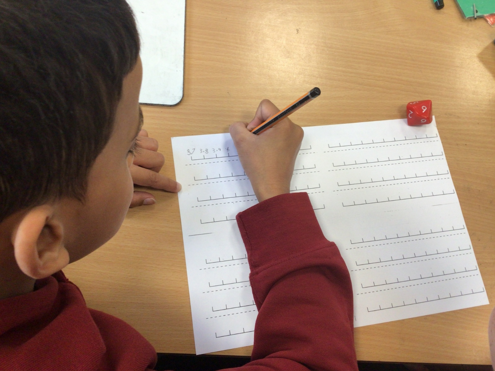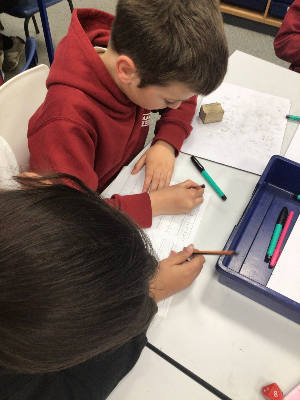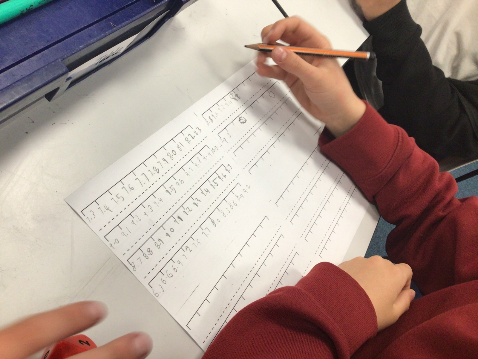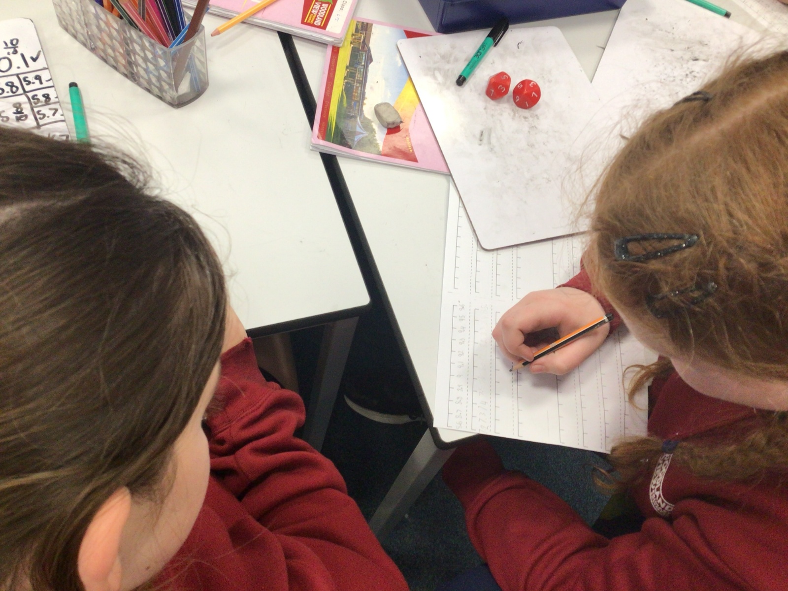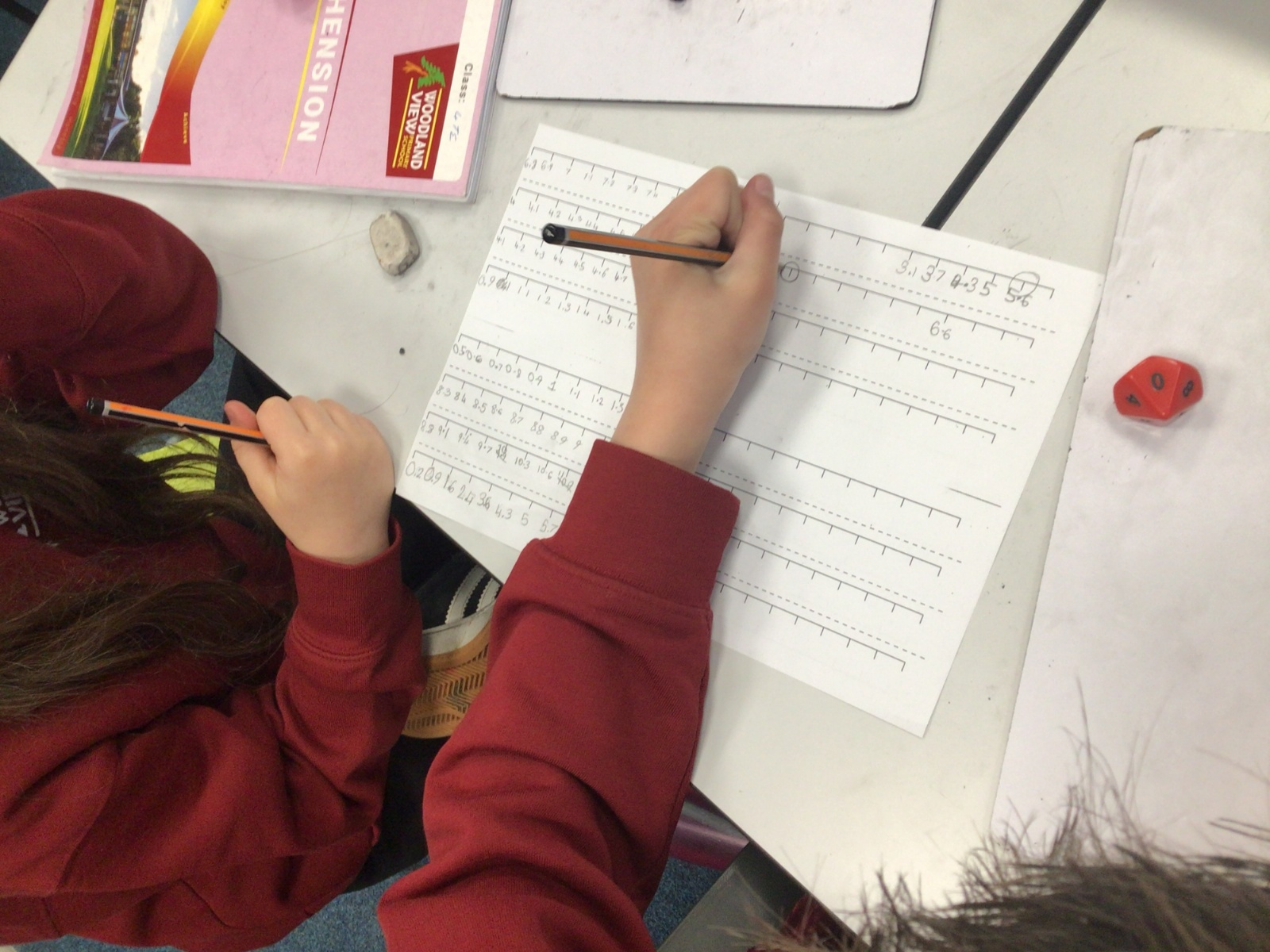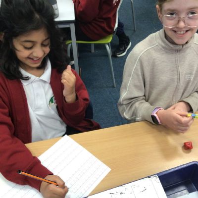 Today in Maths, we were positioning numbers with one decimal place on a number line. We worked in pairs. The first person rolled a die to create a number with one decimal place and wrote it on a marker on the blank number line. The second person then had to complete the number line, counting up and down in tenths. The children were amazing at this and were able to challenge each other by placing the number at different positions on the number line and suggesting that the number line went up in intervals that were greater than one tenth too. Some children were even able to relate this to our previous learning on improper fractions and mixed number fractions.