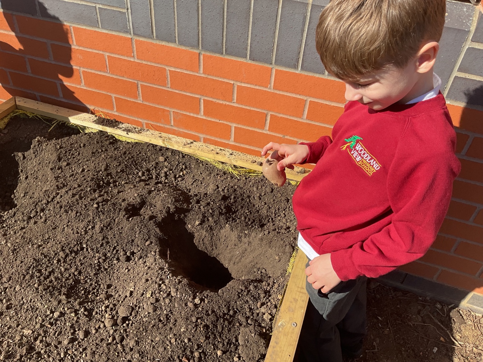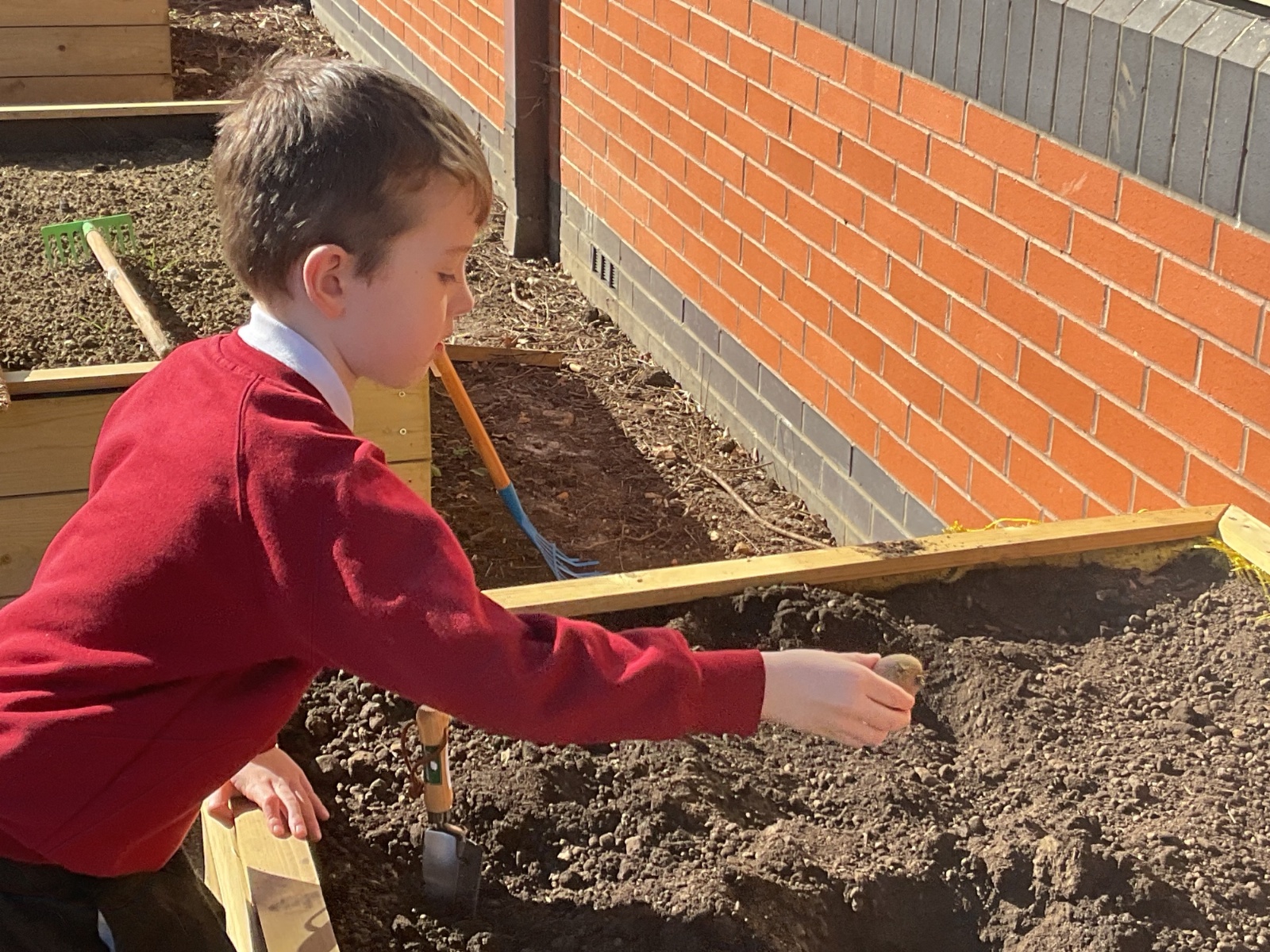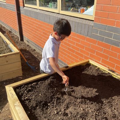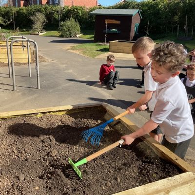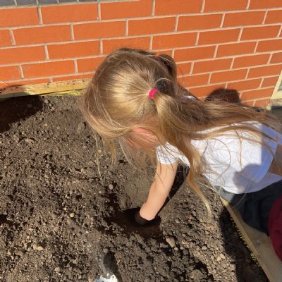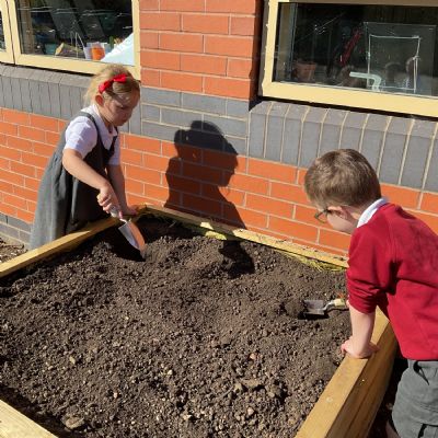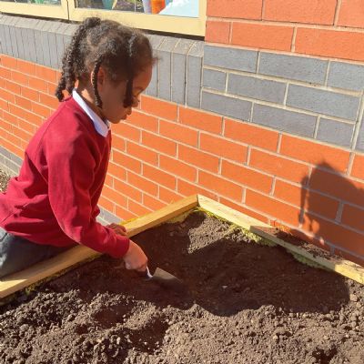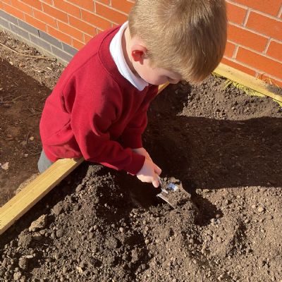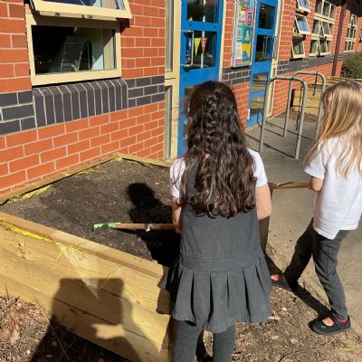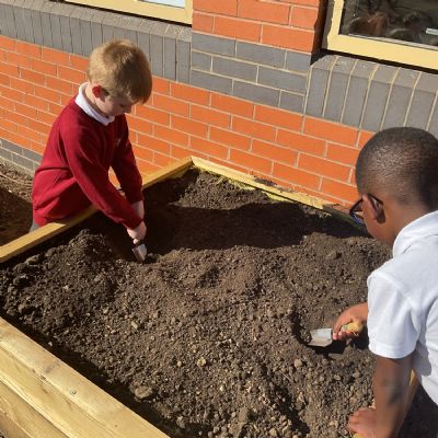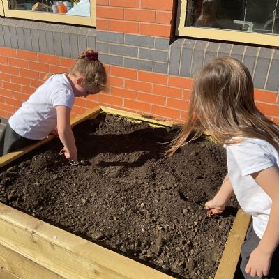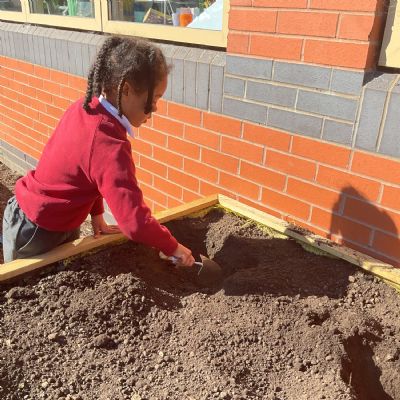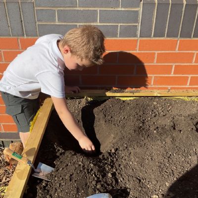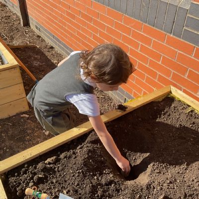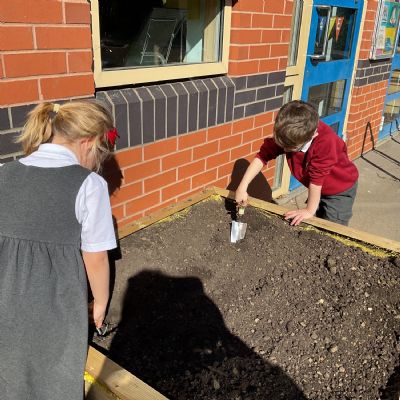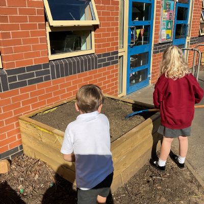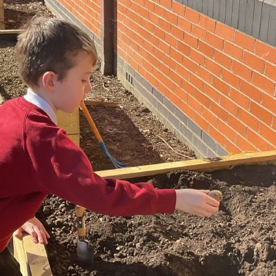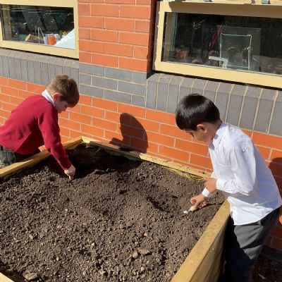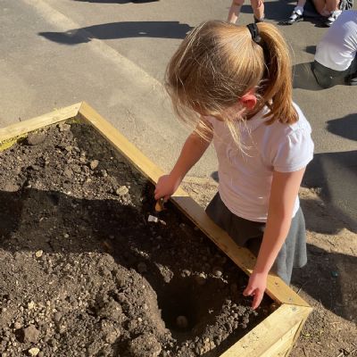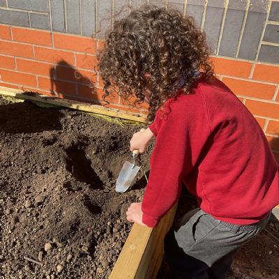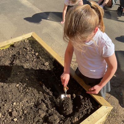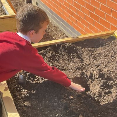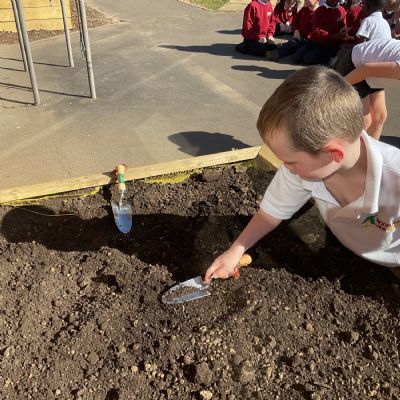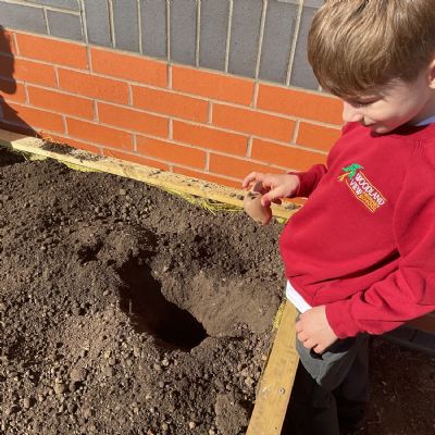 Great excitement ... we planted the first crops in our new allotment beds! The class dug over, weeded and prepared the bed before digging deep holes for each seed potato. We will keep an eye on them and hopefully have some delicious potatoes to try in the summer.