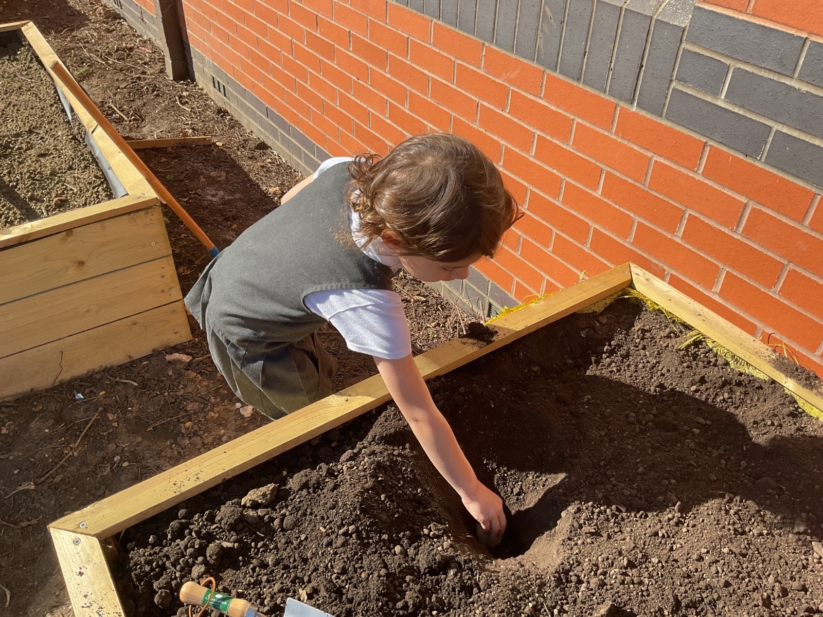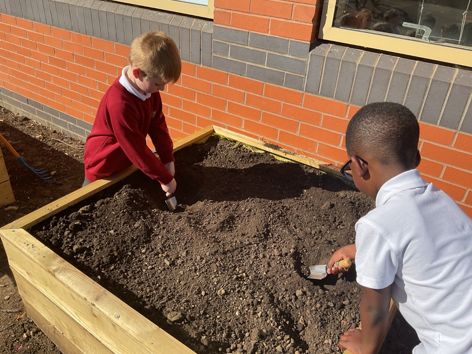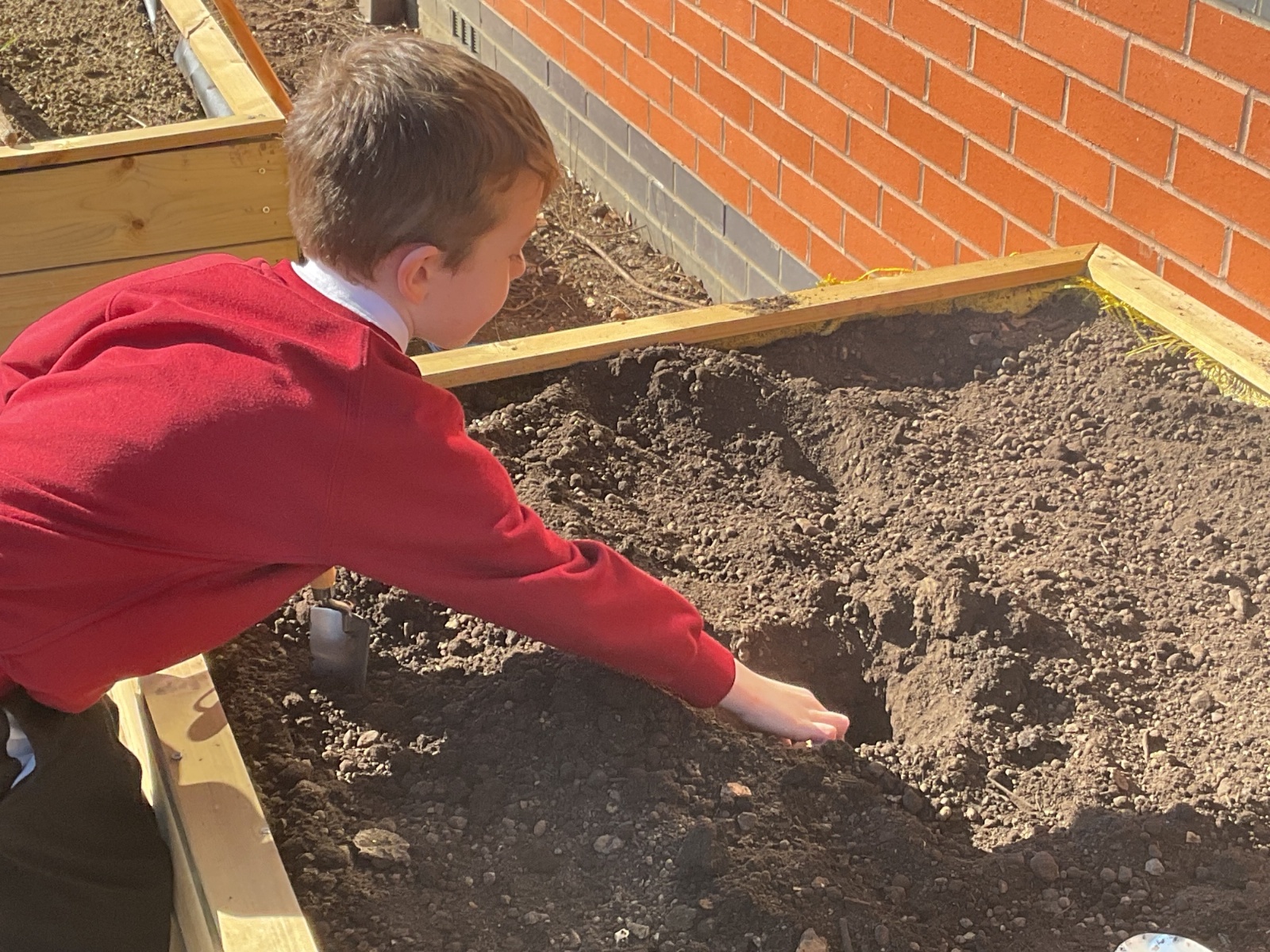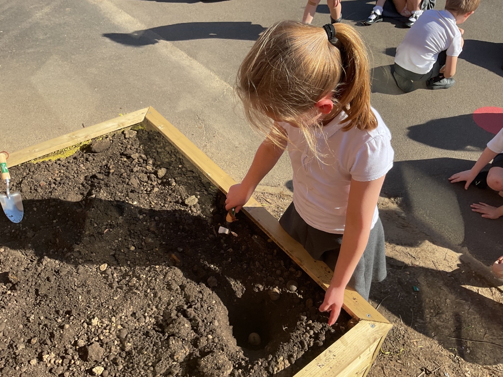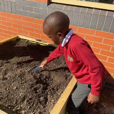 Great excitement ... we planted the first crops in our new allotment beds! The class dug over, weeded and prepared the bed before digging deep holes for each seed potato. We will keep an eye on them and hopefully have some delicious potatoes to try in the summer.