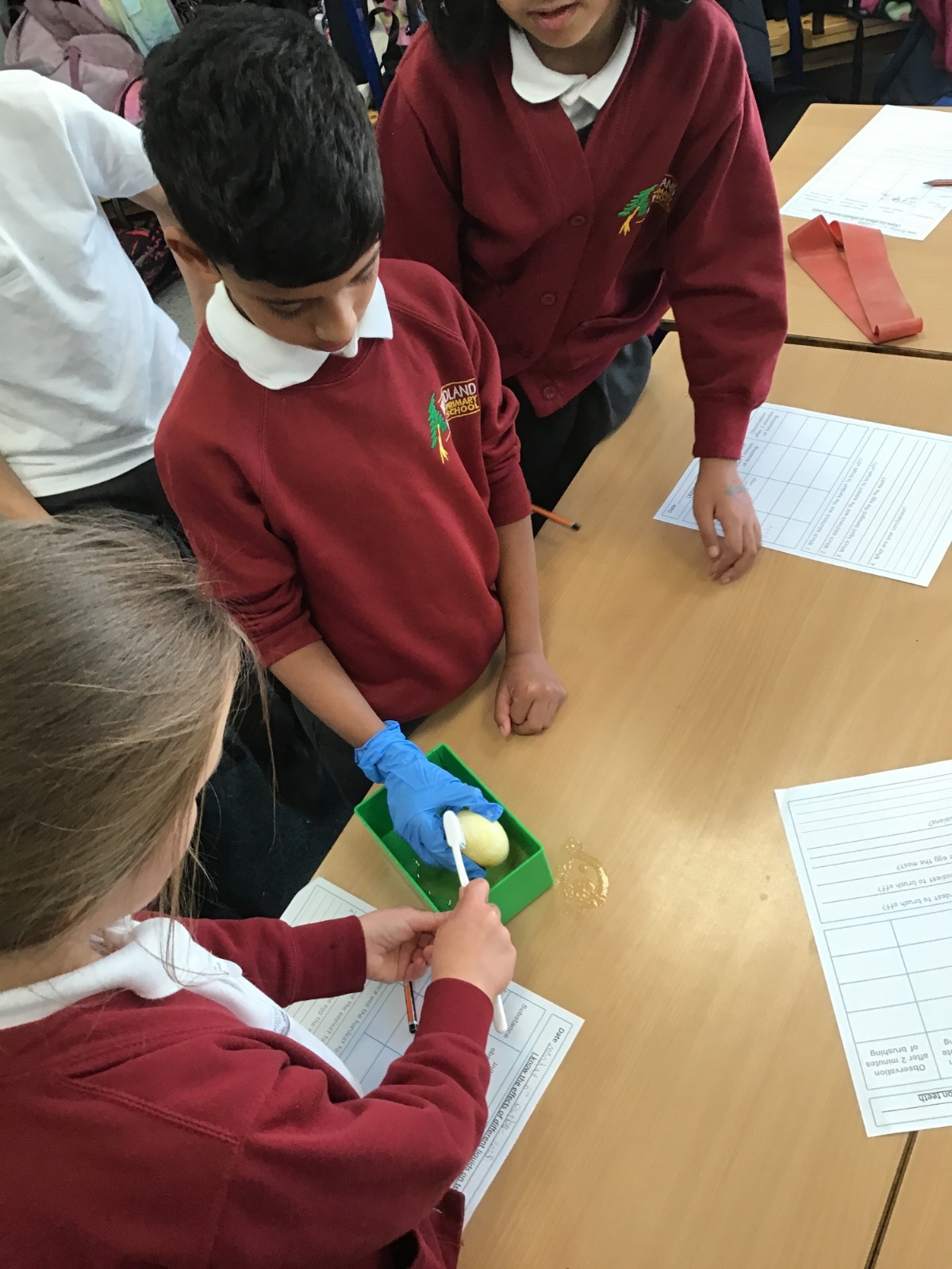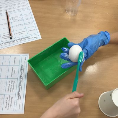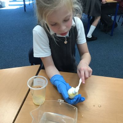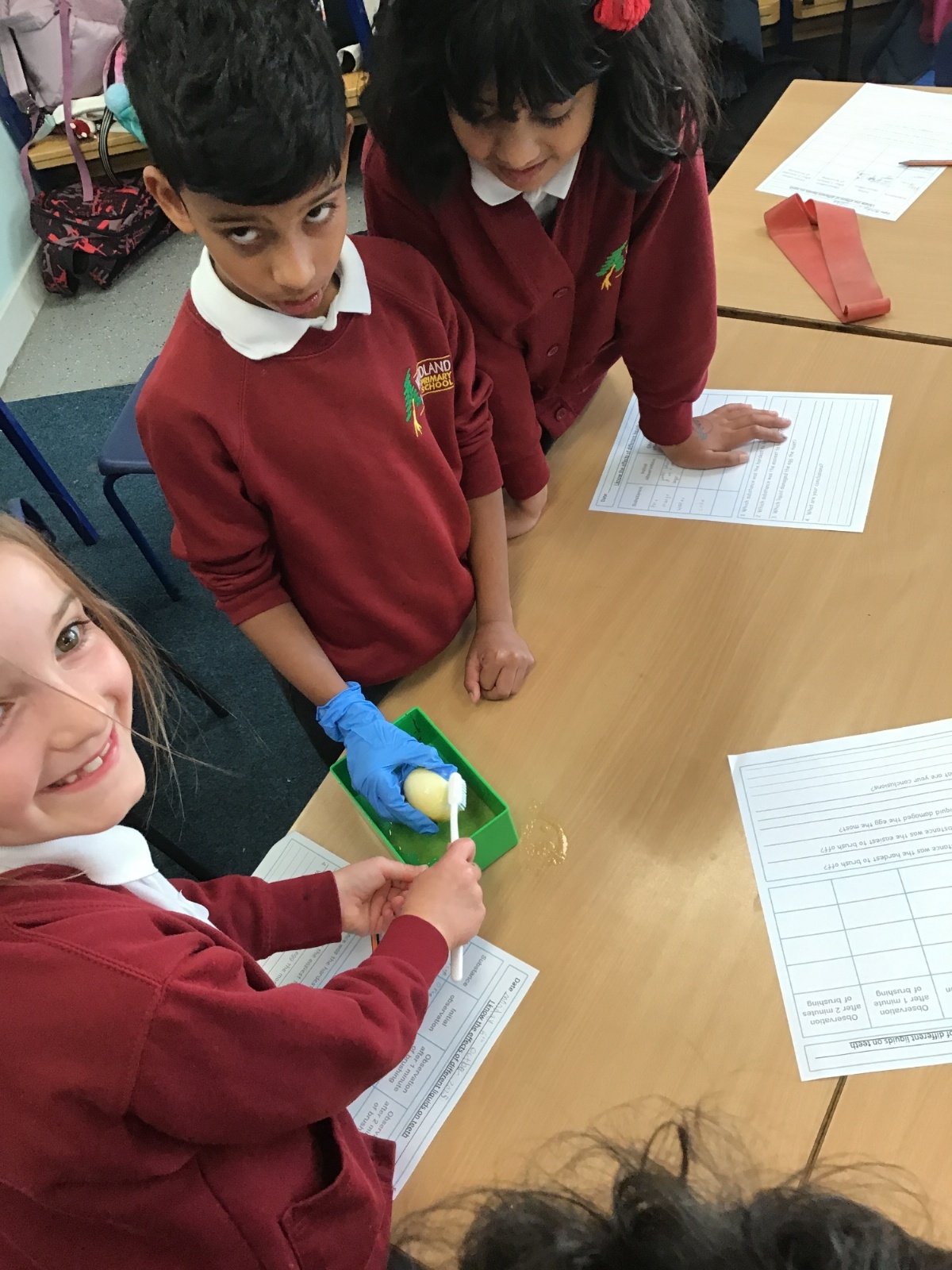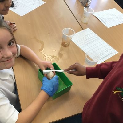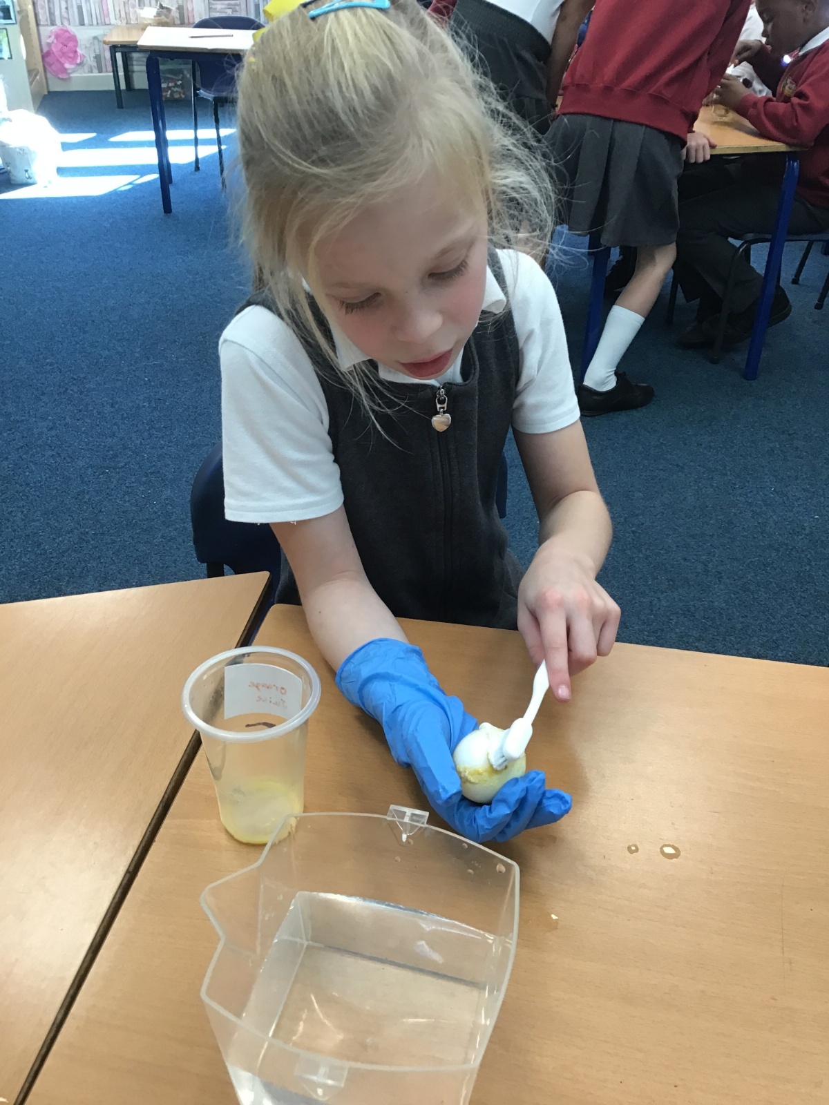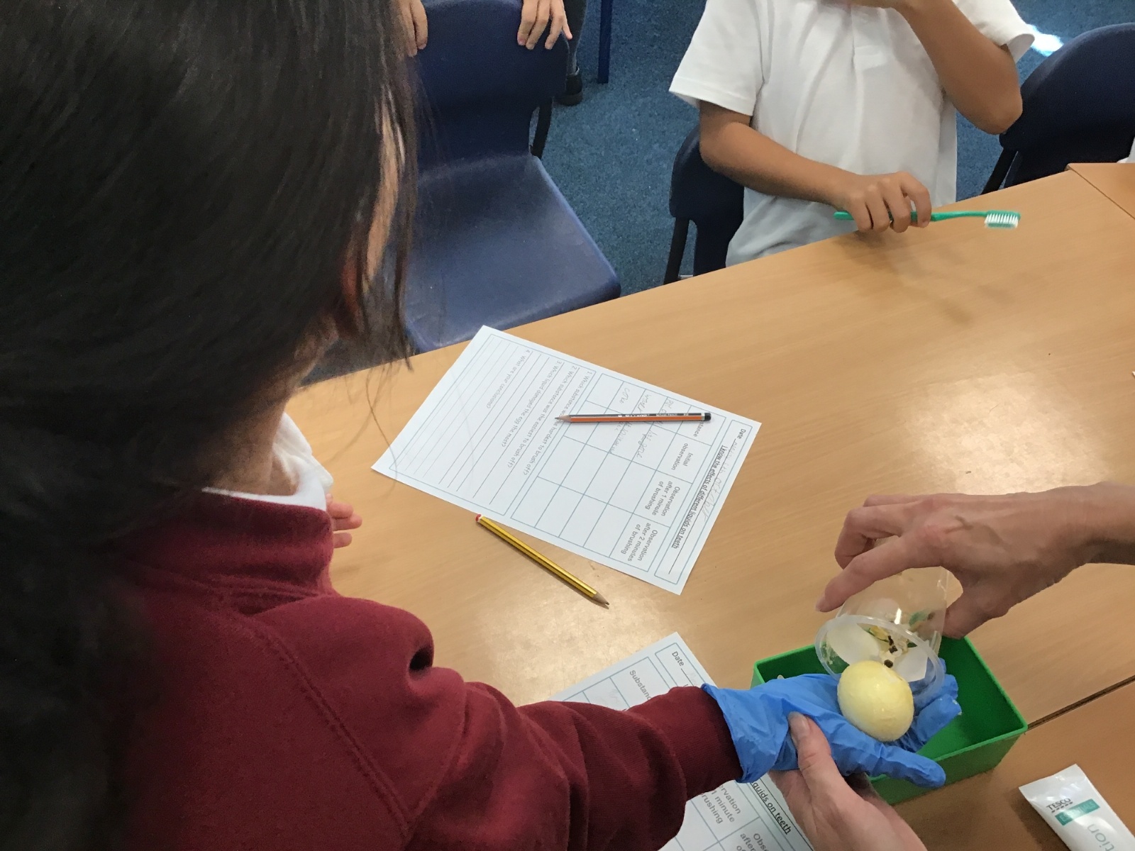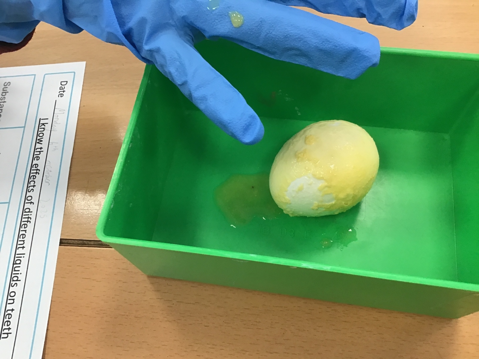Today we looked at the three eggs we had left on the windowsill in different substances last week. We left one egg in water, one in coke and one in pure orange juice. We made initial observations and then we tried to brush each of the eggs with toothpaste and a toothbrush. We were able to get rid of some of the staining by the orange and coke but the egg in the water had no staining on it. The orange juice not only stained the egg, but it also made the eggshell weaker. As eggshell is very similar to enamel, this shows us that sugary, acidic drinks can weaken the enamel of our teeth and that brushing is really important.