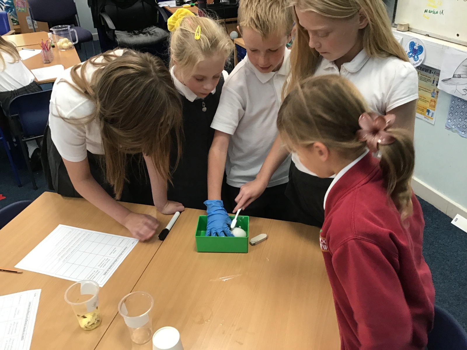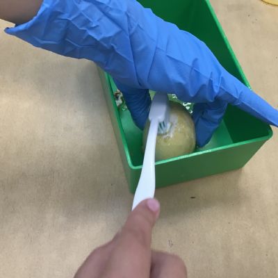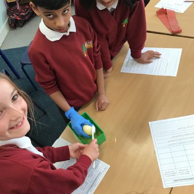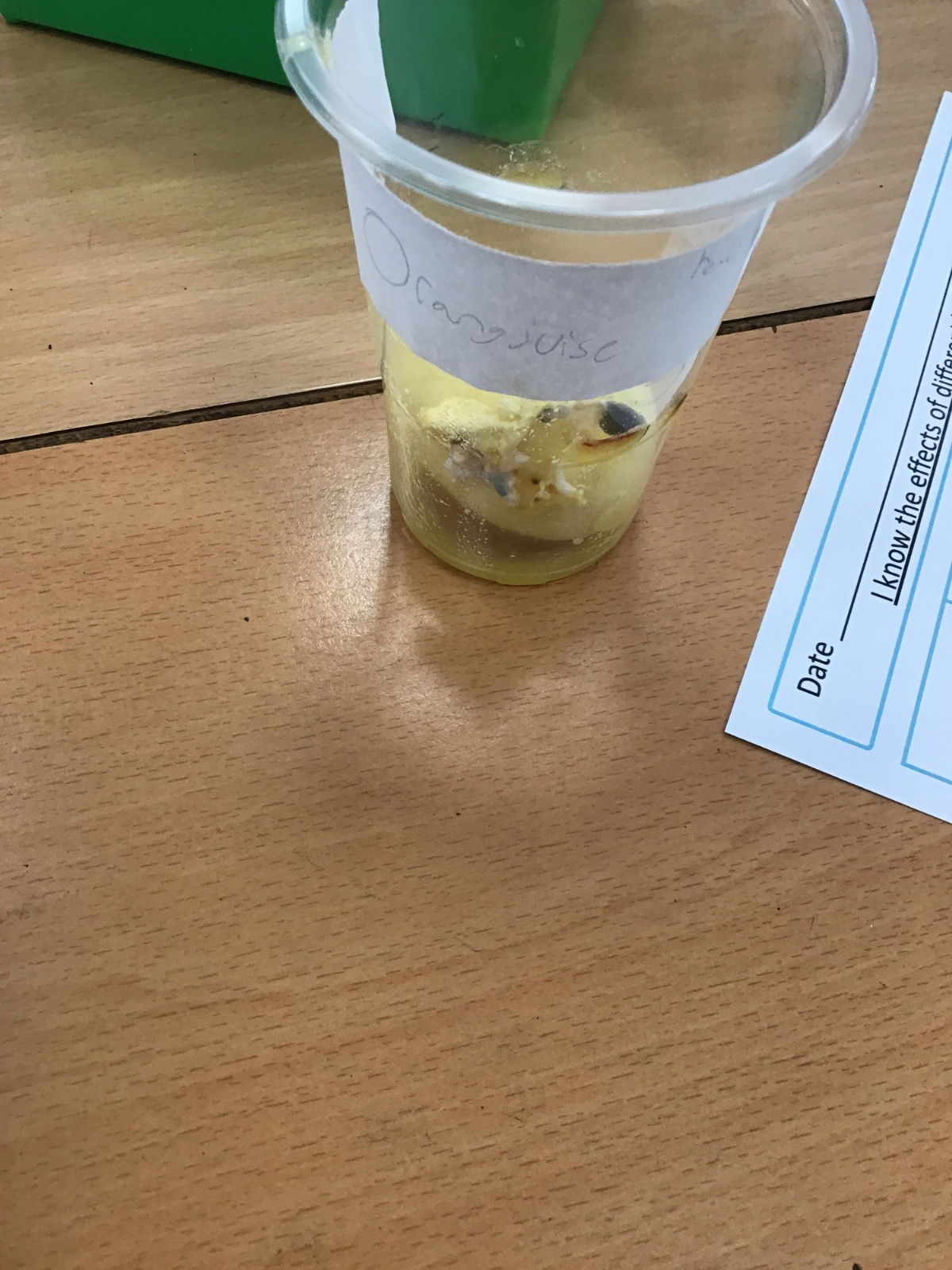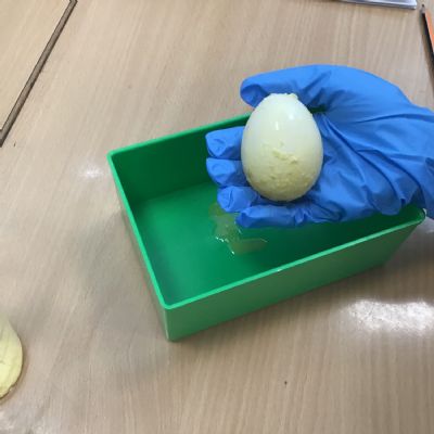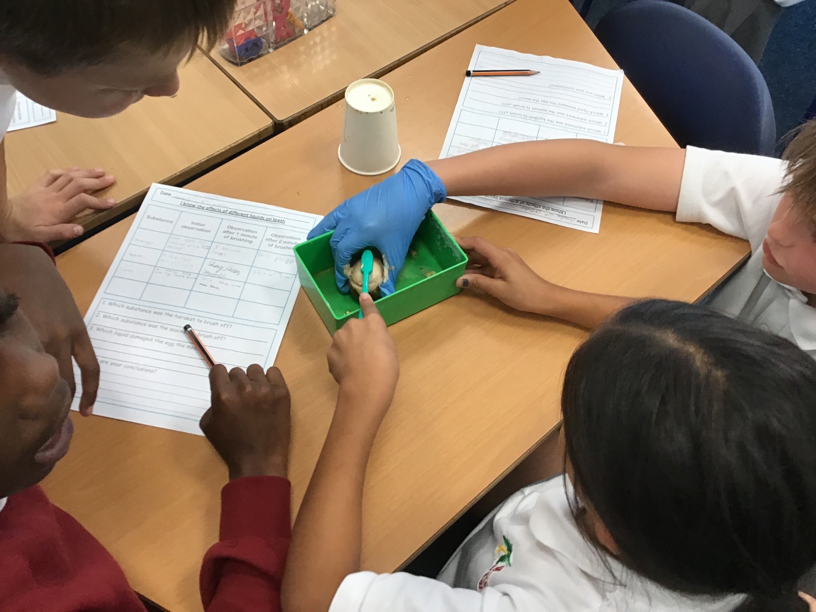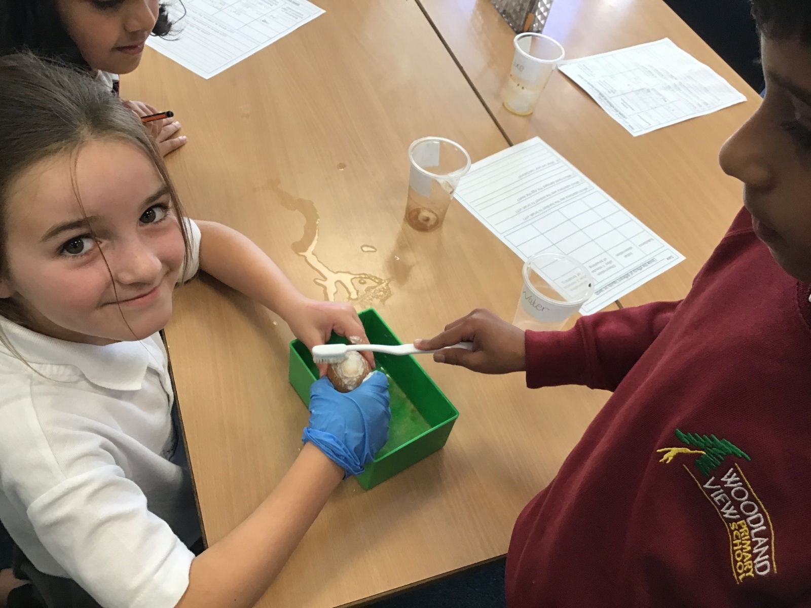 Today we looked at the three eggs we had left on the windowsill in different substances last week. We left one egg in water, one in coke and one in pure orange juice. We made initial observations and then we tried to brush each of the eggs with toothpaste and a toothbrush. We were able to get rid of some of the staining by the orange and coke but the egg in the water had no staining on it. The orange juice not only stained the egg, but it also made the eggshell weaker. As eggshell is very similar to enamel, this shows us that sugary, acidic drinks can weaken the enamel of our teeth and that brushing is really important.