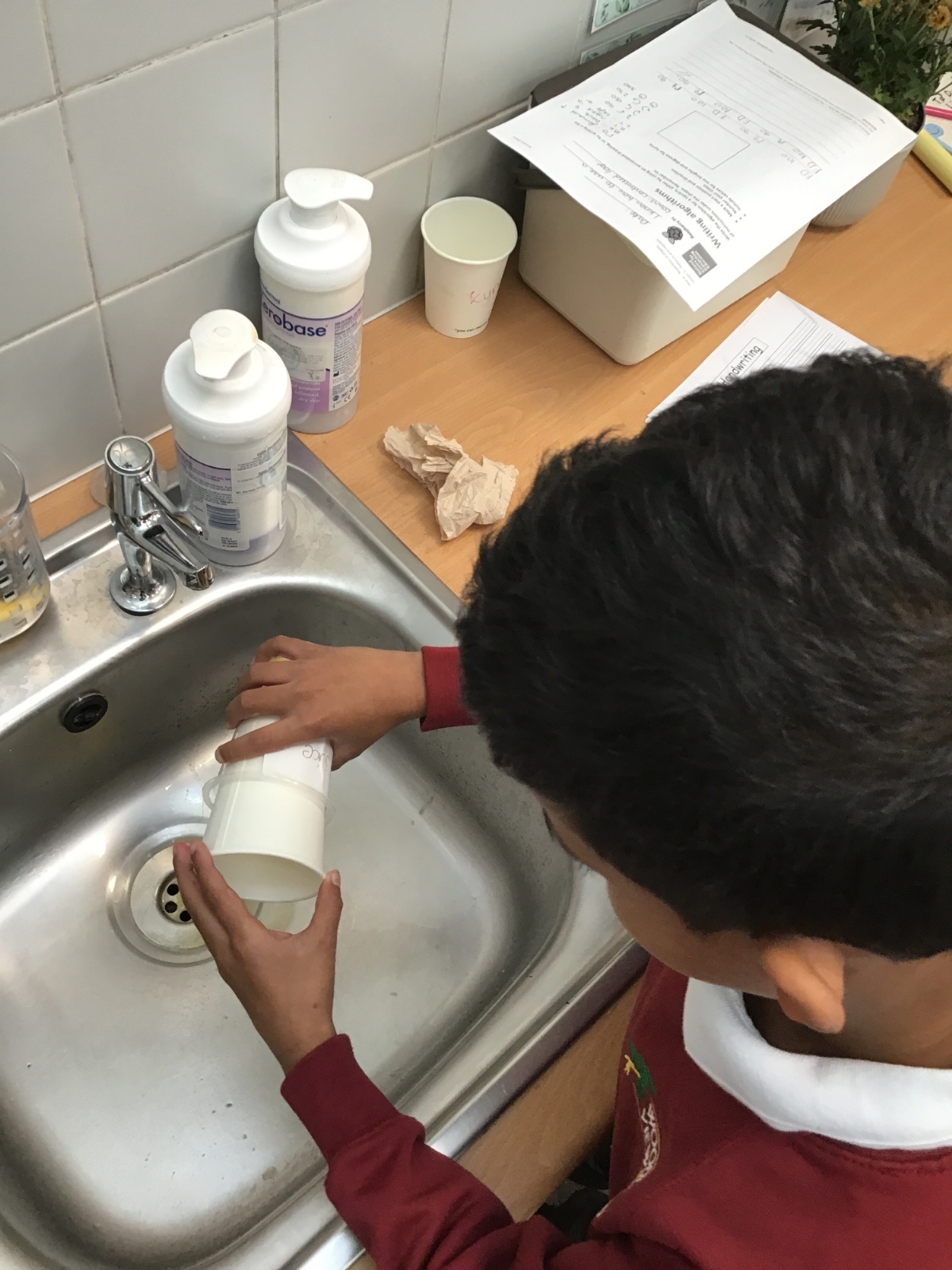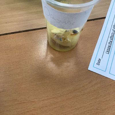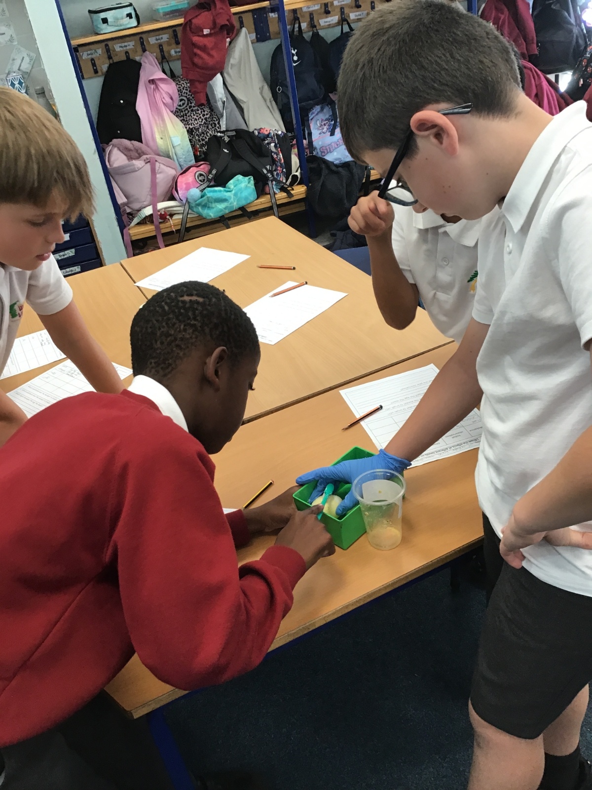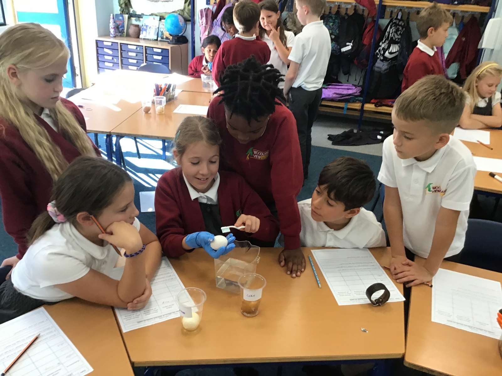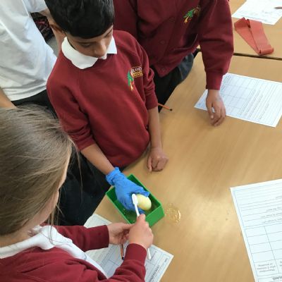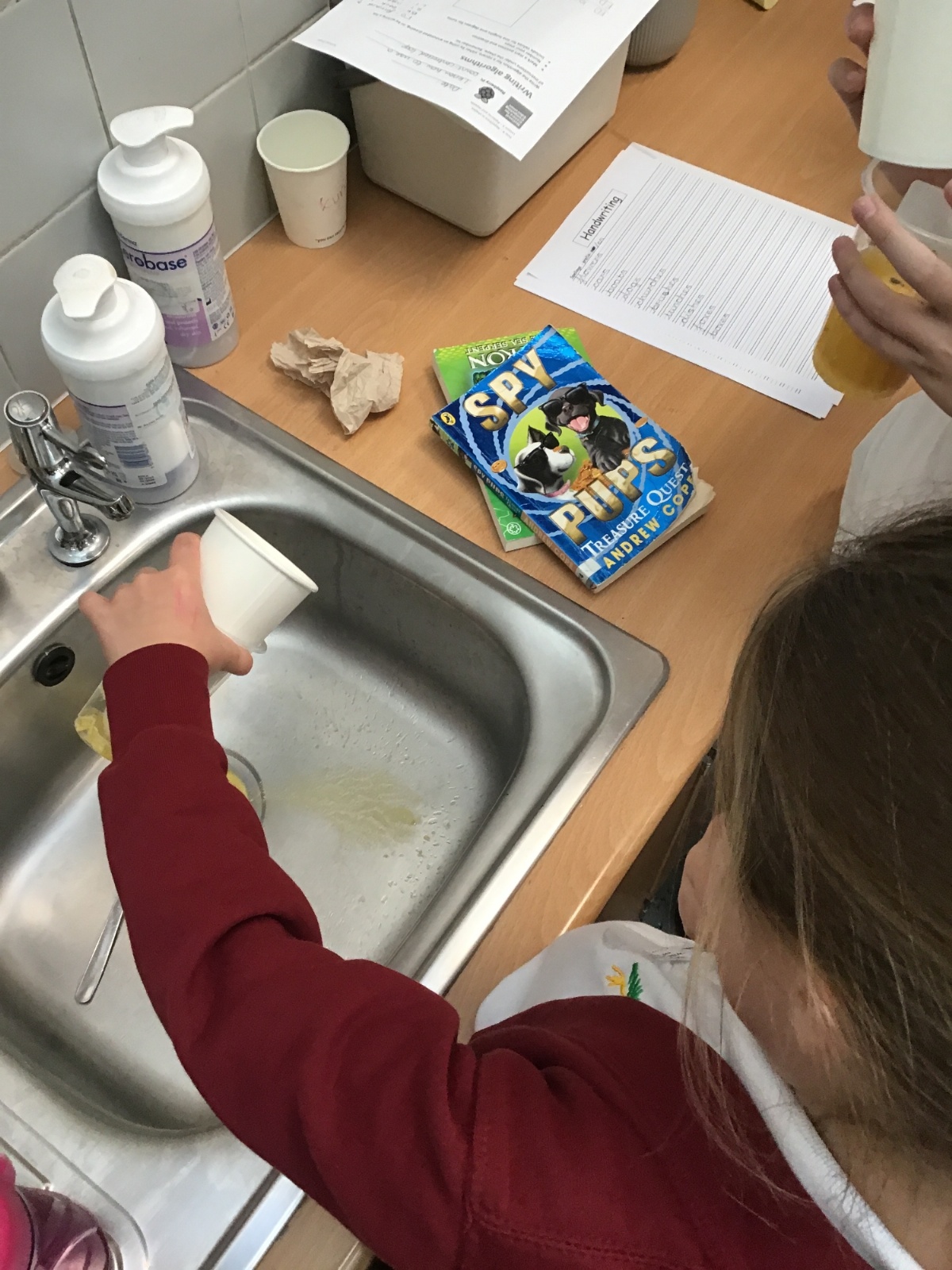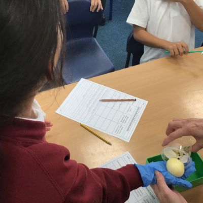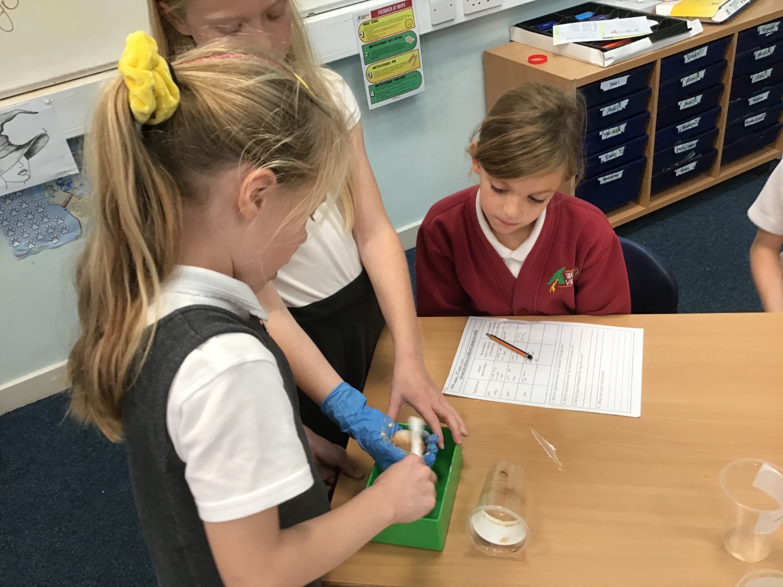 Today we looked at the three eggs we had left on the windowsill in different substances last week. We left one egg in water, one in coke and one in pure orange juice. We made initial observations and then we tried to brush each of the eggs with toothpaste and a toothbrush. We were able to get rid of some of the staining by the orange and coke but the egg in the water had no staining on it. The orange juice not only stained the egg, but it also made the eggshell weaker. As eggshell is very similar to enamel, this shows us that sugary, acidic drinks can weaken the enamel of our teeth and that brushing is really important.