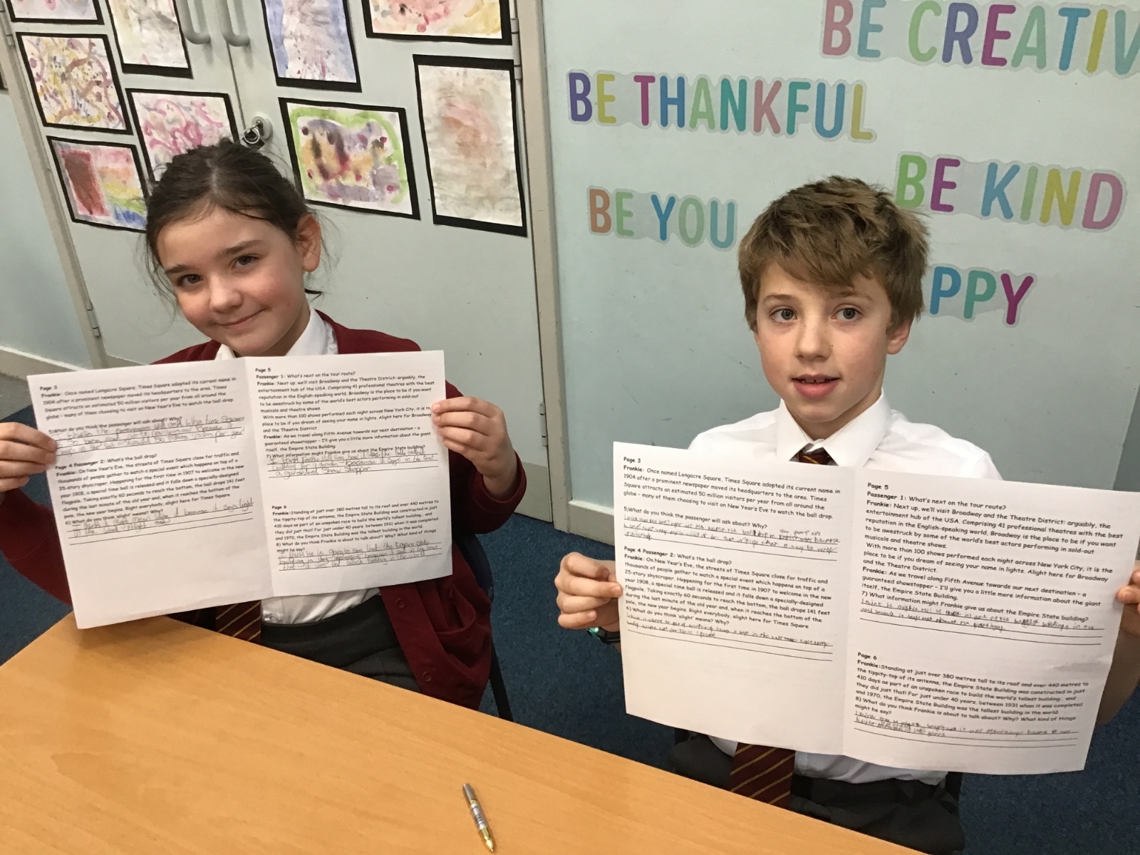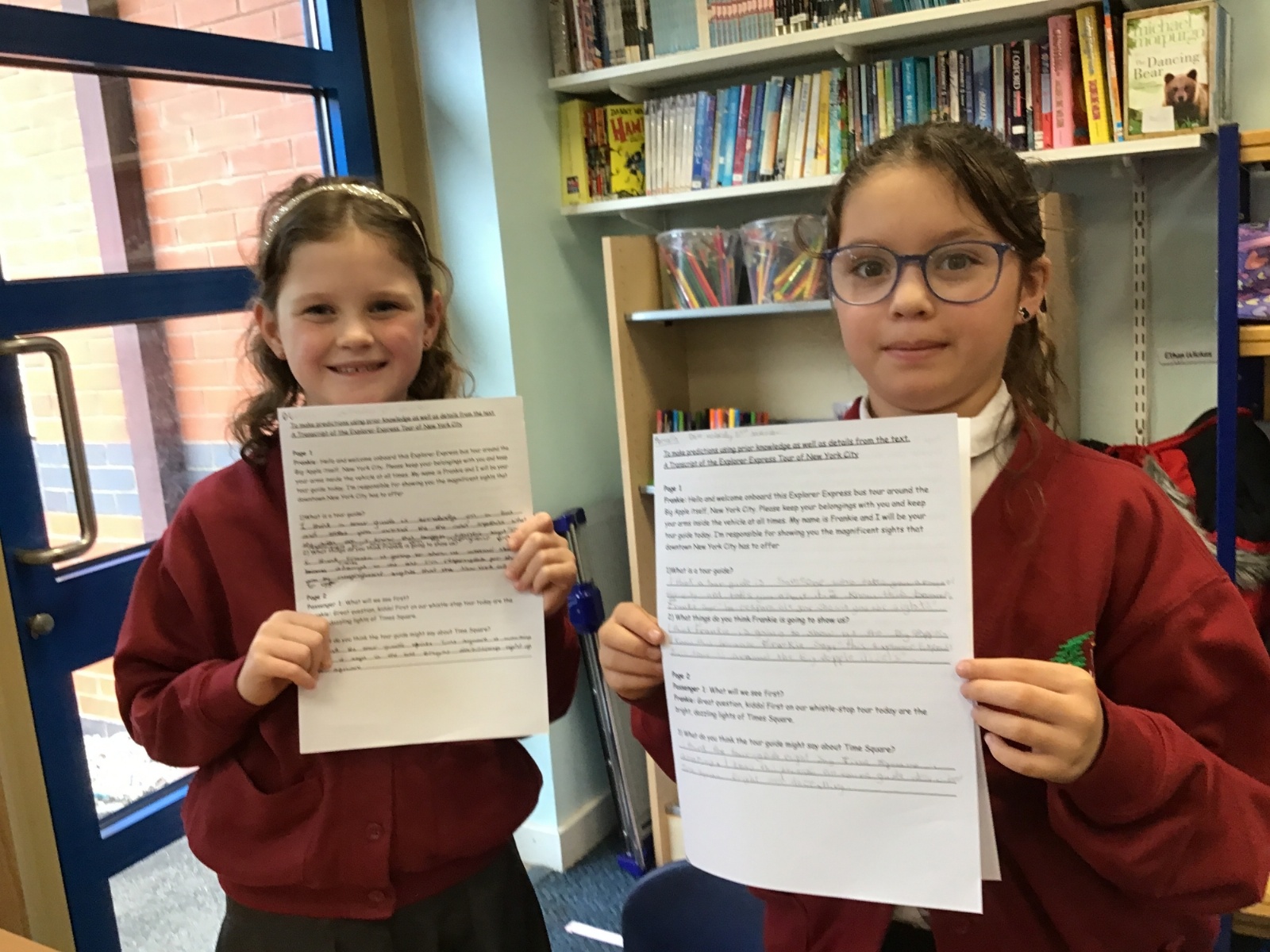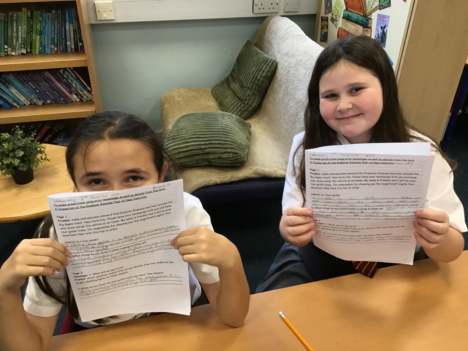 Today in comprehension, we made predictions and continued our work on the USA by looking in more depth at New York City. First, we learnt some facts about New York and the things that people go to see. We then read parts of a script from a tour guide in New York and after each section, we had to make predictions about what he would say next. We used the text to help us to make our predictions and used it as evidence to support our ideas but we also used our previous learning about the main attractions and the facts about them to justify our predictions.