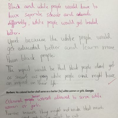 Today, we have learnt about the Jim Crow laws – these were laws which were in place in America for a very long time. We considered some of the laws, thought about how these would have been enforced, how it would have felt to be on the receiving end of these laws and the impact that these would have had.