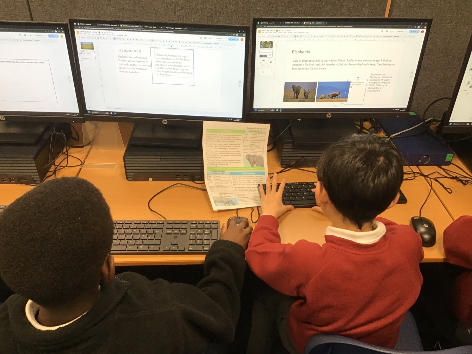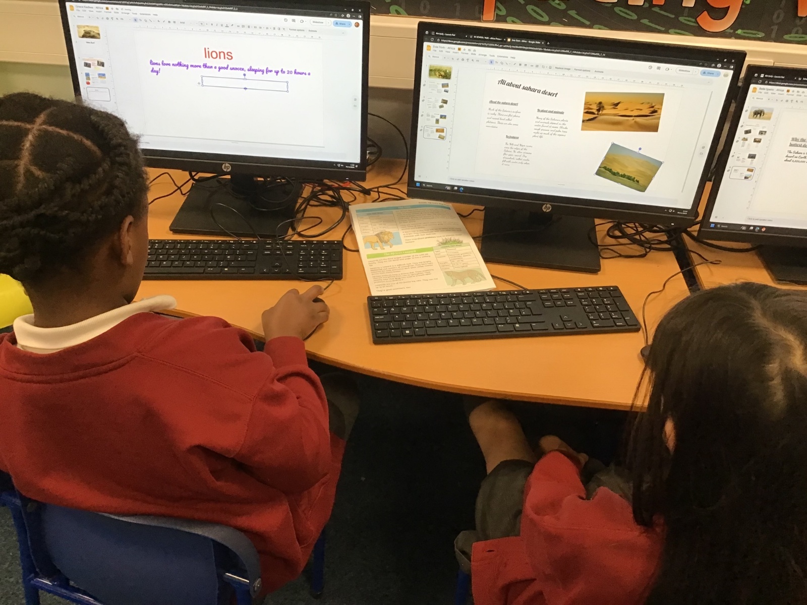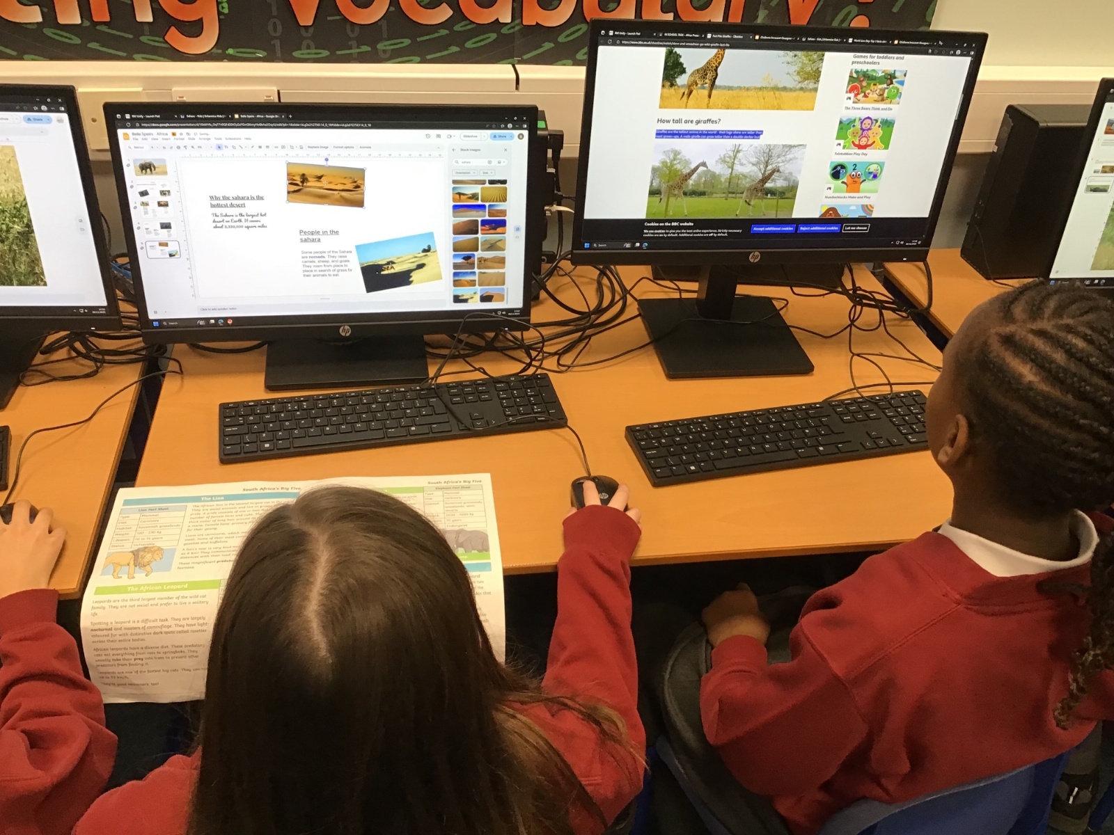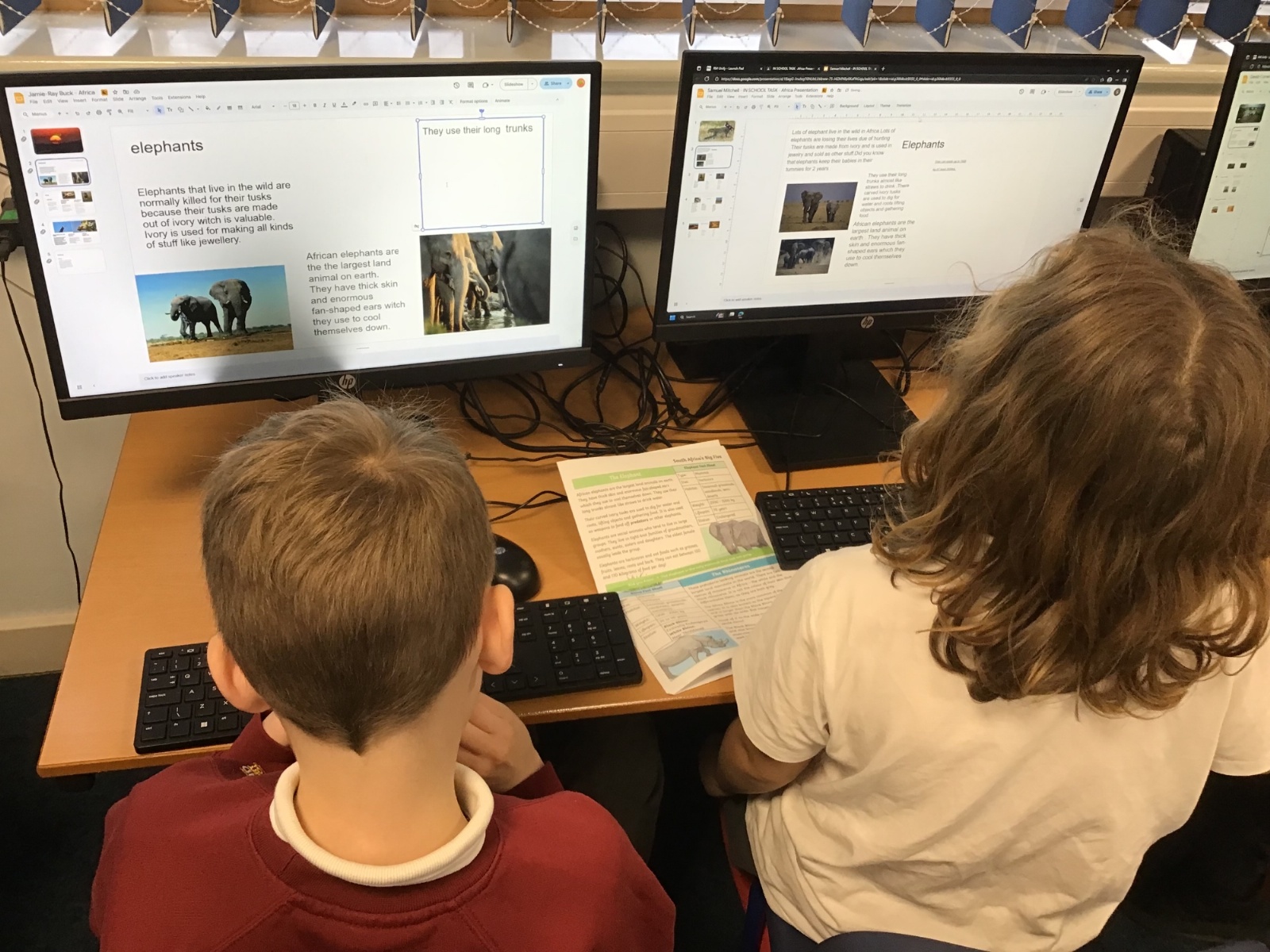 This week in Year 4, we are continuing our Digital Literacy unit. We are creating our own slideshow of information all about Africa. This follows on from our unit about 'The Hunter' which we have been reading in English and our new book which we will be starting in the next week or so which also has an African setting. In our Comprehension lesson this morning, we learned all about 'The Big Five' (five African animals) and used this information in Computing to add detail to the information we had started to collate. Our Computing skills are really improving, well done to us!